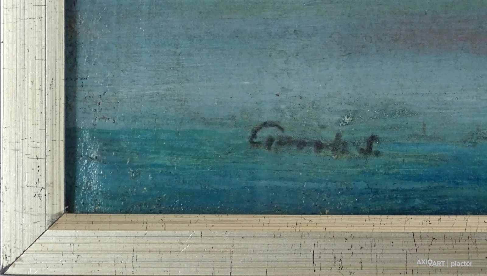 Olaj vászon festmény, üveglap mögött, ezüst keretben.