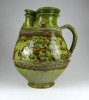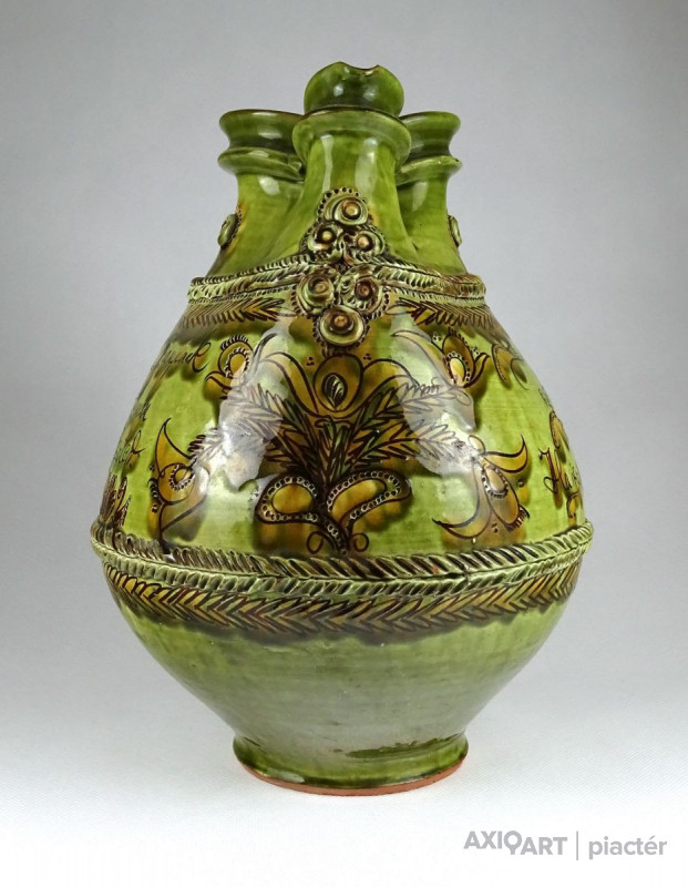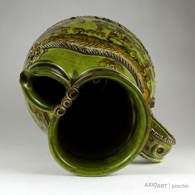 Szép állapotú, megrendelésre készített, egyedi, nagy méretű, népi motívumokkal díszített, jelzett, mezőtúri mázas kerámia kancsó. Céhkancsó forma!