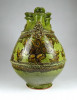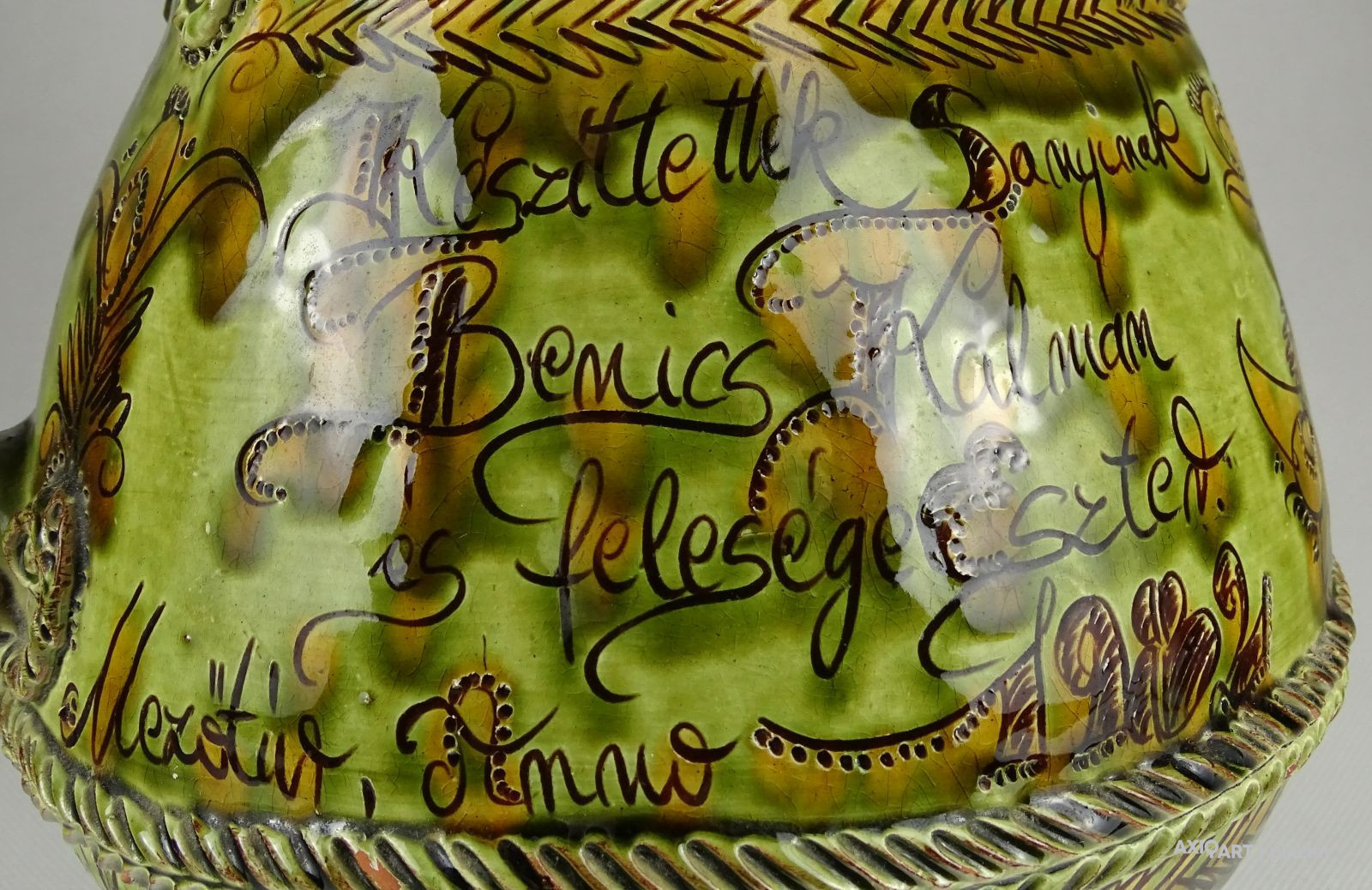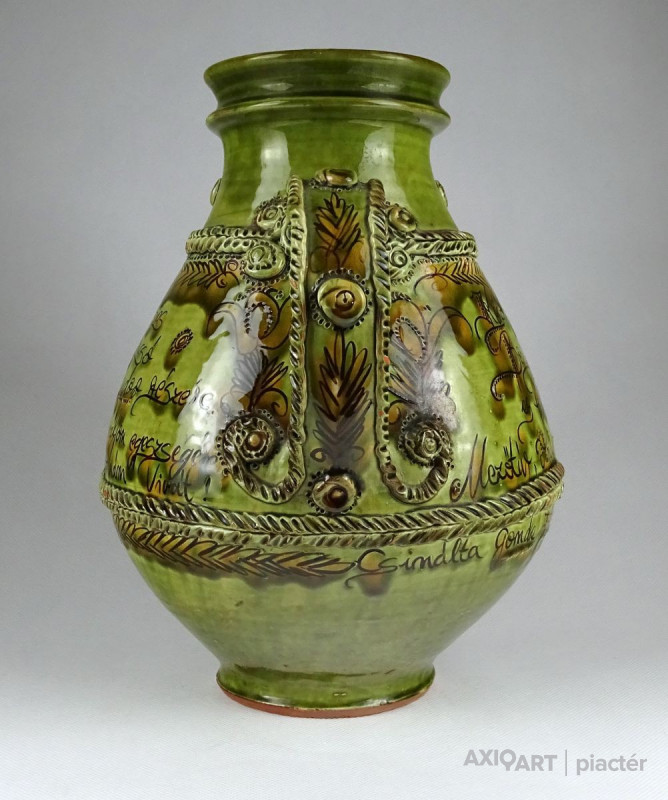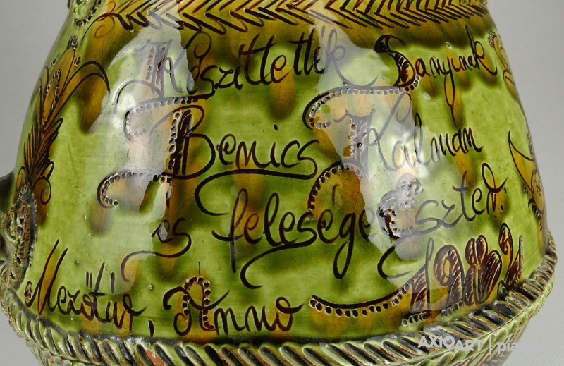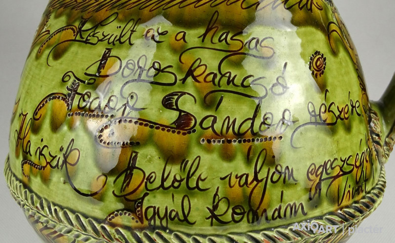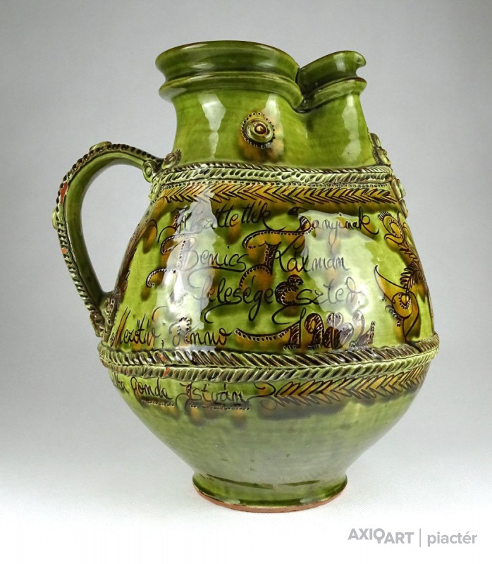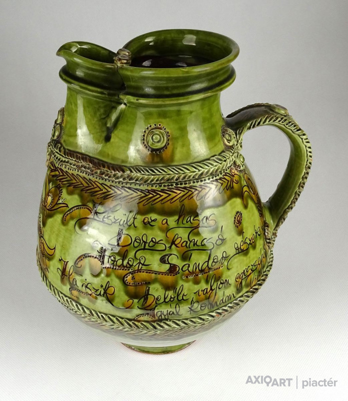 [1I296/X125] Szép állapotú, megrendelésre készített, egyedi, nagy méretű, népi motívumokkal díszített, jelzett, mezőtúri mázas kerámia kancsó. Céhkancsó forma! Oldalán felirat: KÉSZÜLT EZ A HASAS BOROS KANCSÓ FODOR SÁNDOR RÉSZÉRE HA ISZIK BELŐLE VÁLJON EGÉSZSÉGÉRE IGYÁL KOMÁM! ... KÉSZÍTTETTÉK SANYINAK BENICS KÁLMÁN ÉS FELESÉGE ESZTER MEZŐTÚR, ANNO 1982 CSINÁLTA GONDA ISTVÁN Magasság: 30 cm Szélesség: 26 cm Súly: 2.053 kg Gonda István a Népművészet Mestere, a hazai fazekas szakma Atyamestere. Jellemzője a kivételes forma-és arányérzék, a kiemelkedően magas színvonalú korongos tudás és a hagyományos népi cserépedény- készítésen alapuló szín-és díszítményvilág.   Forrás: http://www.museum.hu/
