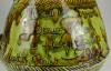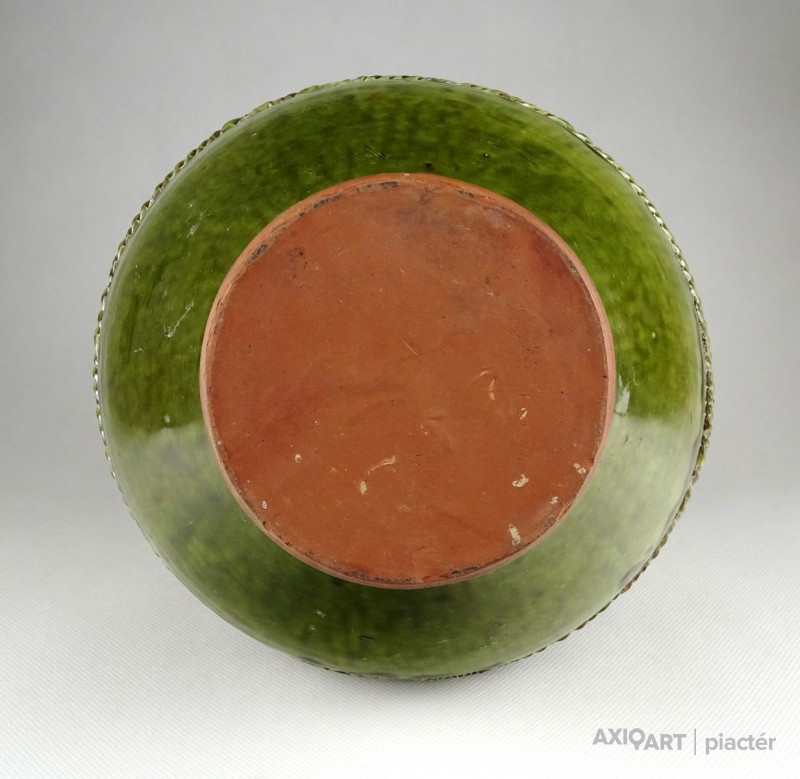 [1S294/Z059] Jelzett Kis Roóz Ilona kerámia figura. Felső peremén néhány kisebb elfestett lepattanás található, lásd fotó. Alján jelzés: KISS ROÓZ Magasság: 12.5 cm Szélesség: 11 cm Súly: 0.485 kg Kiss Roóz Ilona keramikus Születési hely: Szatmárnémeti [Satu Mare, RO] Születési dátum: 1920 Kiállítások az adatbázisban:  Kiss Roóz Ilona életműkiállítása Mesterei: Orbán Antal, Ohmann Béla. 1939-43: Iparművészeti Iskola, mesterei: Orbán Antal, Ohmann Béla. 1956, 1962: Munkácsy-díj; 1980: érdemes művész; 1984: SZOT-díj; 1994: MSZOSZ díja; 1995: Magyar Köztársasági Érdemrend Középkeresztje. A magyar kerámia Kovács Margit által teremtett naiv-népies irányzatának jeles művelője. Edényeit, kisplasztikáit, ill. murális alkotásait vidám színvilág és kedves humor jellemzi. 1948 és 1952 között tanított az Iparművészeti Főiskolán, azóta szabadfoglalkozású. Egyéni kiállítások 1964 ? Katona József Múzeum, Kecskemét 1973 ? Derkovits Galéria, Szombathely 1977 ? Csepel Vas és Fémművek, Budapest 1981 ? Kaesz Gyula Szakmunkásképző Intézet, Budapest 1983 ? Nógrádi Sándor Múzeum, Salgótarján 1987 ? Petőfi Művelődési Ház, Tiszaluc 1994 ? Petőfi Művelődési Ház, Tiszaluc 1995 ? Csók Galéria, Budapest [Pannonhalmi Zsuzsával és Sarkantyu Judittal] Válogatott csoportos kiállítások 1952 ? Iparművészeti kiállítás, Ernst Múzeum, Budapest IV. Országos Iparművészeti Kiállítás, Műcsarnok, Budapest Országos Iparművészeti Kiállítás, Műcsarnok, Budapest I., II. Országos Kerámia Biennálé, Pécs Magyar kerámia, Ankara, Isztambul XX. századi magyar keramikusok, Iparművészeti Múzeum, Budapest ? Az agyag mesterei, Vigadó Galéria, Budapest Őszi Kerámia Kiállítás, Olaf Palme Ház, Budapest Művek közgyűjteményekben Déri Múzeum, Debrecen ? Iparművészeti Múzeum, Budapest ? Janus Pannonius Múzeum, Pécs ? Kispréposti Palota, önálló gyűjtemény, Eger. Köztéri művei kerámia dombormű (1958, Pereces, bölcsőde) kerámia napóra (1959, Székesfehérvár, Béke téri iskola) csempeburkolat (1961, Szeged, rendelőintézet) falikép (kerámia, 1962, Sopron, Gyermekszanatórium) kerámia falikép (1966, Békéscsaba, bölcsőde) Irodalom GÁL J.: ~ 77 éves. Beszélgetés a művésszel, Magyar Iparművészet, 1997/4. KESZTHELYI K.-LACZKÓ I.: A magyar kerámiaművészet I., Alkotók, adatok 1945-1998, Budapest, 1999. Vadas József + MAOE Forrás: artportal