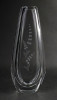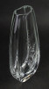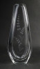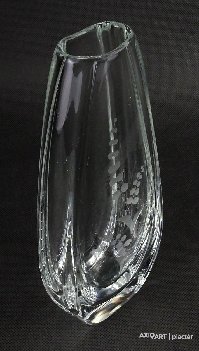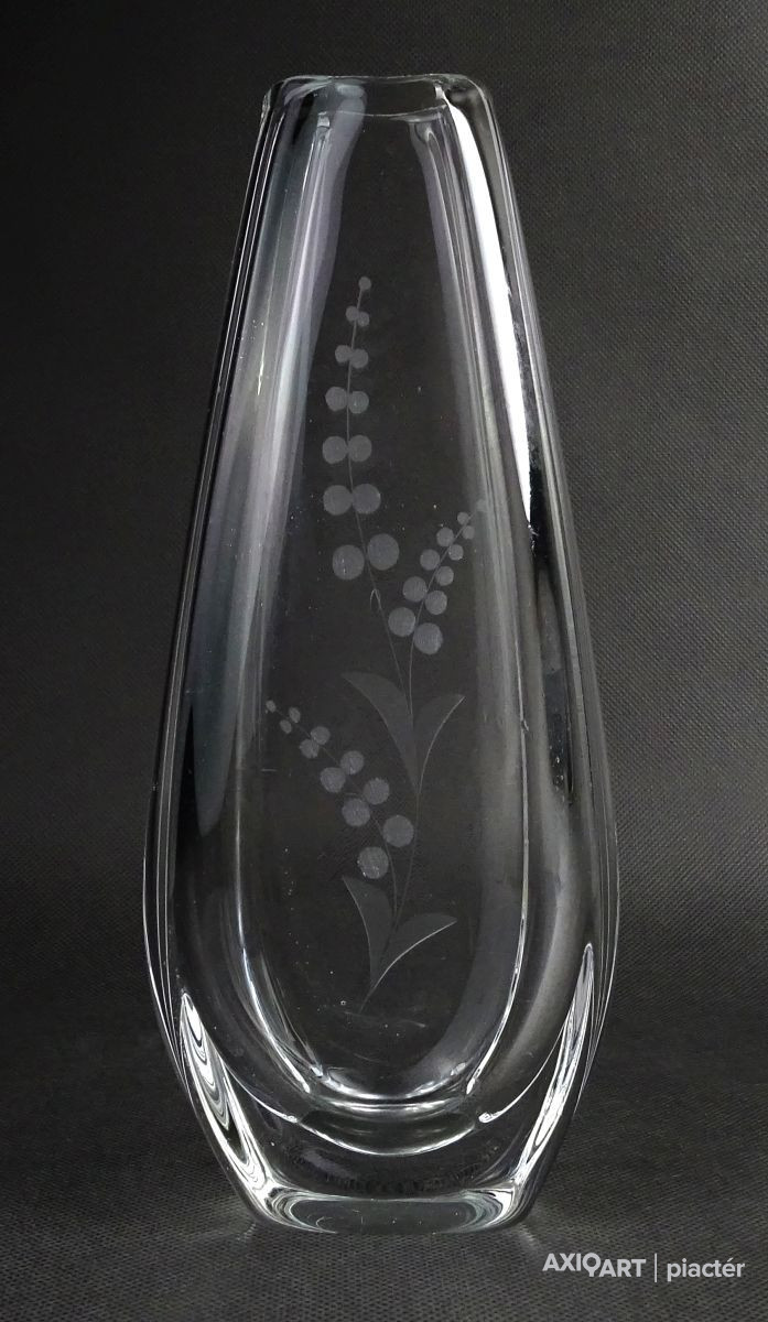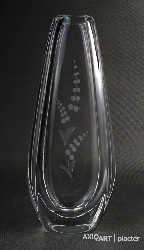 [1O235/Z052] Hibátlan állapotú, csiszolt gyöngyvirág motívummal díszített üveg váza, vastagfalú lapos fúvott üveg váza, virágváza. Magasság: 25 cm Szélesség: 10 cm Súly: 0.93 kg