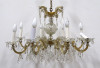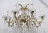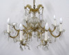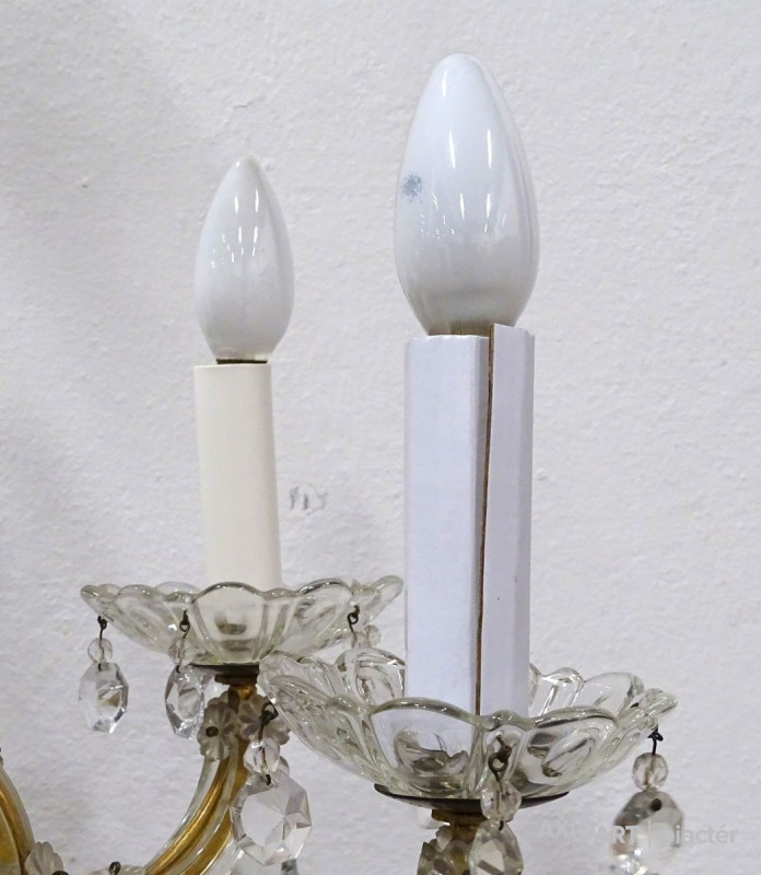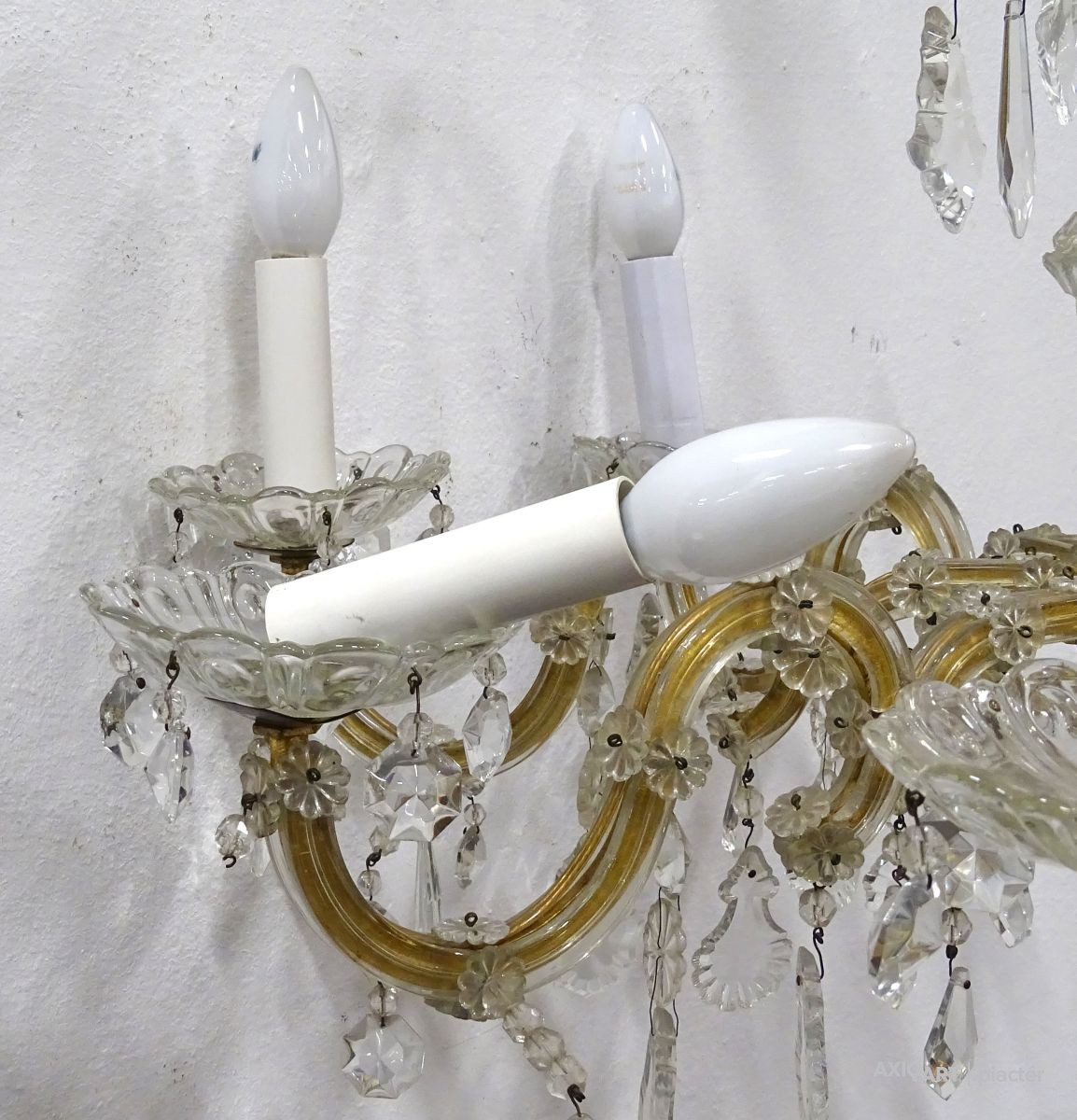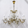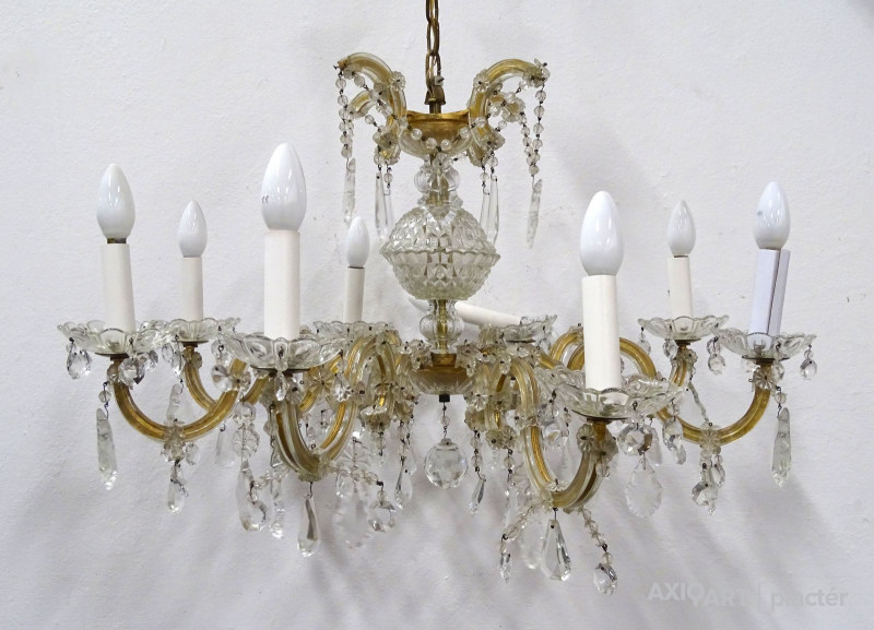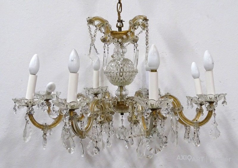 Szép állapotú nyolc égős kristálycsillár, több száz csiszolt üveg függővel díszített darab. Az egyik gyertyacsonk házilag kartonnal pótolt, egy másik megerősítésre szorul.