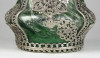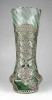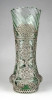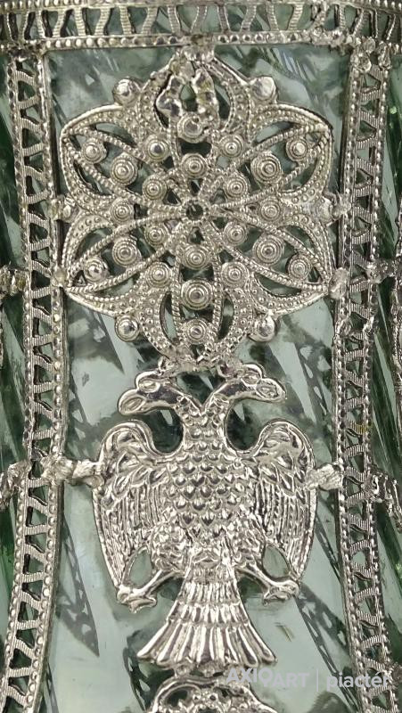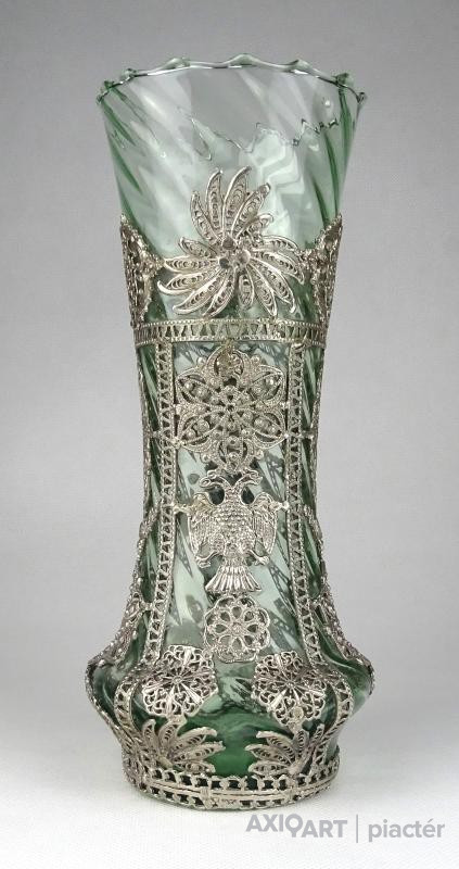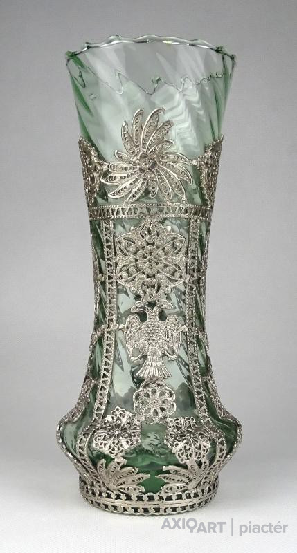 Gyönyörű, hibátlan állapotú antik fújt, halványzöld színű üveg váza. A testén körben részletgazdag gyönyörű filigrános díszítéssel. A díszítések között kétfejű sas motívum látható.