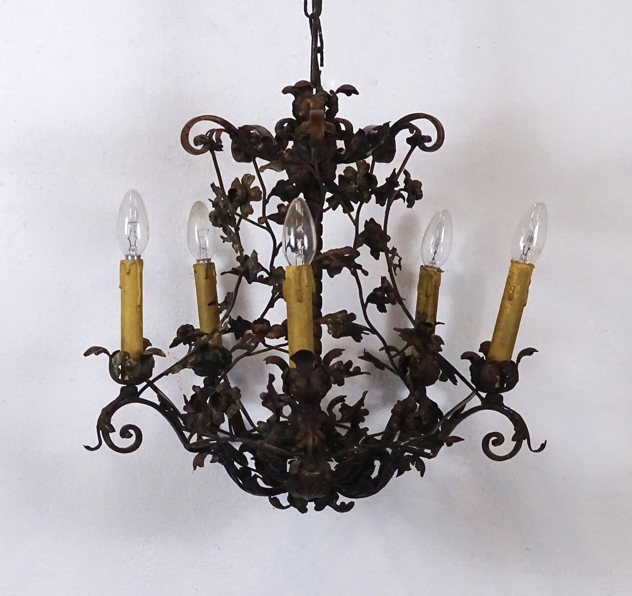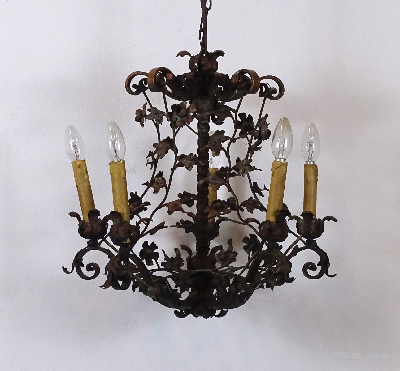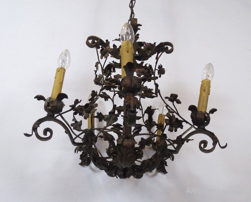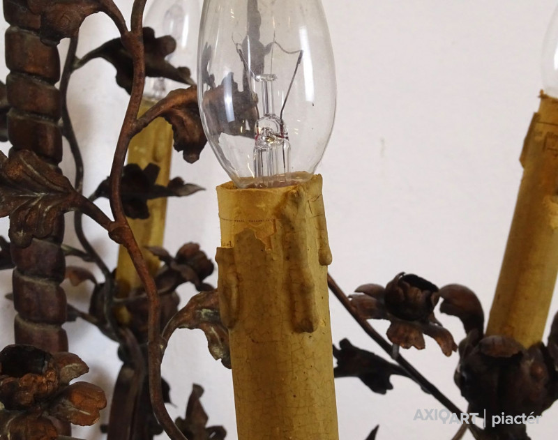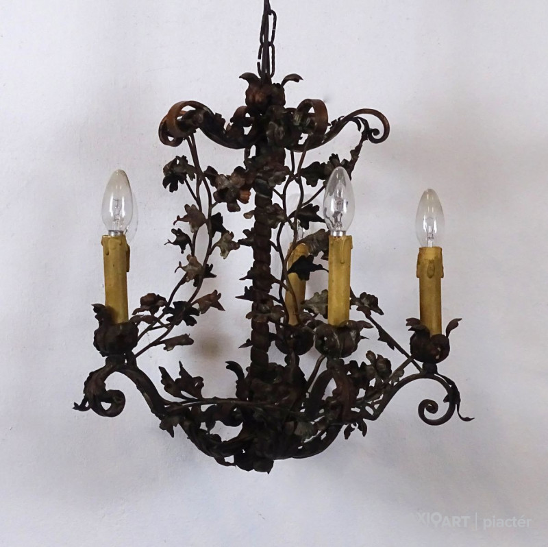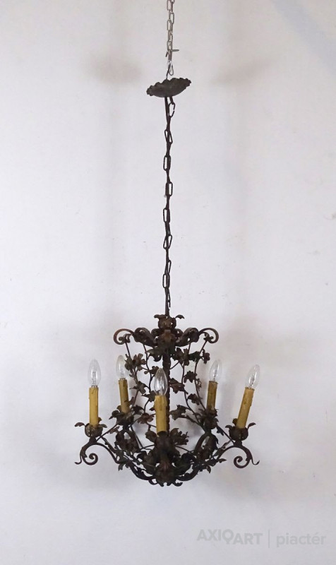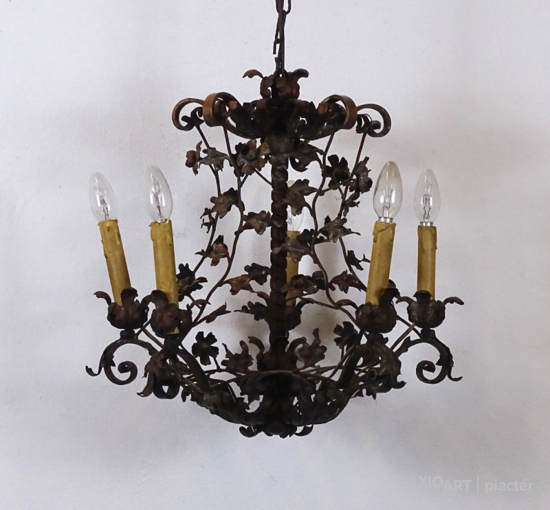 Régi, szép állapotú, nagyon gazdagon díszített, 5 égős, kovácsoltvas csillár. A karok papírmasé gyertyákban végződnek, kisméretű (E14) izzó való bele. Részletgazdag, finom kovácsmunka.