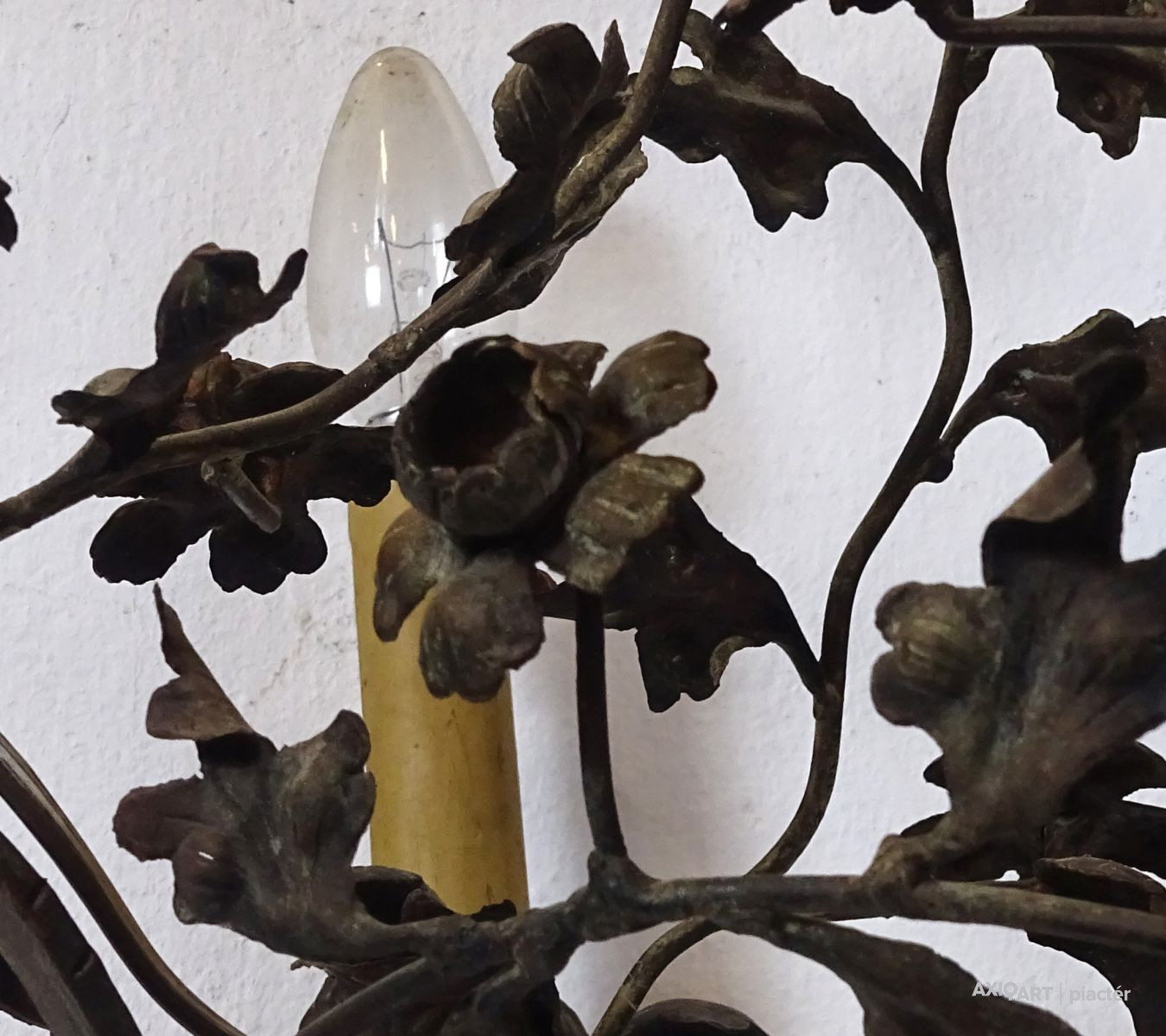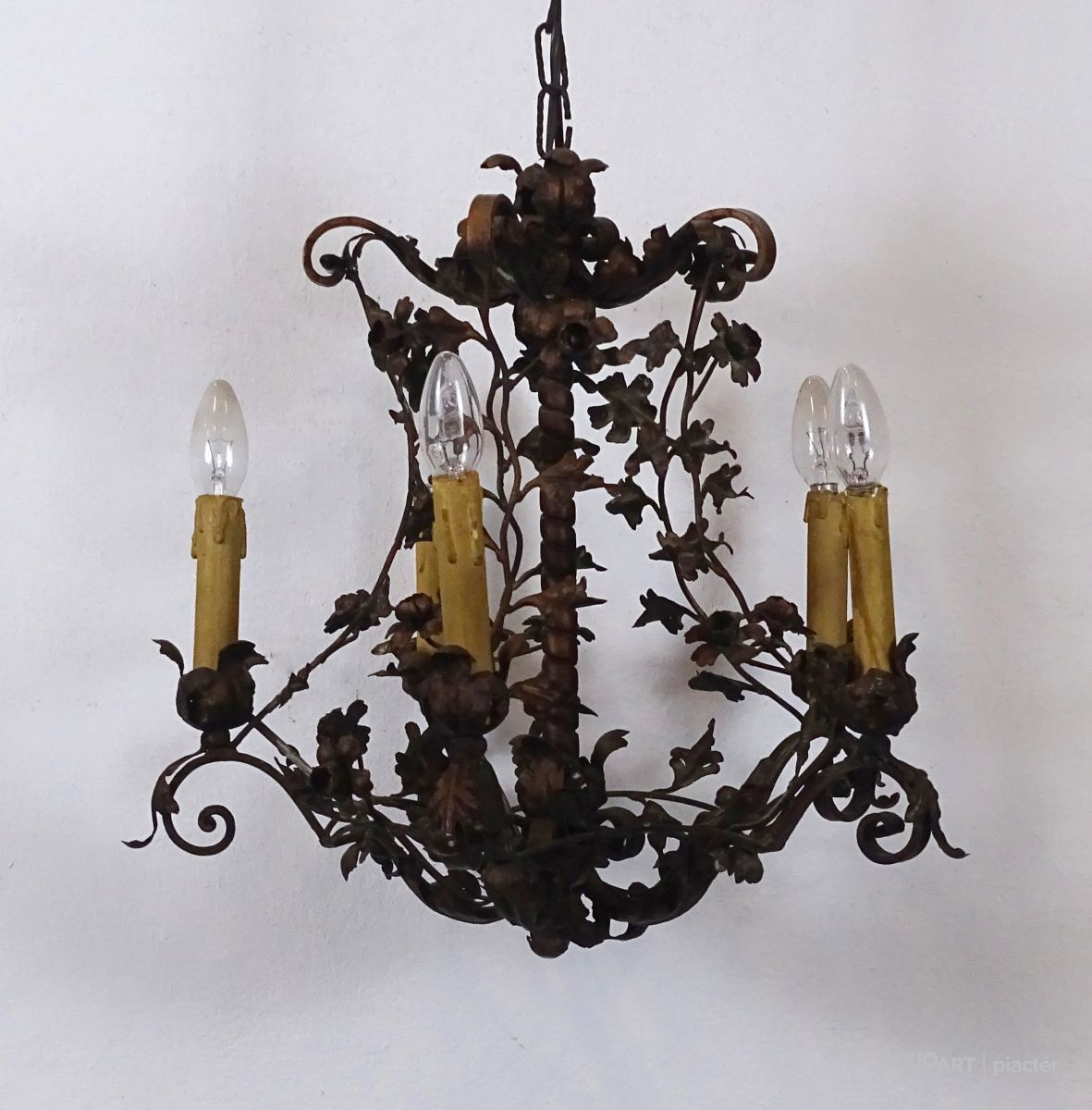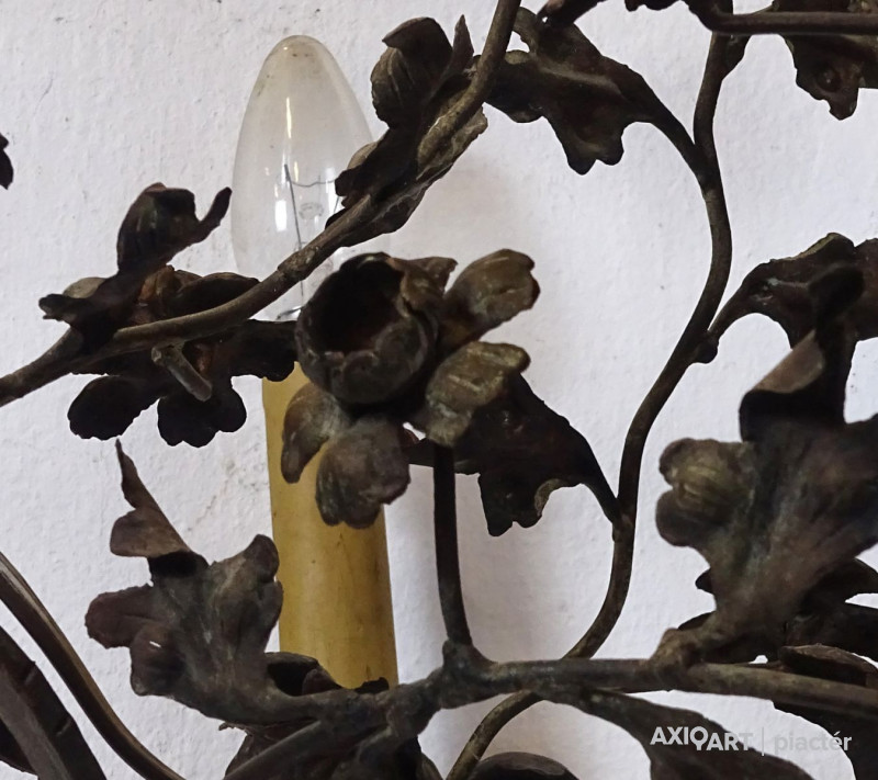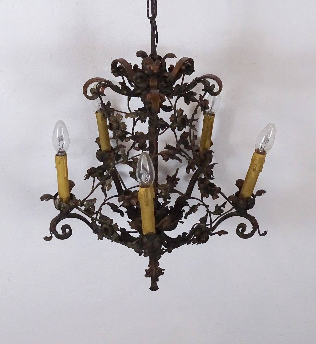 Régi, szép állapotú, nagyon gazdagon díszített, 5 égős, kovácsoltvas csillár. A karok papírmasé gyertyákban végződnek, kisméretű (E14) izzó való bele. Részletgazdag, finom kovácsmunka.