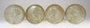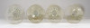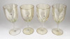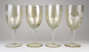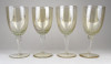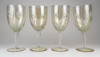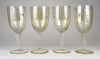 [1O009/X183] Régi, hibátlan állapotú, gyönyörű 4 darab egyforma fúvott üveg talpas pohár. Kialakításuk különleges, csavart, felülete irizáló, oldalán kézzel festett havasi gyopár díszítés látható. Két pohár nem függőleges, lásd fotó. Magasság: 16.5 cm Szélesség: 7 cm Súly: 0.615 kg