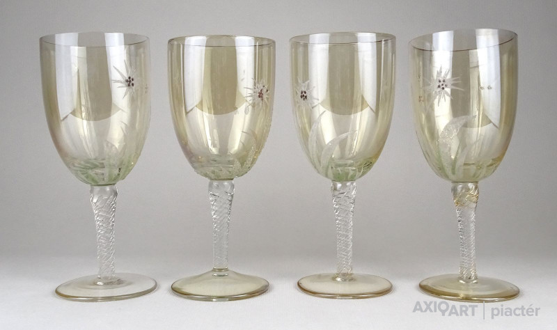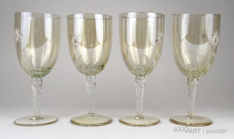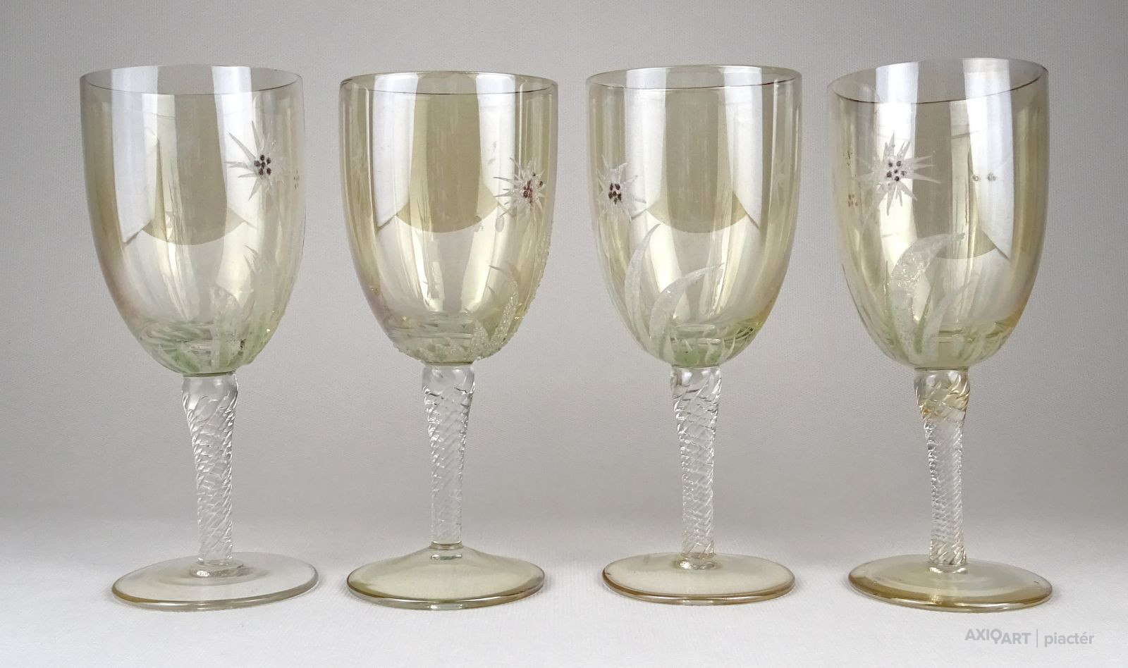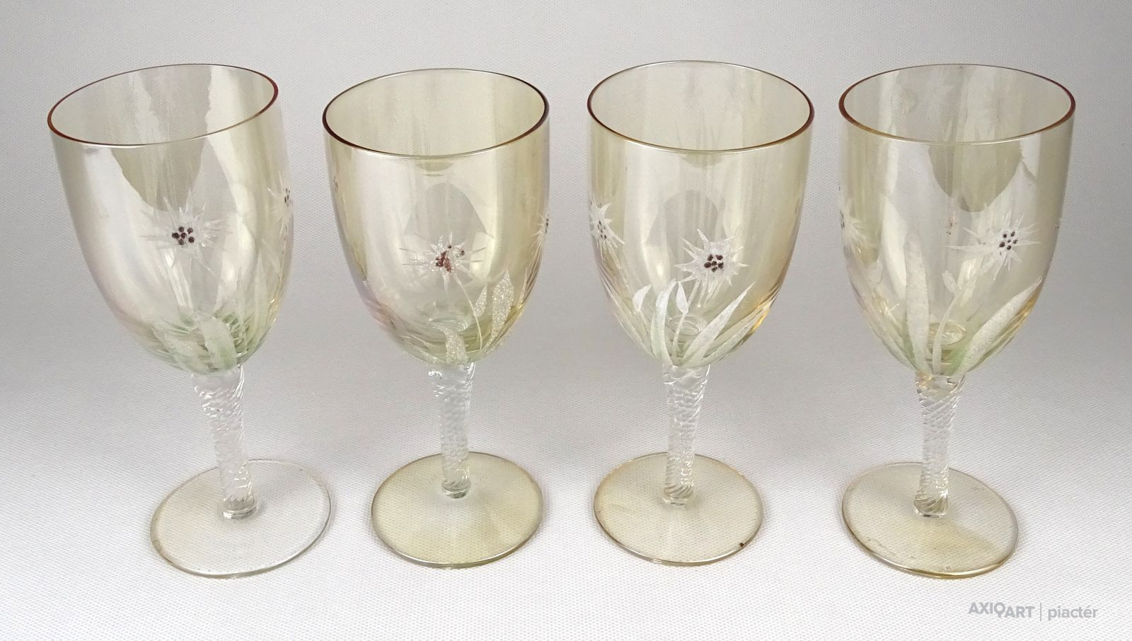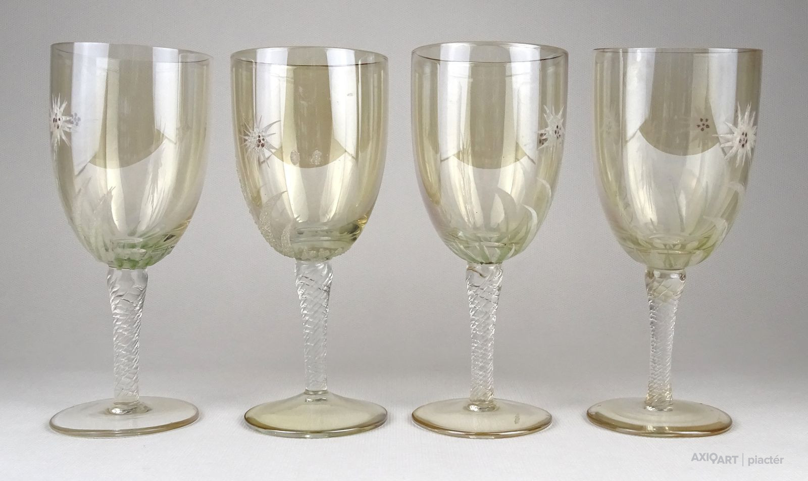 Régi, hibátlan állapotú, gyönyörű 4 darab egyforma fúvott üveg talpas pohár. Kialakításuk különleges, csavart, felülete irizáló, oldalán kézzel festett havasi gyopár díszítés látható. Két pohár nem függőleges, lásd fotó.
