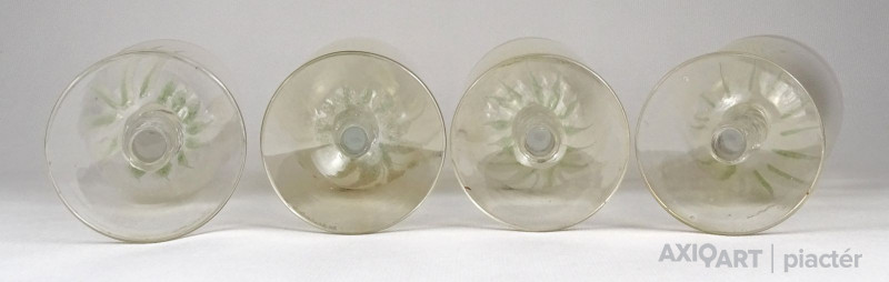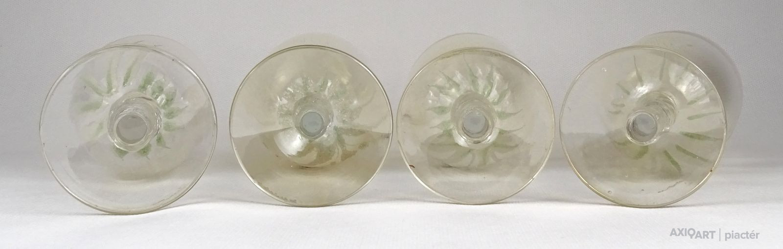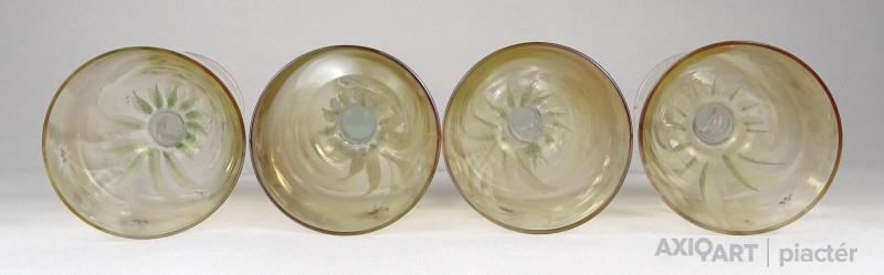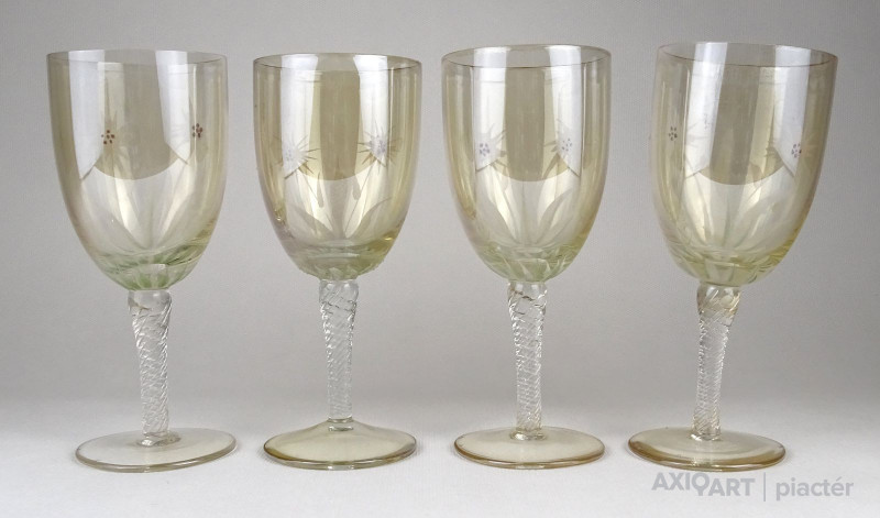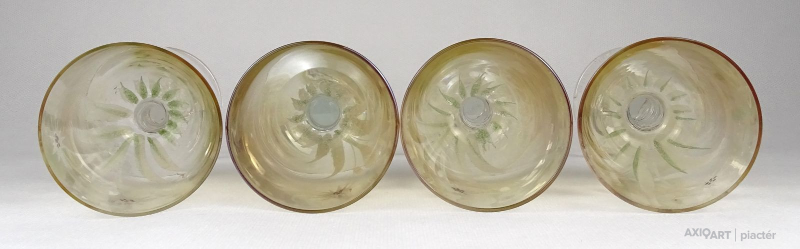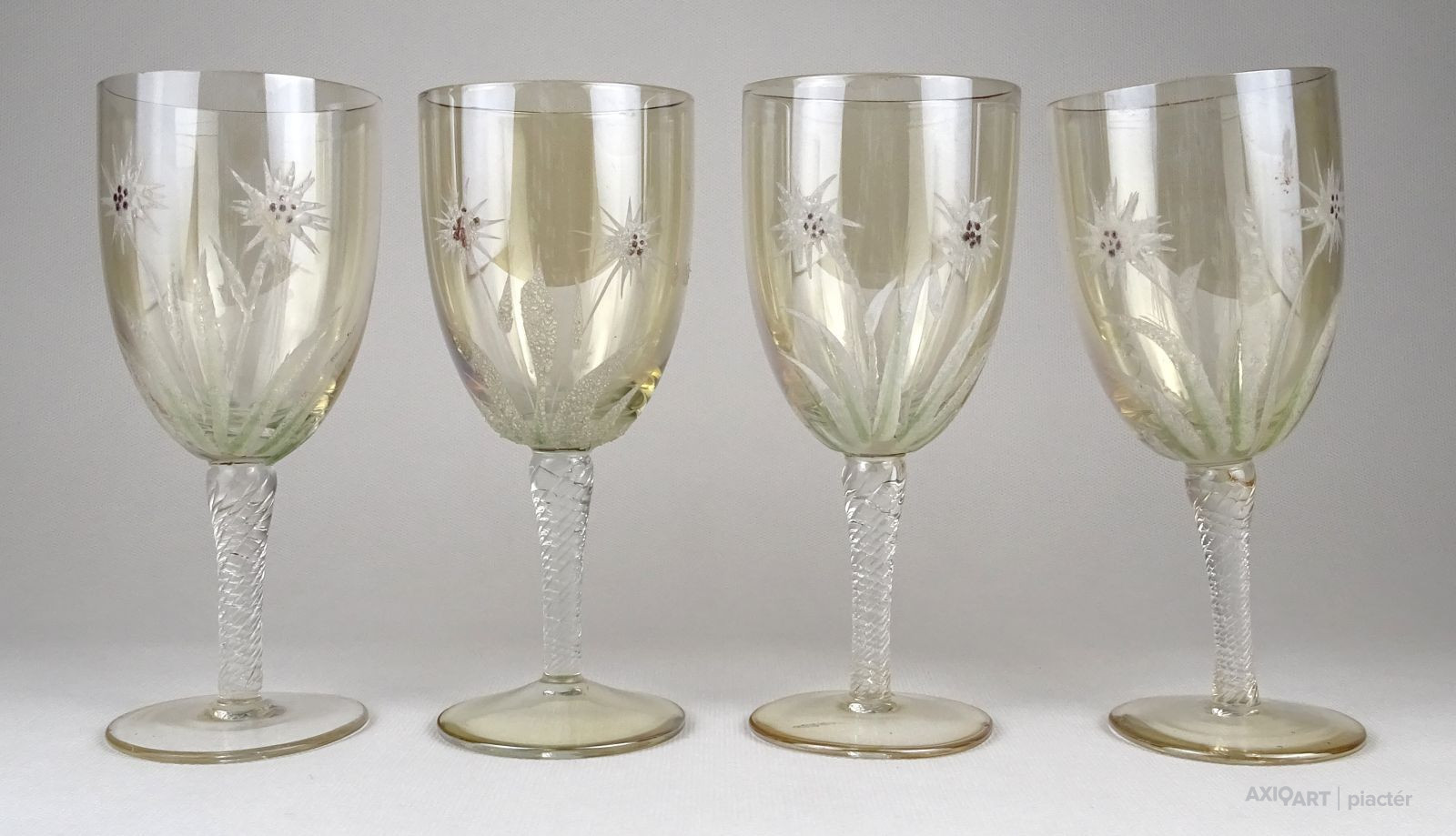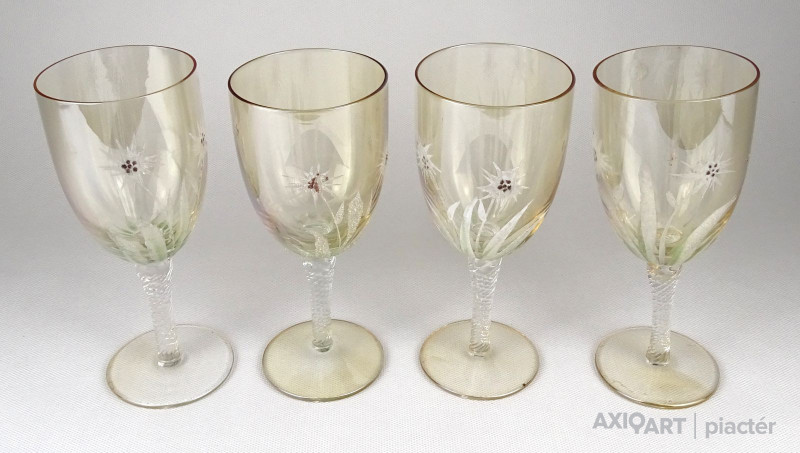 Régi, hibátlan állapotú, gyönyörű 4 darab egyforma fúvott üveg talpas pohár. Kialakításuk különleges, csavart, felülete irizáló, oldalán kézzel festett havasi gyopár díszítés látható. Két pohár nem függőleges, lásd fotó.