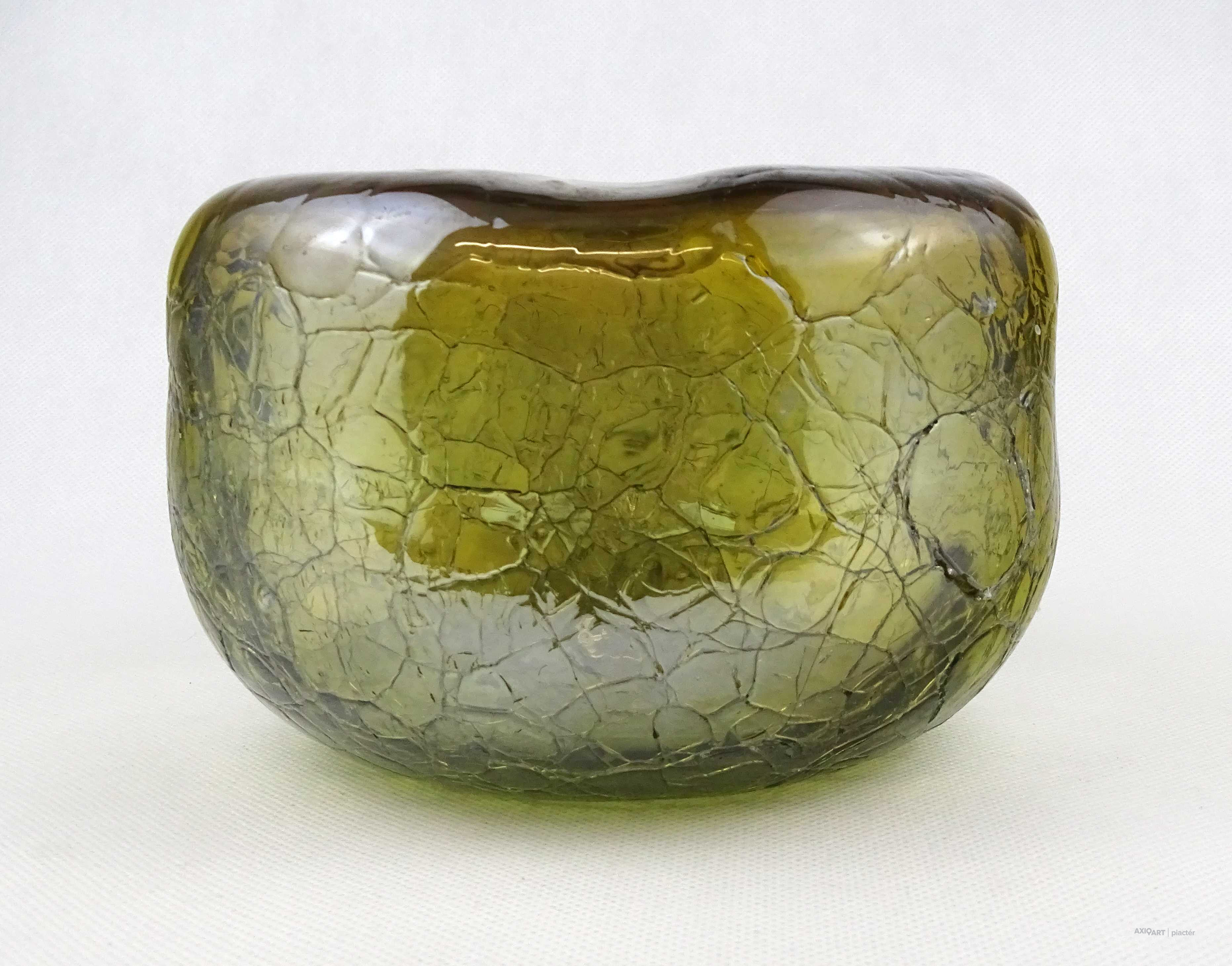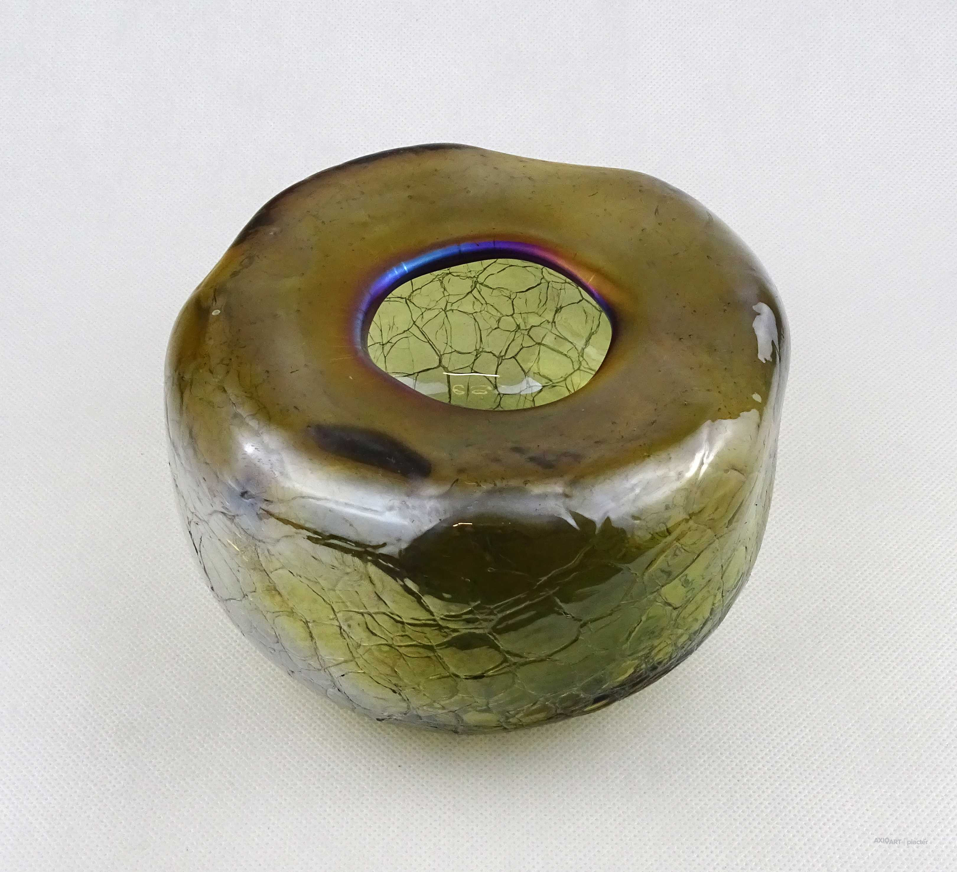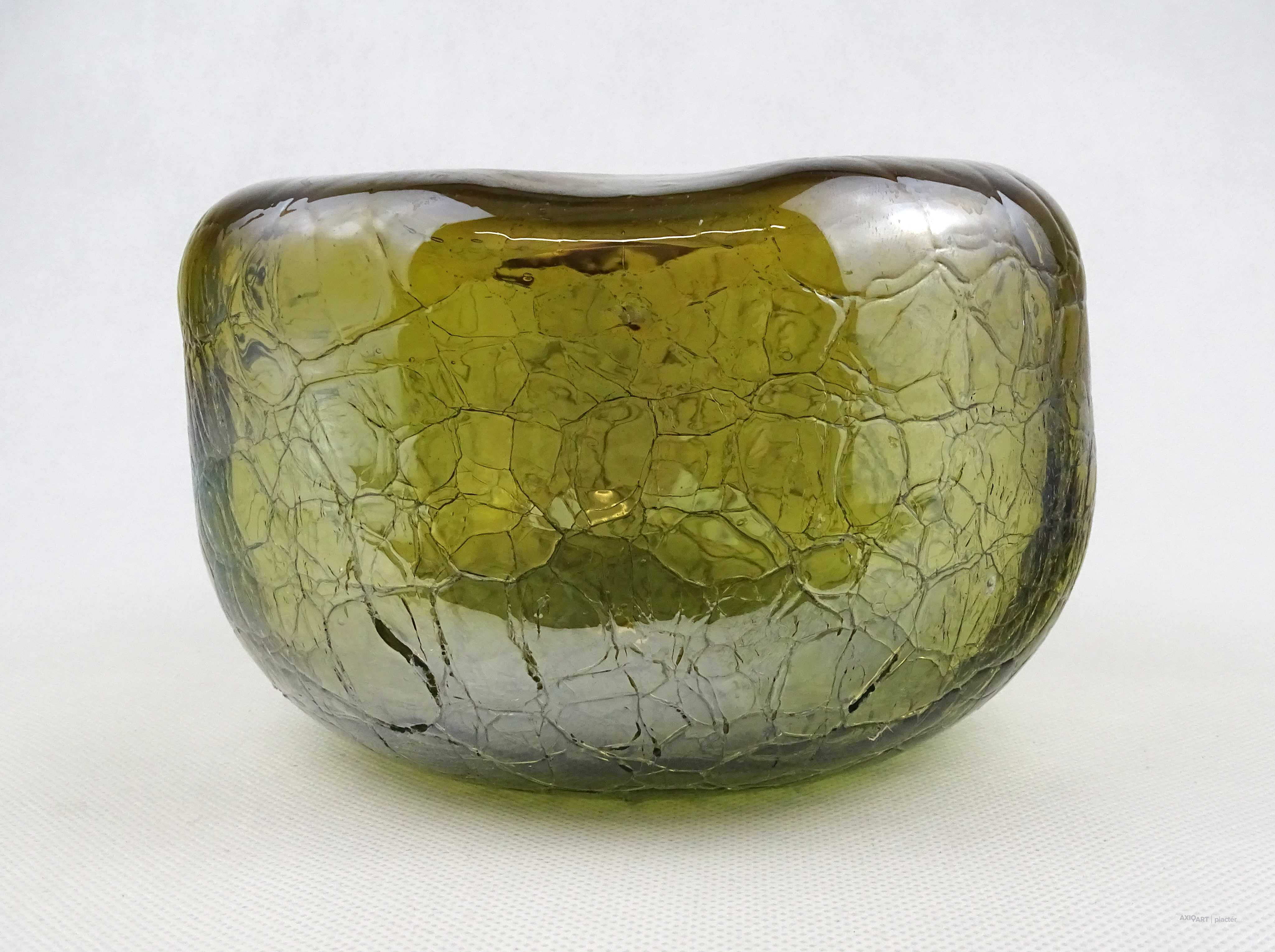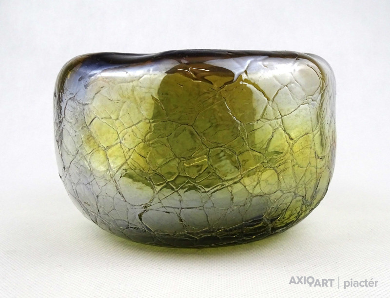 [1Z105/X334] Hibátlan állapotú, gyönyörű, irizáló rétegelt kraklé, crackle, művészi üveg váza, design váza. Alján a fújás, szakítás nyomát csiszolással tüntették el. Magasság: 11 cm Szélesség: 17 cm Súly: 1.225 kg