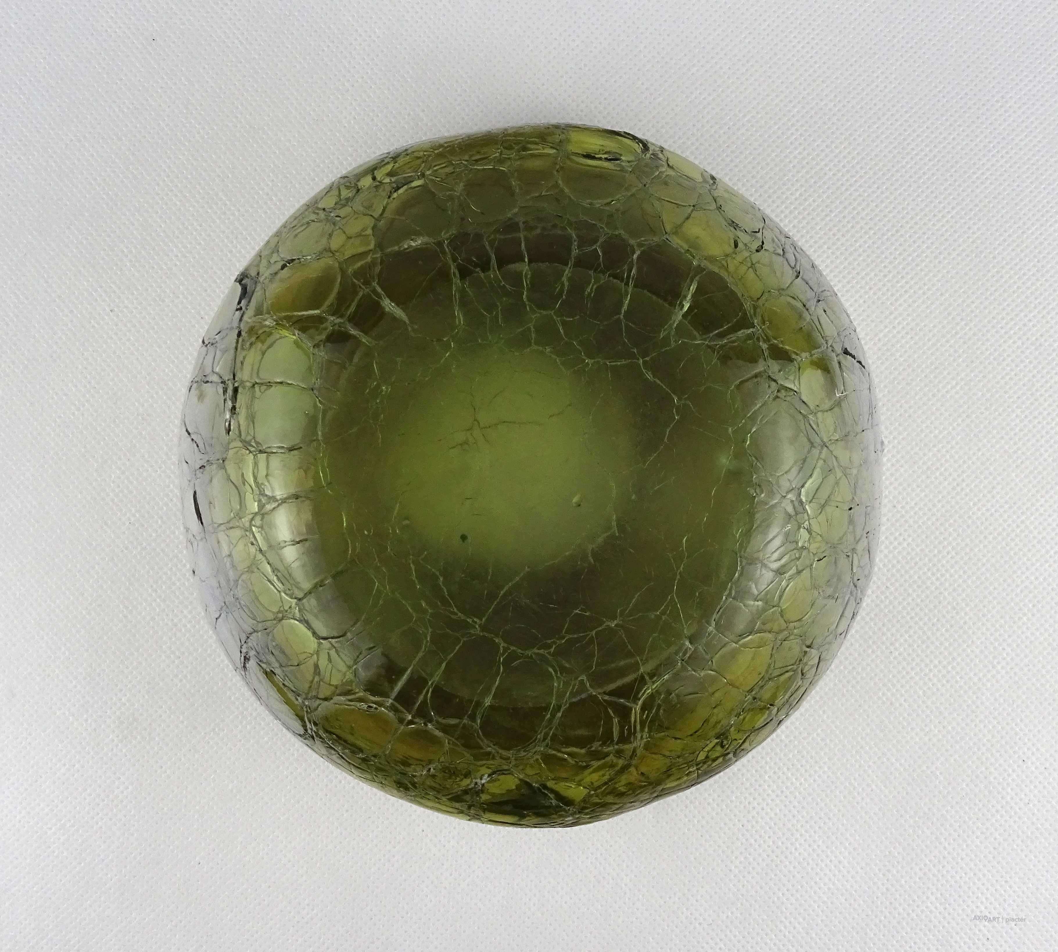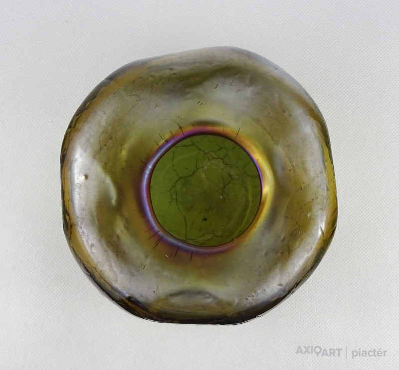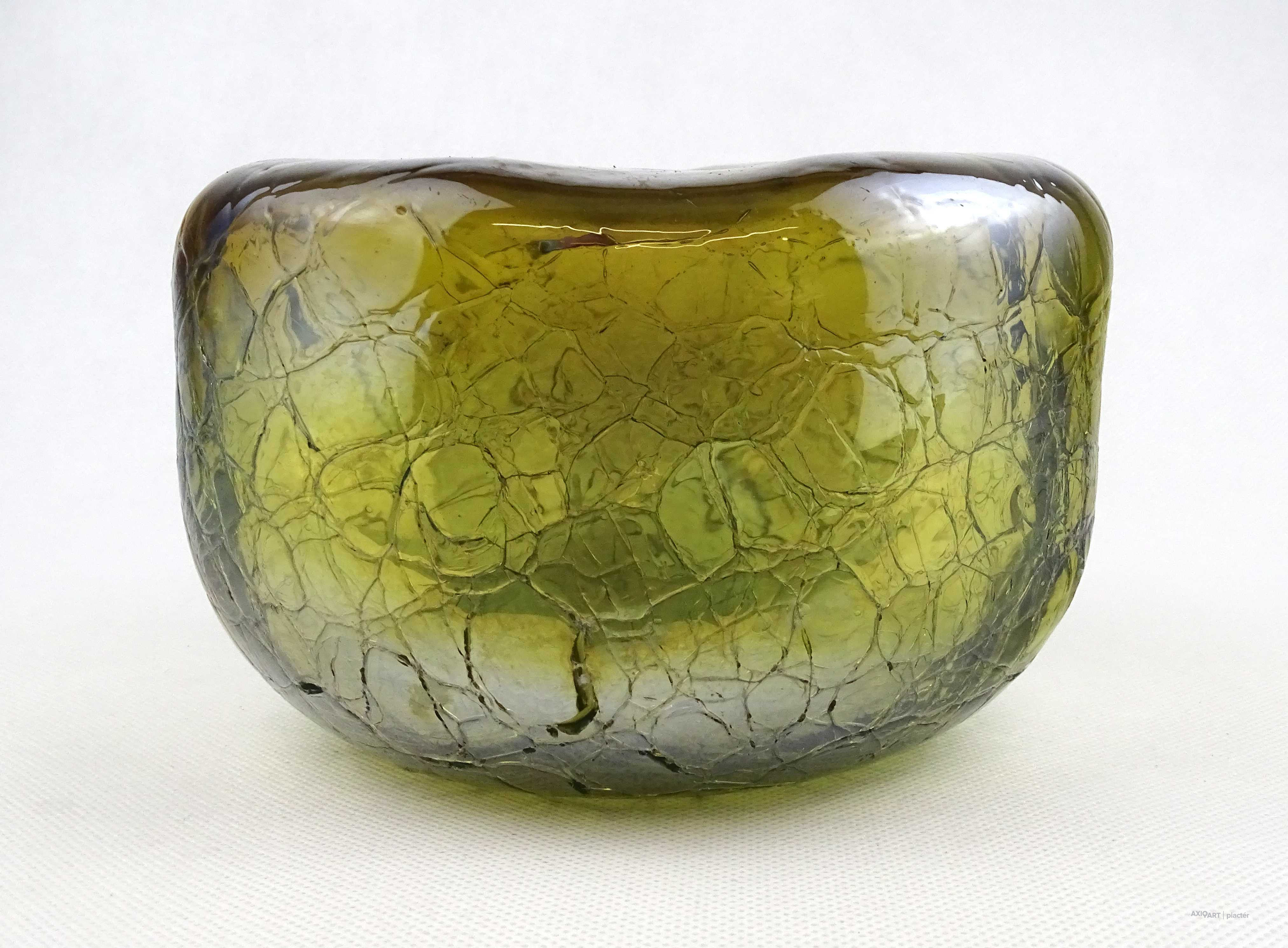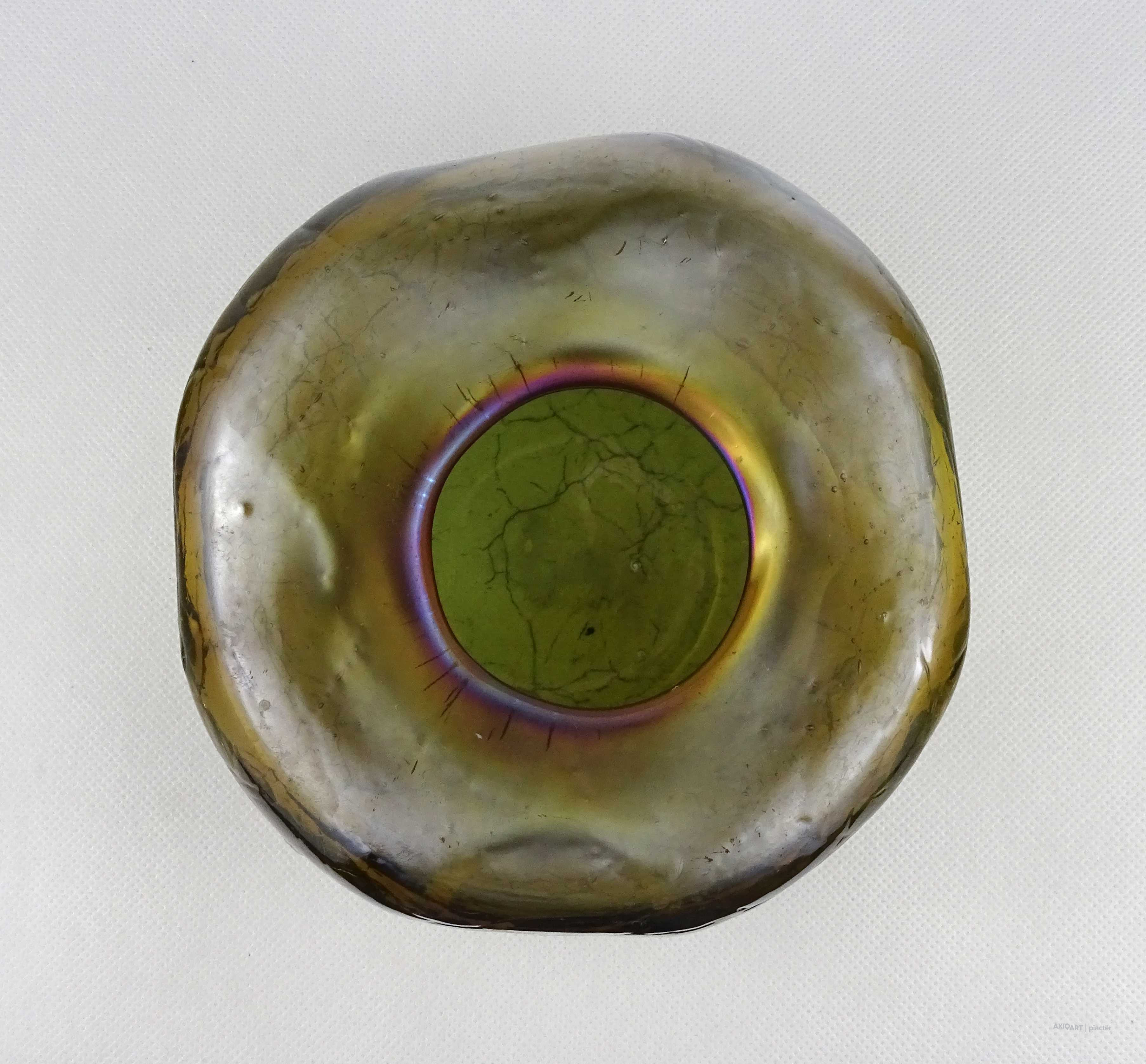 [1Z105/X334] Hibátlan állapotú, gyönyörű, irizáló rétegelt kraklé, crackle, művészi üveg váza, design váza. Alján a fújás, szakítás nyomát csiszolással tüntették el. Magasság: 11 cm Szélesség: 17 cm Súly: 1.225 kg