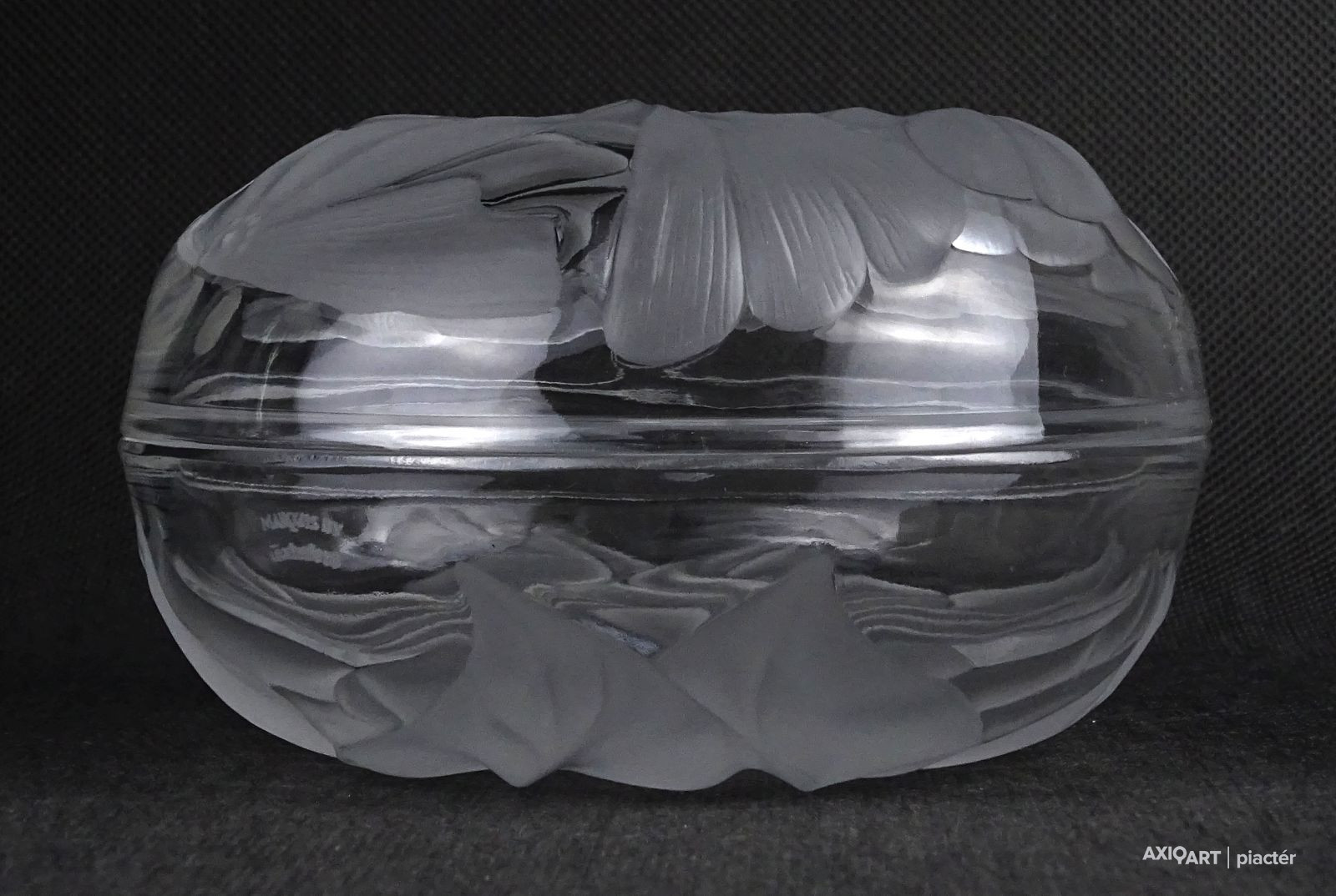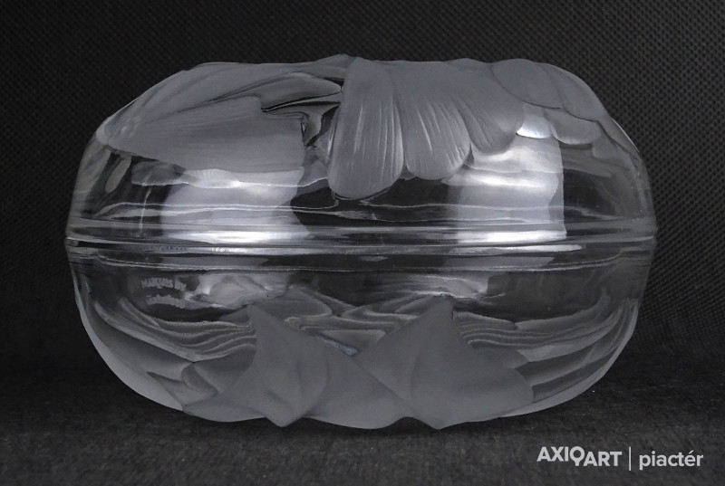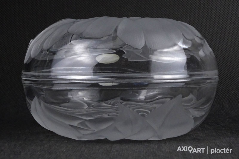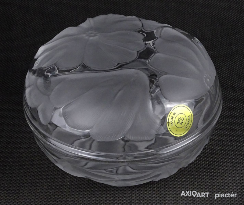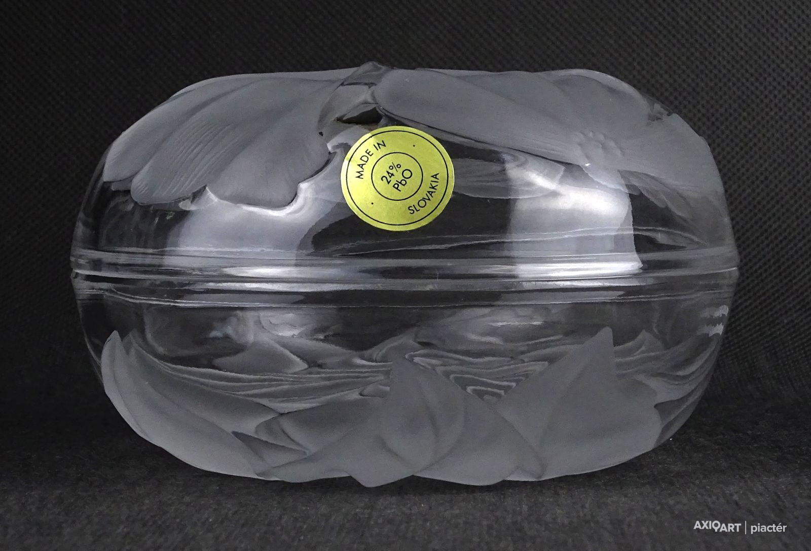 [1O835/X175] Gyönyörű, maratott virágokkal gazdagon díszített, fedeles gyűrűtartó, ékszertartó, bonbonier. Gyártói címkén felirat: 24%PbO MADE IN SLOVAKIA Alsó részén jelzés: MARQUIS BY ... Magasság: 7 cm Szélesség: 12 cm Súly: 0.565 kg