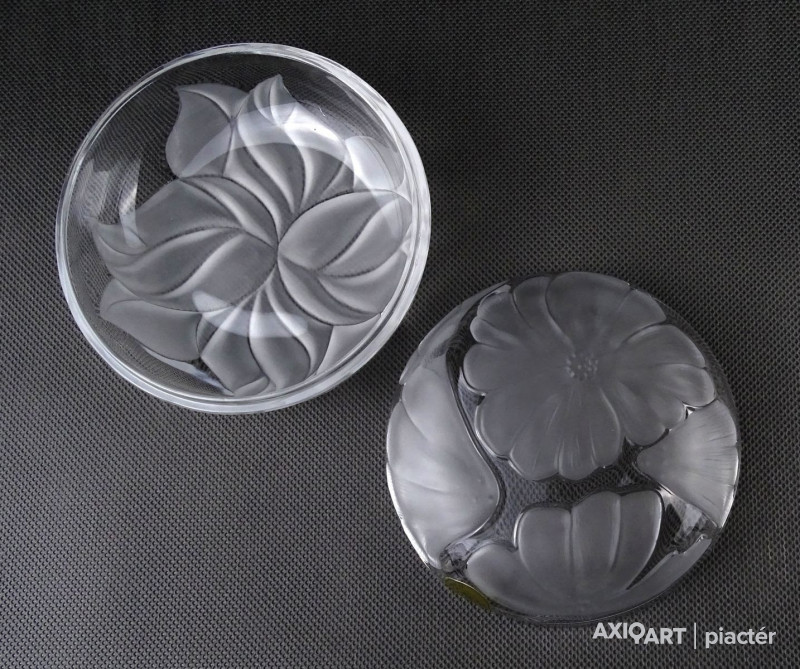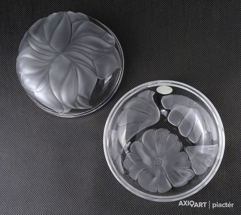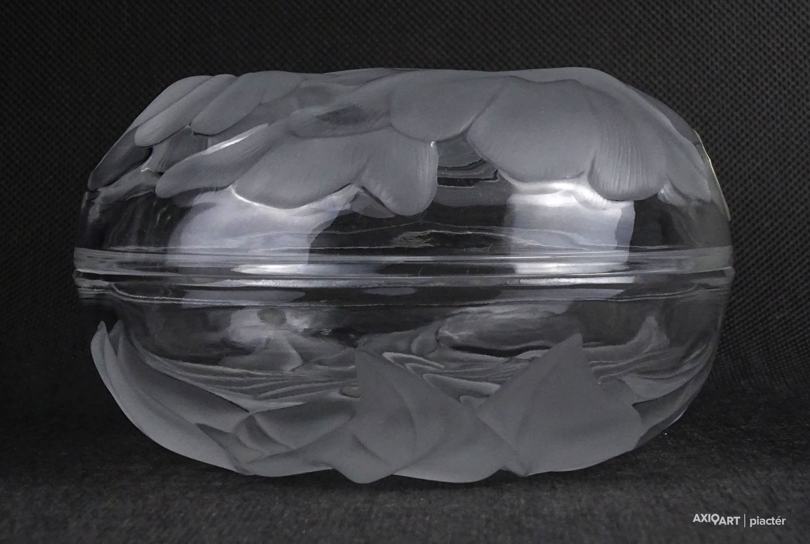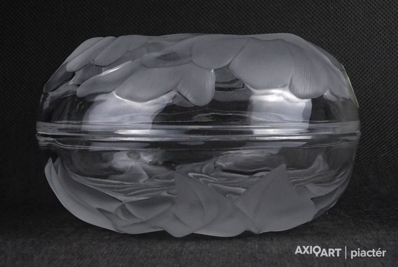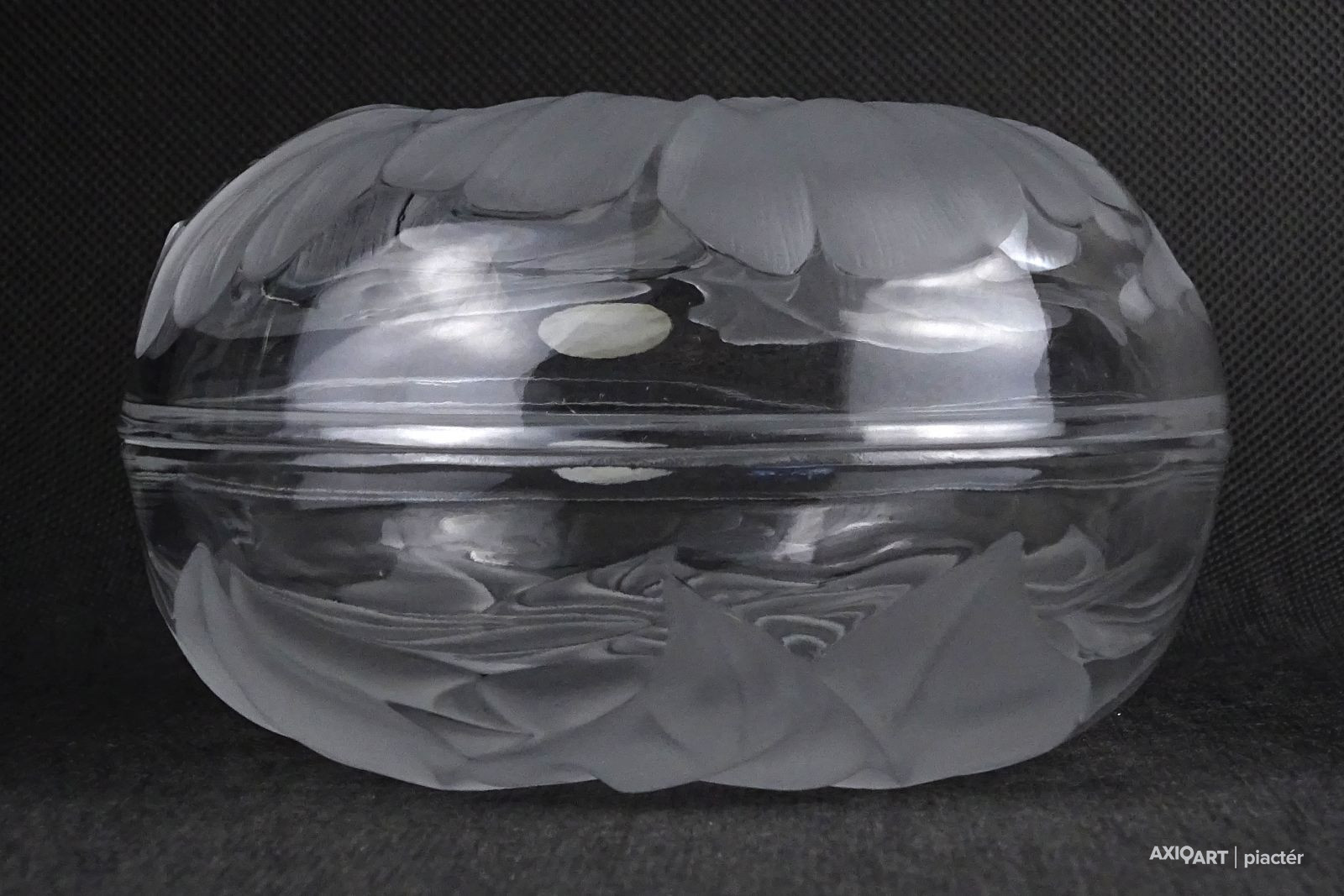[1O835/X175] Gyönyörű, maratott virágokkal gazdagon díszített, fedeles gyűrűtartó, ékszertartó, bonbonier. Gyártói címkén felirat: 24%PbO MADE IN SLOVAKIA Alsó részén jelzés: MARQUIS BY ... Magasság: 7 cm Szélesség: 12 cm Súly: 0.565 kg