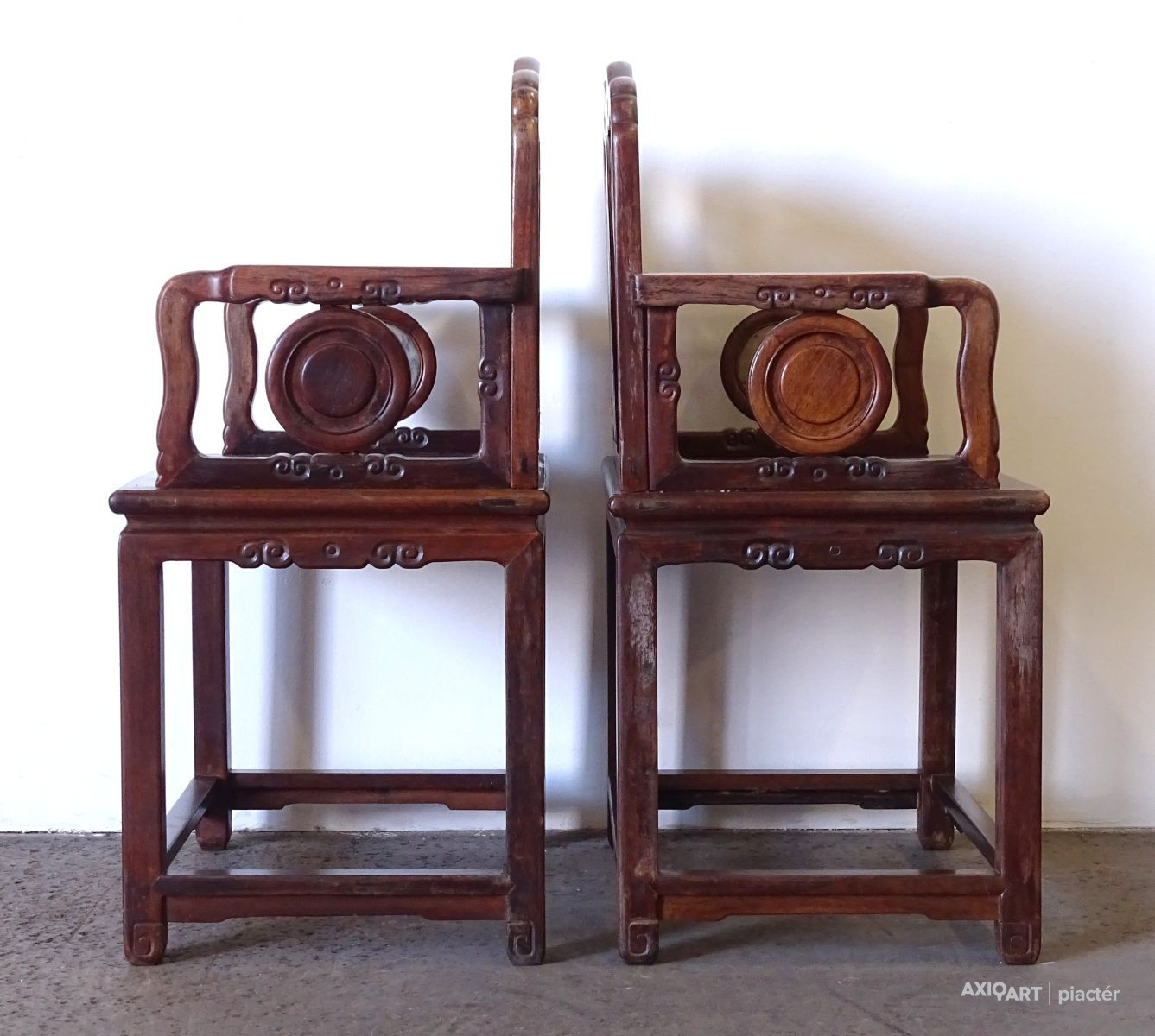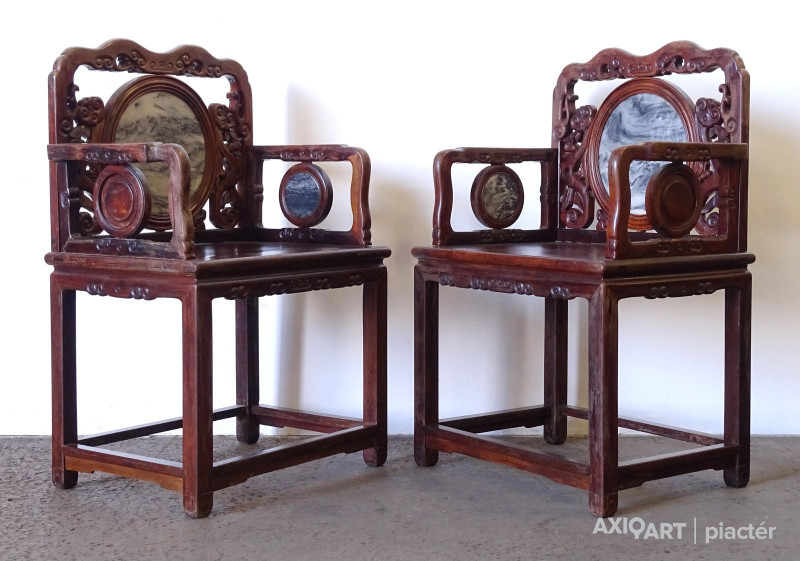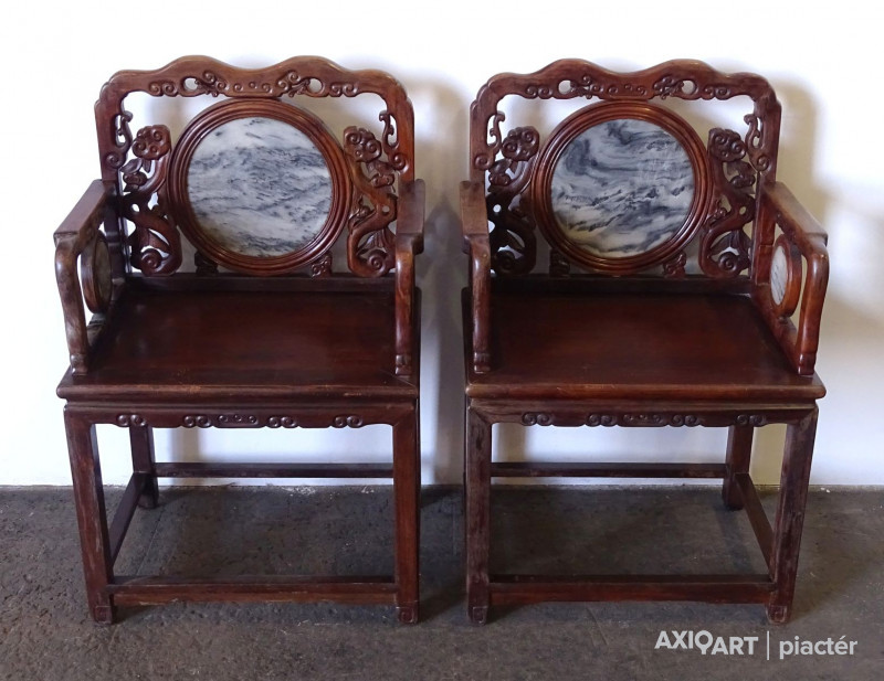 Gyönyörű, egzotikus keményfából készült, áttört díszes, támlás, karfás szék. Faragott orientalista bútor. Támlájában és a karfák alatt kör alakú márvány betét található. Az 1900-as évek elejéről származó darab.
