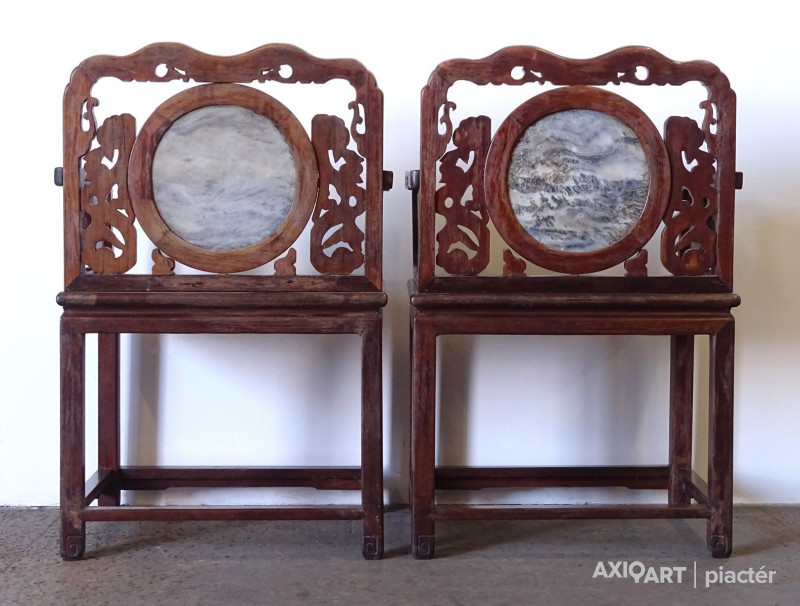 Gyönyörű keleti orientalista márványbetétes keményfa támlás szék pár 1900 elejéről
