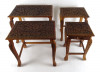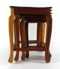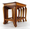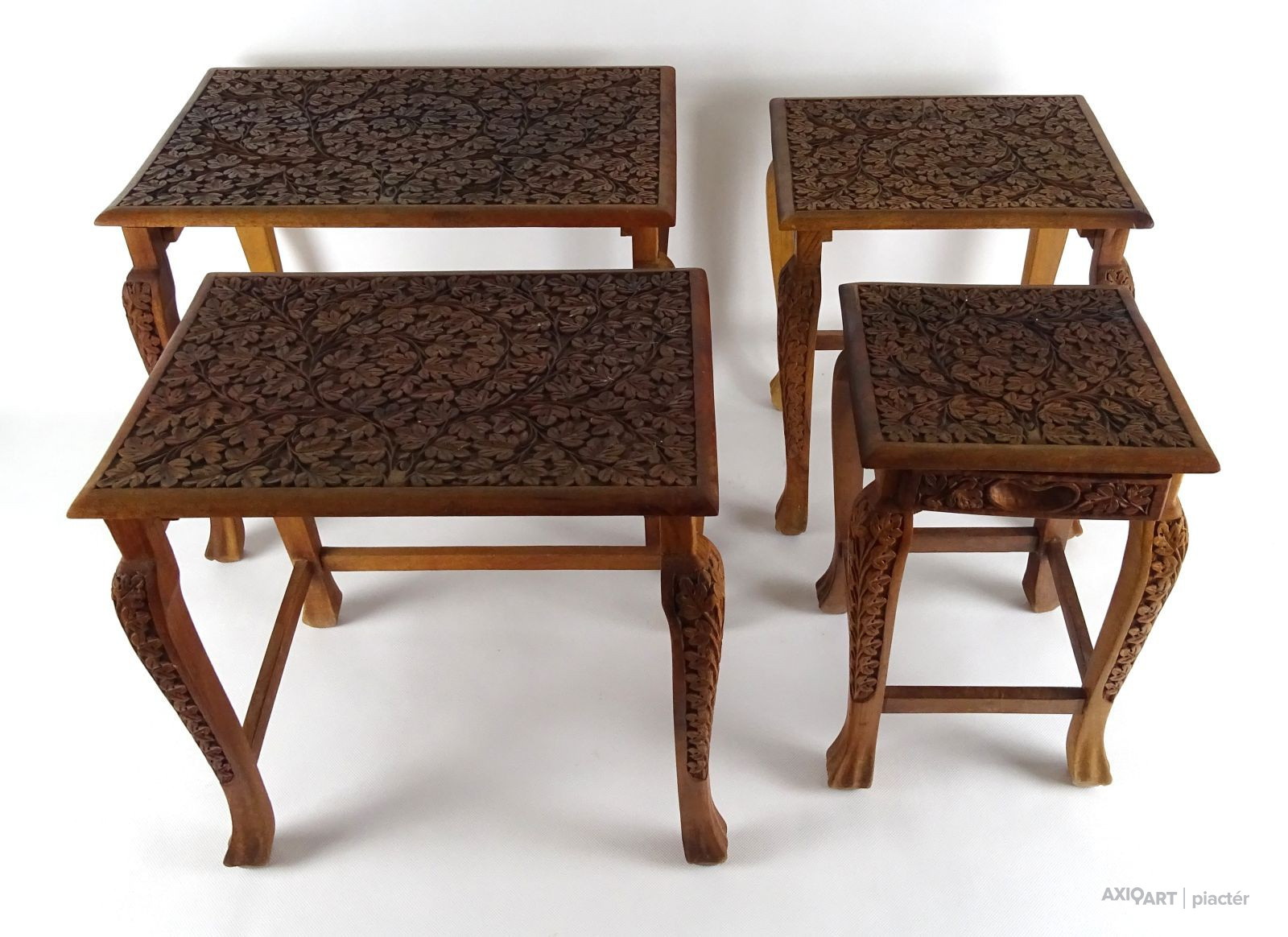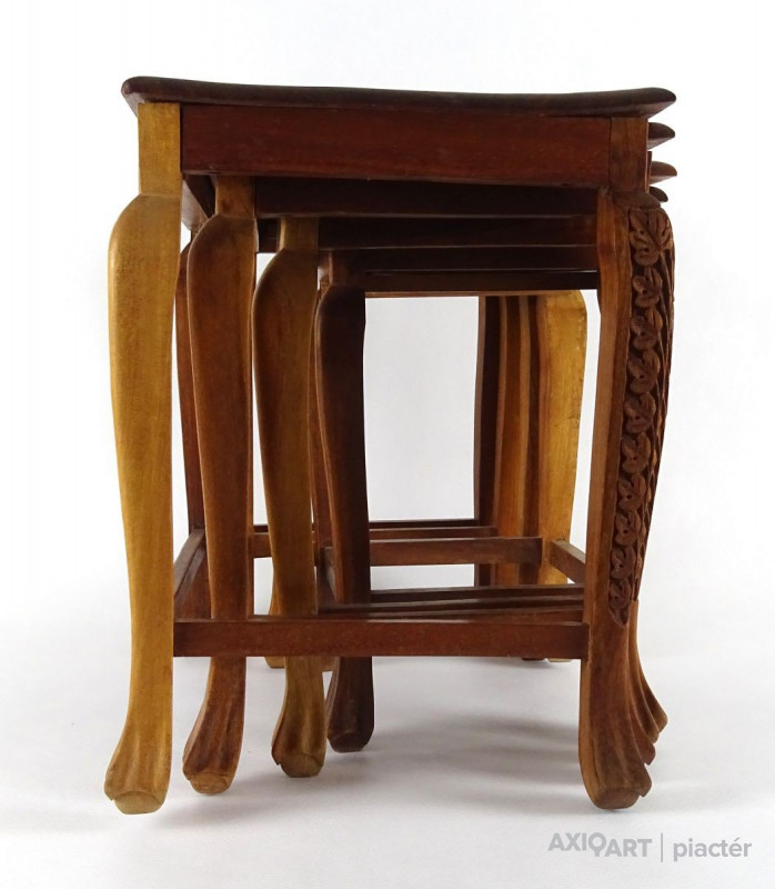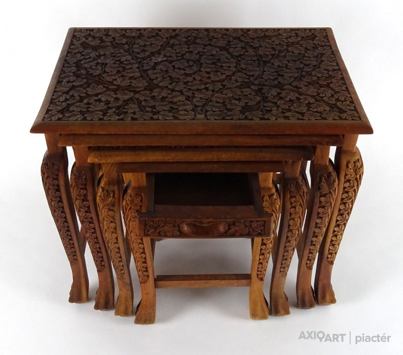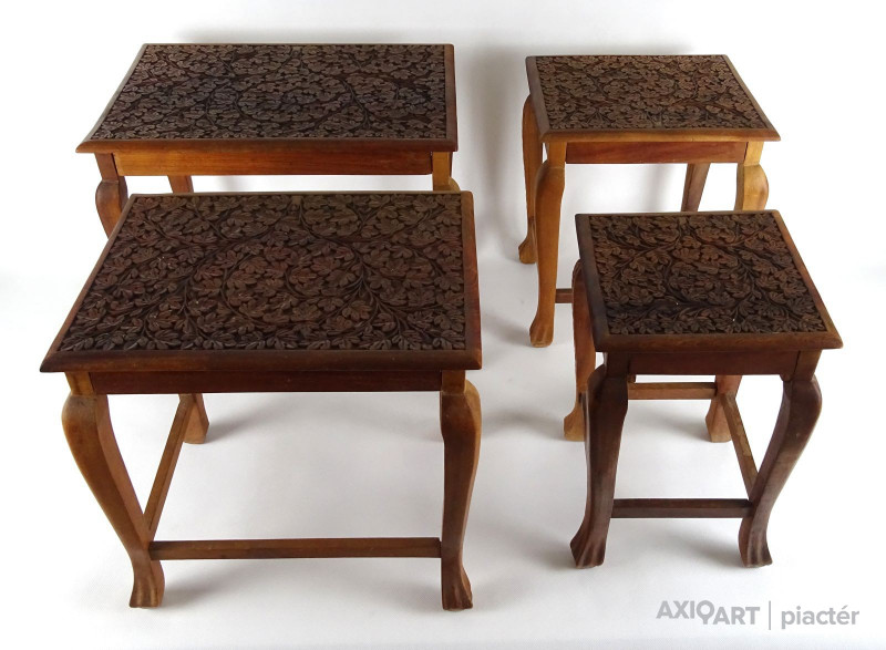 Gyönyörű, gazdagon faragott, négy darabból álló, egymásba tolható, széthúzható kisasztal készlet. Minden darab lapja és lábai gyönyörűen faragottak. A legkisebb faragott fiókkal rendelkezik.