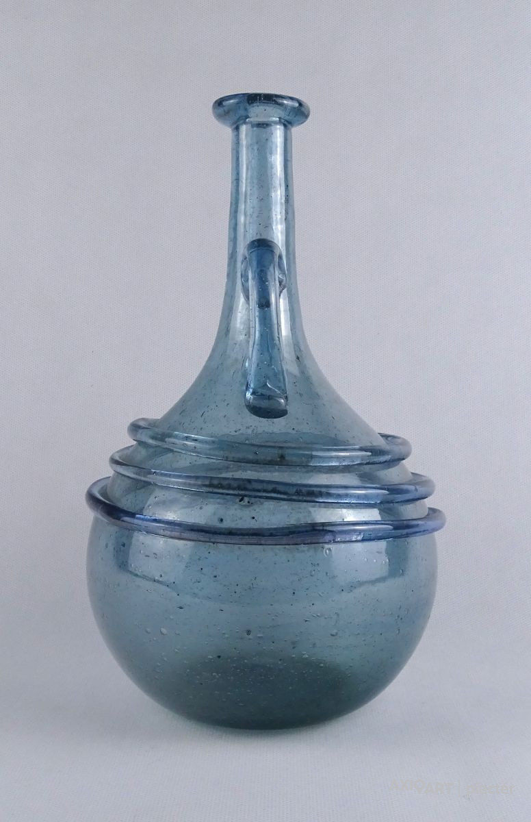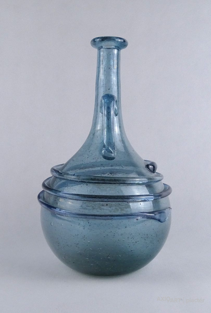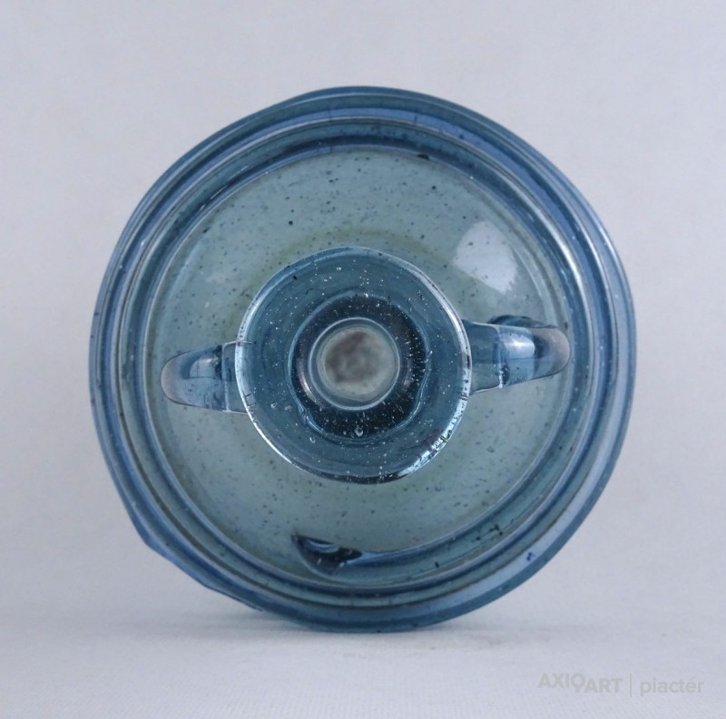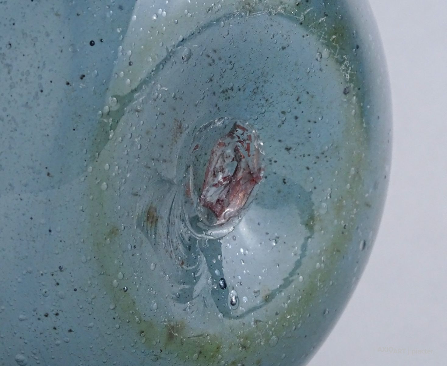 Gyönyörű, halványkék, kézműves, fújtüveg váza kiöntő, díszüveg, testében rengeteg zárvánnyal és buborékkal. Az alján a fújtüvegekre jellemző szakításnyommal.