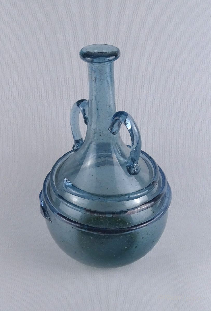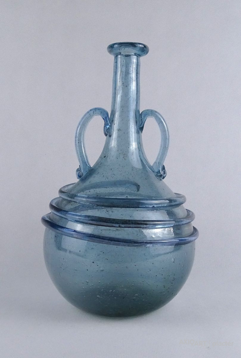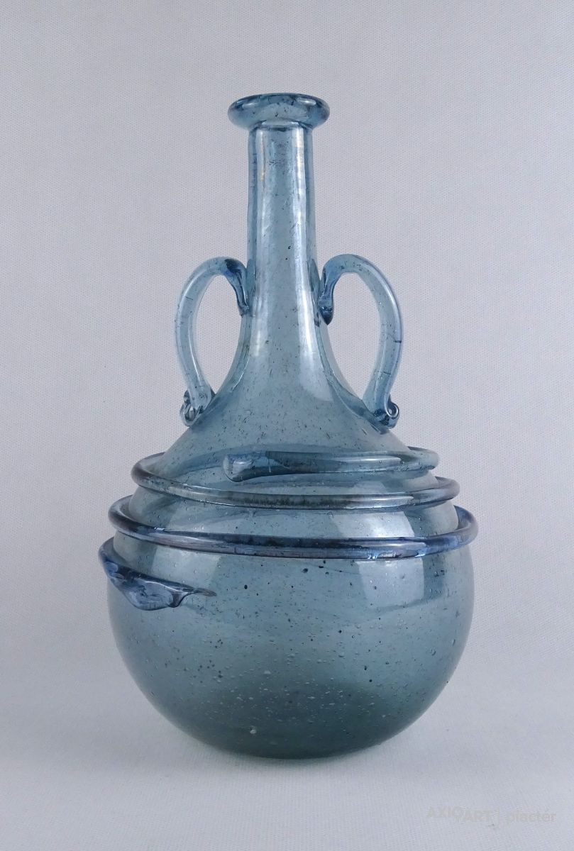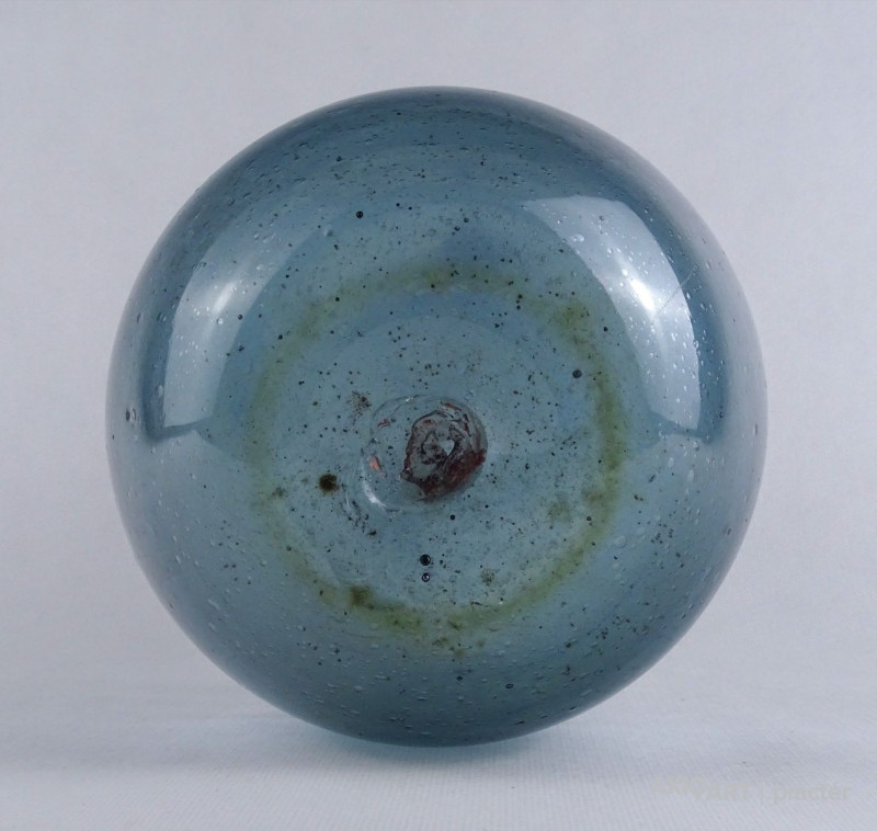 Gyönyörű, halványkék, kézműves, fújtüveg váza kiöntő, díszüveg, testében rengeteg zárvánnyal és buborékkal. Az alján a fújtüvegekre jellemző szakításnyommal.