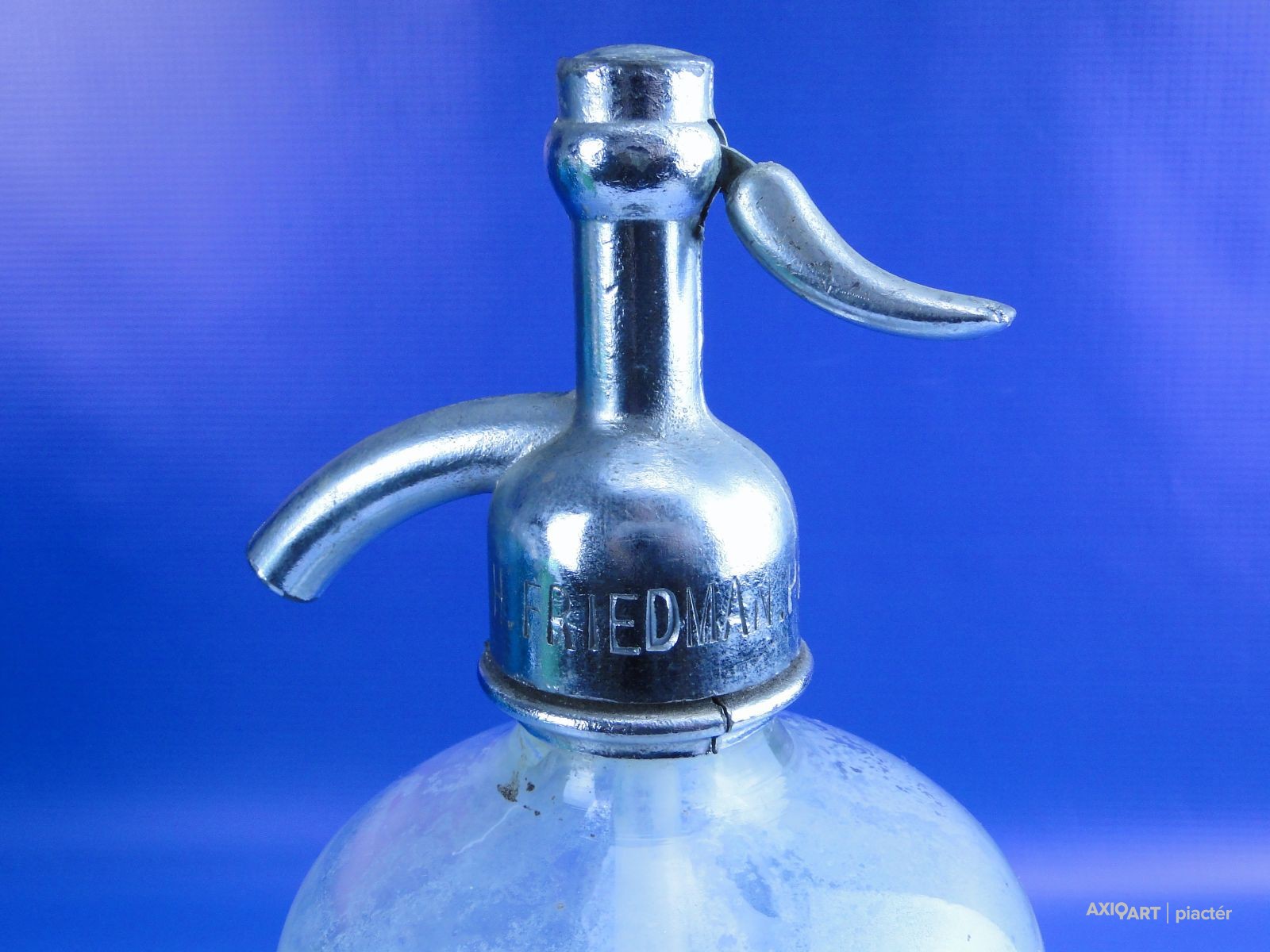 [0D888/Z017] Hibátlan állapotú, krómozott fémfejes szódásüveg szikvizes üveg. Az üveg rendkívul ritka, fejazonos, gyűjteménybe való darab. Palackon homokfúvott felirat: H. FRIEDMAN HF. PHILADELPHIA PA. CONT. 26 OZ. Talpán felirat: BOTTLE MADE IN CZECHOSLOVAKIA A fejen felirat: H. FRIEDMAN PHILA. 74 Magasság: 28 cm Szélesség: 9 cm Súly: 1.448 kg