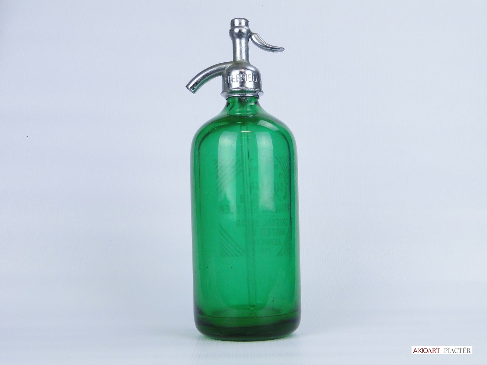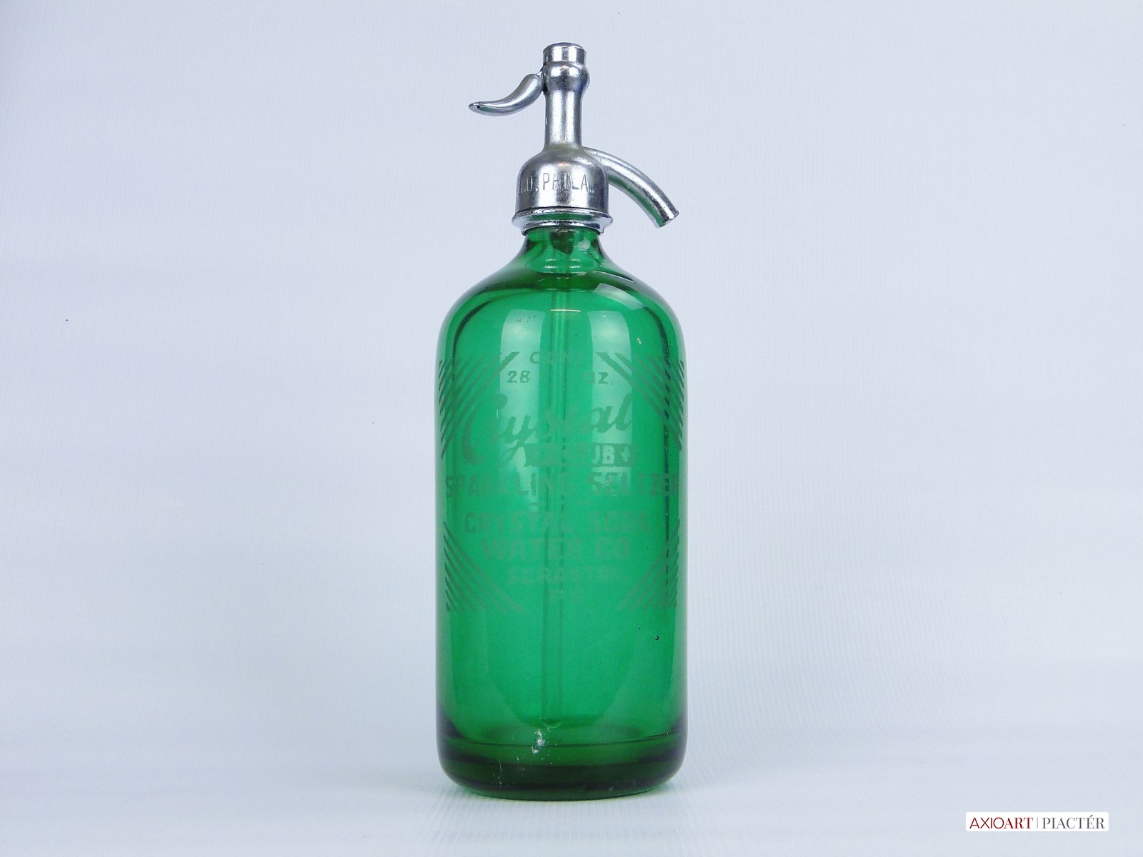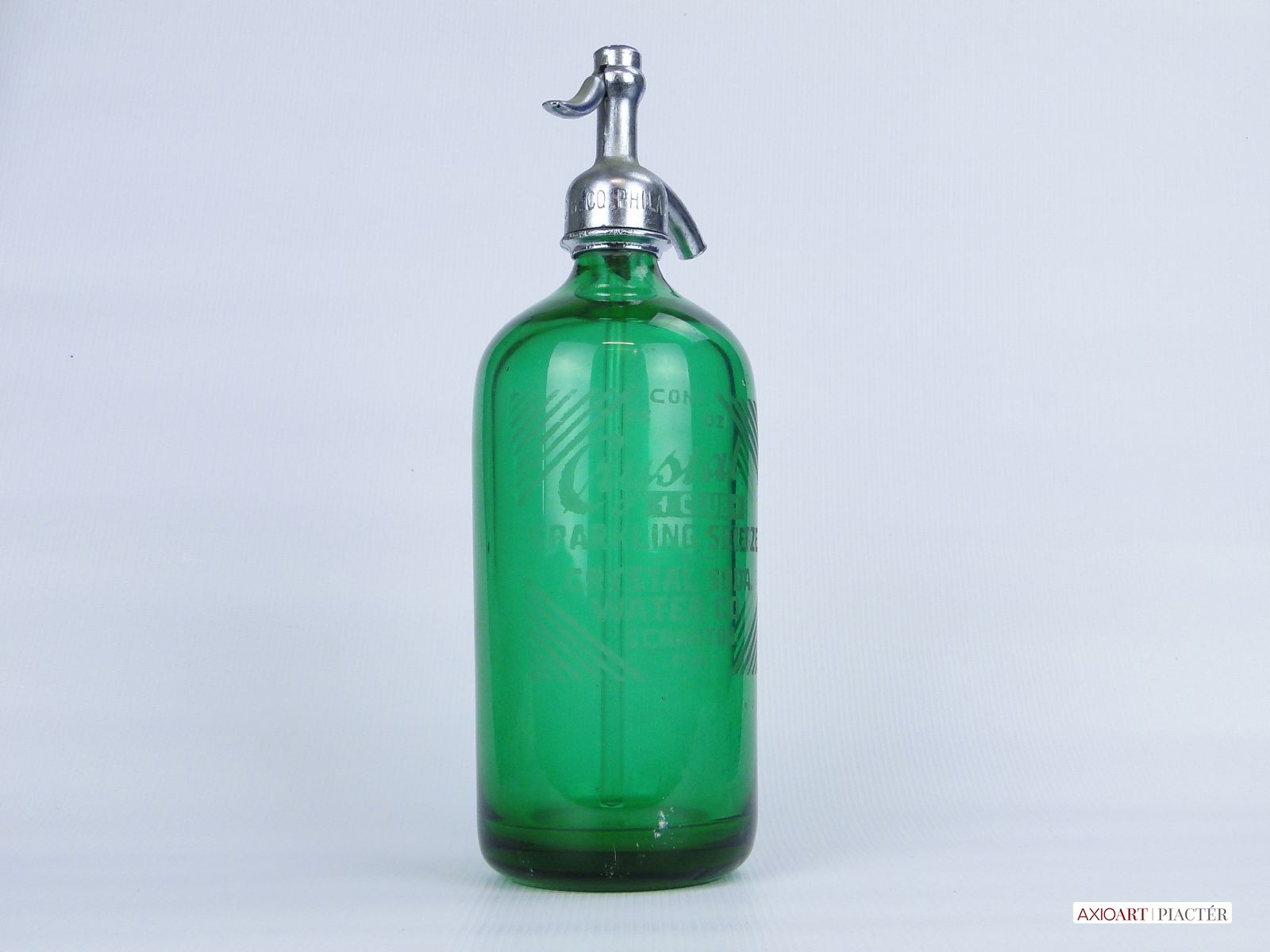 [0D890/UZ-N] Antik méregzöld, rendkívül ritka színű, gyűjteménybe való szódásüveg. Hibátlan állapotú, fémfejes. Palackon homokfúvott felirat: CONT. 28 OZ. CRYSTAL CLUB SPARKLING SELTZER CRYSTAL SODA WATER Co. SCRANTON PA. Talpán felirat: MAJESTIO MADE IN CZECHO-SLOVAKIA A fejen felirat: SHEFFIELD B. Co. PHILA. Magasság: 28 cm Szélesség: 9 cm Súly: 1.454 kg