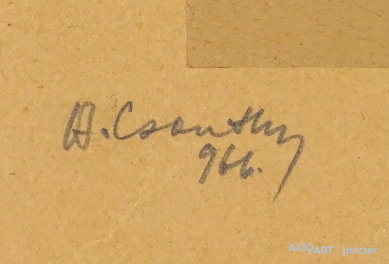 [FKB742/Bp44/33] A kép mérete: 50 x 39 cm keret nélkül. Készült: Kréta, Papír A kép Kajári Gyula (Ősi, 1926, Hódmezővásárhely, 1995) alkotása. Jelezve jobbra lent "Kajári Gyula 1960" A festmény több helyen sérült. Keret: Új Magyar festők és grafikusok életrajzi lexikona I-II. Festő és grafikus. 1948-49-ben a budapesti Iparművészeti Főiskolán, 1950-1955 között pedig a Képzőművészeti Főiskolán végezte tanulmányait. Miháltz Pál, Ék Sándor és Konecsni György voltak a mesterei. Tanulmányúton járt több nyugat- és kelet-európai országban. 1954-ben Hódmezővásárhelyen telepedett le. 1959-ig a Hódmezővásárhelyi Majolikagyár tervezője volt. 1963-66 között Kecskeméten dolgozott, majd Dunaújvárosban folytatta munkásságát. 1979-1995 között felváltva Sümegen és Hódmezővásárhelyen dolgozott. Több hazai és külföldi kiállításon szerepelt munkáival. 1970-ben a Magyar Nemzeti Galériában volt díszbemutatója. Szerepelt a Galéria 1968-as reprezentatív grafikai bemutatóján. Ezen kívül Veszprémben, Hódmezővásárhelyen, Dunaújvárosban, Kecskeméten, a Műcsarnokban, Szegeden, stb. mutatta be munkáit. 1975-ben Munkácsy-díjjal jutalmazták, 1966-ban és 1974-ben díjat kapott a Szegedi Nyári Tárlaton. Ezen kívül számos művészeti díj, nívódíj és kitüntetés tulajdonosa. Nagy indulatoktól izzó szén- és krétarajzaiban a múlt és a jelen sorskérdései, a paraszti életformaváltás gondjai foglalkoztatják. Művészeket, írókat és politikusokat idéző arcképsorozata egy személyes művelődéstörténeti panteon élményét adja. Kerámiával is foglalkozott. A Magyar Képző és Iparművészek Szövetségének volt tagja. Művei helyet kaptak a Magyar Nemzeti Galériában, a szolnoki, a hódmezővásárhelyi, a békéscsabai és a kecskeméti képtárakban. (Tasnádi Attila, MÉ, MMR, V.M.K.: Műv. 1980/2) Magyar festők és grafikusok adattára 1948-1949-ben az Iparművészeti, majd 1953-ig a Képzőművészeti Főiskolán tanult. Mesterei Miháltz Pál, Ék Sándor és Konecsni György. Tanulmányúton az NDK-ban járt. 1954-ben Hódmezővásárhelyen telepedett le s 1959-ig az itteni majolikagyárban volt tervező. 1966 óta minden évben hosszabb-rövidebb ideig Dunaújvárosban dolgozott. 1968-ban Veszprémben és Dunaújvárosban, 1970-ben a Nemzeti Galériában és Hódmezővásárhelyt jelentkezett önálló kiállítással. Szerepelt a Galéria 1968-as reprezentatív grafikai bemutatóján. Munkáit bemutatták több külföldi országban. 1975-ben Munkácsy-díjjal tüntették ki; 1966-ban és 1974-ben díjat nyert a Szegedi Nyári Tárlaton. - Nagy indulatoktól izzó krétarajzaiban a múlt és a jelen sorskérdései, a paraszti életformaváltás gondjai foglalkoztatják. Kerámiával is foglalkozik. - Irod.: Menyhárt László: Nekem fekete volt minden. Beszélgetés Kajári Gyulával. Művészet, 1980. 6.; P. Sz. T. Művész életrajzok. Bp. 1985. Magyar festők és grafikusok életrajzi lexikona I-II. Műgyűjtők és kereskedők kézikönyve Festő és grafikus. A bp.-i Iparművészeti Főiskolán és a Képzőművészeti Főiskolán végezte tanulmányait. Miháltz Pál, Ék Sándor, Konecsni György voltak a mesterei. Tanulmányúton járt több európai országban. 1954-ben Hódmezővásárhelyen telepedett le. 1963-1966 k. Kecskeméten dolgozott, majd Dunaújvárosban folytatta munkásságát. Több hazai és külföldi kiállításon szerepelt munkáival. 1970-ben a Magyar Nemzeti Galériában volt kiállítása. Szerepelt a Galéria 1968-as reprezentatív grafikai tárlatán. Ezen kívül Veszprémben, Dunaújvárosban, Hódmezővásárhelyen, stb. mutatta be munkáit. 1975-ben Munkácsy-díjjal tüntették ki, 1966-ban és 1974-ben díjat kapott a Szegedi Nyári Tárlaton. Nagy indulatoktól izzó krétarajzaiban a mult és a jelen sorskérdései, a paraszti életformaváltás gondjai foglalkoztatják. Kerámiával is foglalkozik. A Magyar Képző és Iparművészek Szövetségének tagja. (MÉ, MMR, V.M.K.: Műv.-1980/2) Művészeti lexikon I-IV. Festő, grafikus. 1953-ban végzett a Képzőművészeti Főiskolán, majd Hódmezővásárhelyen telepedett le, ahol egy ideig a majolikagyár művészeti irányítója volt. Drámai hatású szén- és krétarajzai rendszeresen szerepelnek hazai és külföldi kiállításokon. Művész életrajzok kortárs magyar képzőművészek Iparművészeti tanulmányok után iratkozott át a Képzőművészeti Főiskolára, ahol 1953-ban végzett Miháltz Pál, Konecsni György és Ék Sándor vezetésével. Tanulmányúton az NDK-ban járt. 1954-ben Hódmezővásárhelyen telepedett le, s 1959-ig az itteni majolikagyárban volt tervező. 1966 óta minden évben hosszabb-rövidebb ideig Dunaújvárosban dolgozik, legújabban Sümegen él. Egyéni tárlatai voltak Veszprémben (1968, 1981), Dunaújvárosban (1968), a Nemzeti Galériában és Hódmezővásárhelyen (1970), a Finomkerámiaipari Művek budapesti kiállítótermében (1979), valamint Nyergesújfalun (1978). Munkái eljutottak számos külföldi országba. 1975-ban Munkácsy-díjat kapott, 1966-ban és 1974-ben díjat nyert a Szegedi Nyári Tárlatokon. - Nagy indulatoktól izzó krétarajzaiban a múlt és a jelen sorskérdései, a paraszti életformaváltás gondjai foglalkoztatják. Újabban a munkásság és az általános emberi kérdések felé tágult érdeklődése, s stílusának keménysége is bizonyos oldódást mutat. Kerámiával is foglalkozik.