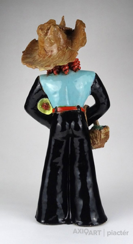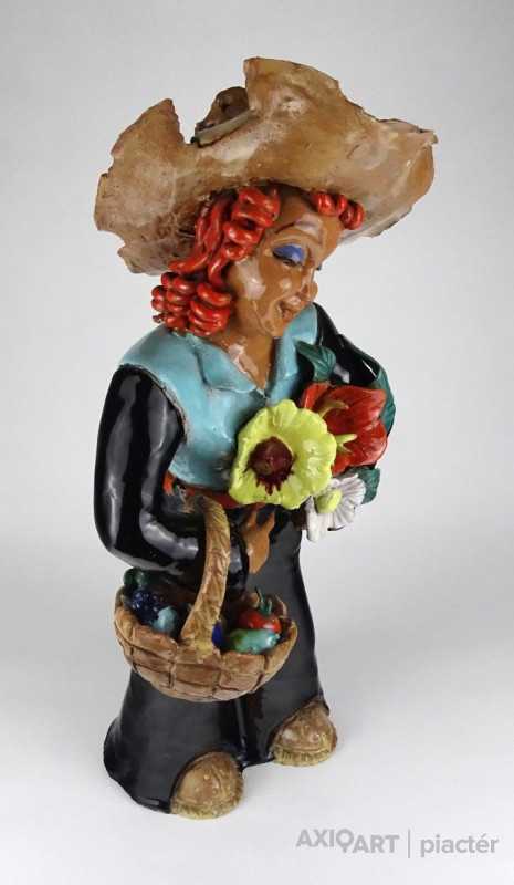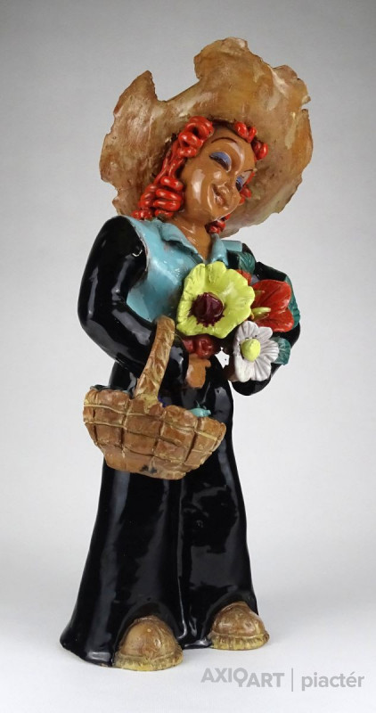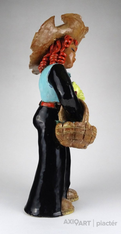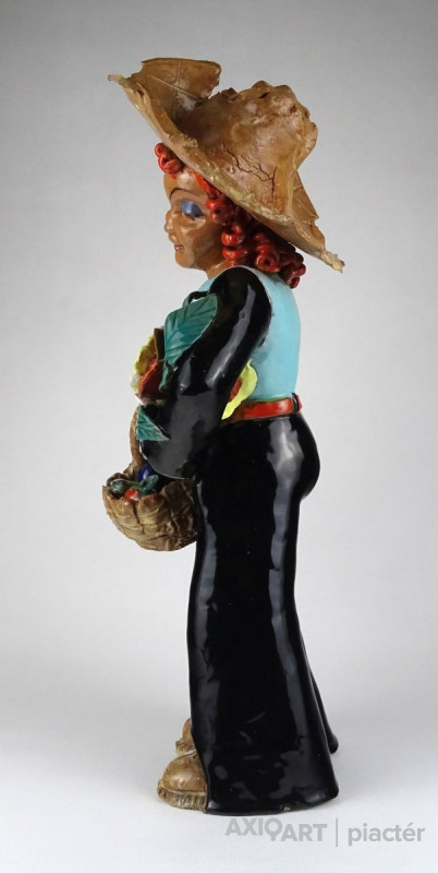 [1L422/UZ-N] Hibátlan állapotú, fekete mázas nagy méretű kerámia hölgy figura, kalapban, virágos kosárral. A kerámia profi restaurátor által javított. Kosár alján jelzés, lásd fotó. Magasság: 47 cm Szélesség: 21 cm Súly: 3.535 kg Rahmer Maria 1911-1998 A művész névének változatai Maria Rahmer; Rahmer Maria; H. Ráhmer Mária; Hartmann Lászlóné Életrajz kerámikus Budapest, 1911. - Kanada, 1998. Balett táncosnak készült, de szülei tanácsára művészeti pályára lépett. Tanulmányait 1926-29 között kerámia szakon, az Országos iparművészeti iskolában, Orbán Dezső osztályában végezte. Az iskola elvégzése után, több tanulmányutat tett Németországba és Párizsba. 1931-ben saját műhelyt nyit a IX. kerület Rákos utca 1. szám alatt. Rendszeresen kiállító művész, szinte minden jelentősebb kiállításon szerepel. 1933-ban műhelyét áthelyezi az V. kerületi Személynök utca 9-11-be. Az 1935-ös brüsszeli világkiállításon megkapja a nagyaranyérmes díszoklevelet. 1939-ben, Párizsban nyit műtermet, és 1941-ig külföldi megrendeléseit is innen teljesíti. Az egyre rosszabb magyarországi helyzet miatt 1949-ben Franciaországba emigrál. Párizsban él, és főképpen kerámiaoktatással foglalkozik, majd tanítványai kérésére Kanadába költözik, és haláláig tevékenyen részt vesz az ottani művészeti életben. Forrás: https://budapestaukcio.hu/rahmer-maria/keramikus