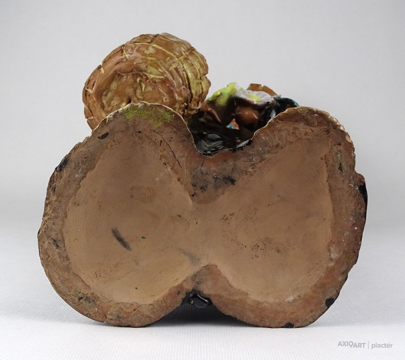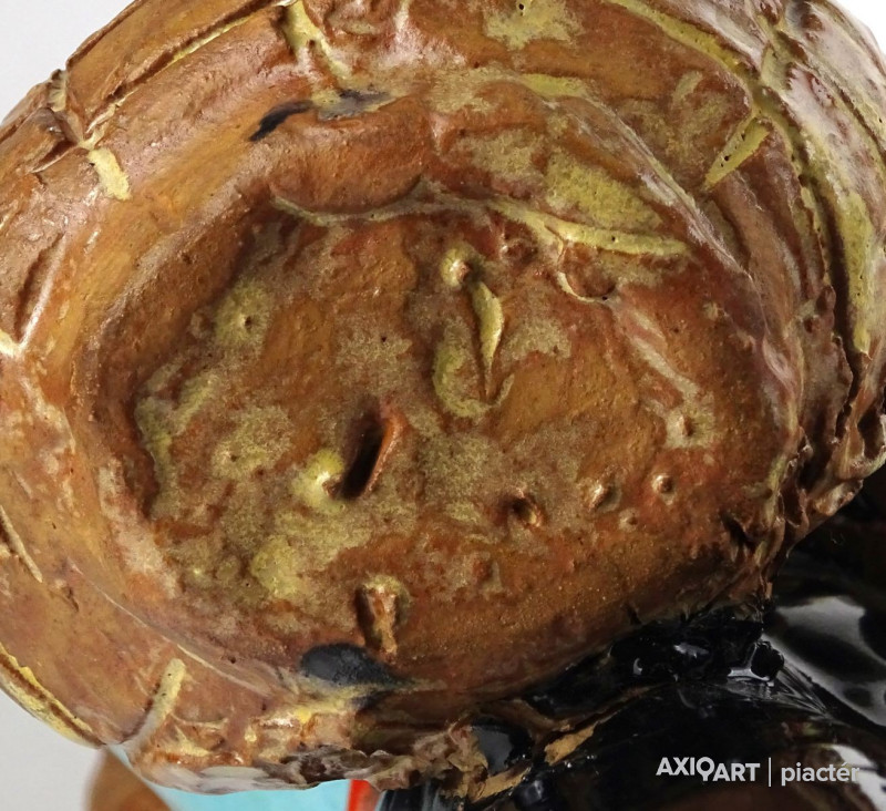 [0U704/BX-9] Hibátlan állapotú, jelzett, háromalakos kerámia figurális mécsestartó figura. Jelzés: KISS ROÓZ Magasság: 19 cm Szélesség: 6 cm Hosszúság: 16 cm Súly: 0.639 kg Kiss Roóz Ilona keramikus Születési hely: Szatmárnémeti [Satu Mare, RO] Születési dátum: 1920 Kiállítások az adatbázisban:  Kiss Roóz Ilona életműkiállítása Mesterei: Orbán Antal, Ohmann Béla. 1939-43: Iparművészeti Iskola, mesterei: Orbán Antal, Ohmann Béla. 1956, 1962: Munkácsy-díj; 1980: érdemes művész; 1984: SZOT-díj; 1994: MSZOSZ díja; 1995: Magyar Köztársasági Érdemrend Középkeresztje. A magyar kerámia Kovács Margit által teremtett naiv-népies irányzatának jeles művelője. Edényeit, kisplasztikáit, ill. murális alkotásait vidám színvilág és kedves humor jellemzi. 1948 és 1952 között tanított az Iparművészeti Főiskolán, azóta szabadfoglalkozású. Egyéni kiállítások 1966 • Csók Galéria, Budapest 1971 • Csók Galéria, Budapest 1980 • Budavári Ipaművészeti Bolt, Budapest 1984 • Petőfi Művelődési Ház, Tiszaluc 1989 • Kispréposti Palota, Eger (állandó kiállítás) 1992 • Bécs 1995 • Minigaléria, Miskolc 1996 • Petőfi Művelődési Ház, Tiszaluc 1997 • Derkovits Művelődési Központ, Tiszaújváros. Válogatott csoportos kiállítások 1947 • Karácsonyi kiállítás, Budapest • Fővárosi Művelődési Központ 1952 • Iparművészeti kiállítás, Ernst Múzeum, Budapest 1956 • Iparművészeti kiállítás, Iparművészeti Múzeum, Budapest 1958 • Magyar kerámia kiállítás, Vallauris 1959 • Magyar képzőművésznők kiállítása, Ernst Múzeum, Budapest 1959 • IV. Országos Iparművészeti Kiállítás, Műcsarnok, Budapest 1963 • Modern magyar kerámia, Royal Festival Hall, London 1965 • Országos Iparművészeti Kiállítás, Műcsarnok, Budapest 1968, 1970 • I., II. Országos Kerámia Biennálé, Pécs 1973 • Magyar kerámia, Ankara, Isztambul 1975 • Tárgy és alkotója, Iparművészeti Múzeum, Budapest 1982 • Magyar kézműves kerámia, Siklós 1995 • XX. századi magyar keramikusok, Iparművészeti Múzeum, Budapest • Az agyag mesterei, Vigadó Galéria, Budapest 1998 • Őszi Kerámia Kiállítás, Olaf Palme Ház, Budapest Művek közgyűjteményekben Köztéri művei kerámia dombormű (1958, Pereces, bölcsőde) kerámia napóra (1959, Székesfehérvár, Béke téri iskola) csempeburkolat (1961, Szeged, rendelőintézet) falikép (kerámia, 1962, Sopron, Gyermekszanatórium) kerámia falikép (1966, Békéscsaba, bölcsőde) Irodalom GÁL J.: ~ 77 éves. Beszélgetés a művésszel, Magyar Iparművészet, 1997/4. KESZTHELYI K.-LACZKÓ I.: A magyar kerámiaművészet I., Alkotók, adatok 1945-1998, Budapest, 1999. Vadas József + MAOE Forrás: artportal.hu