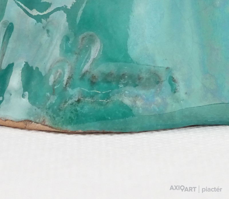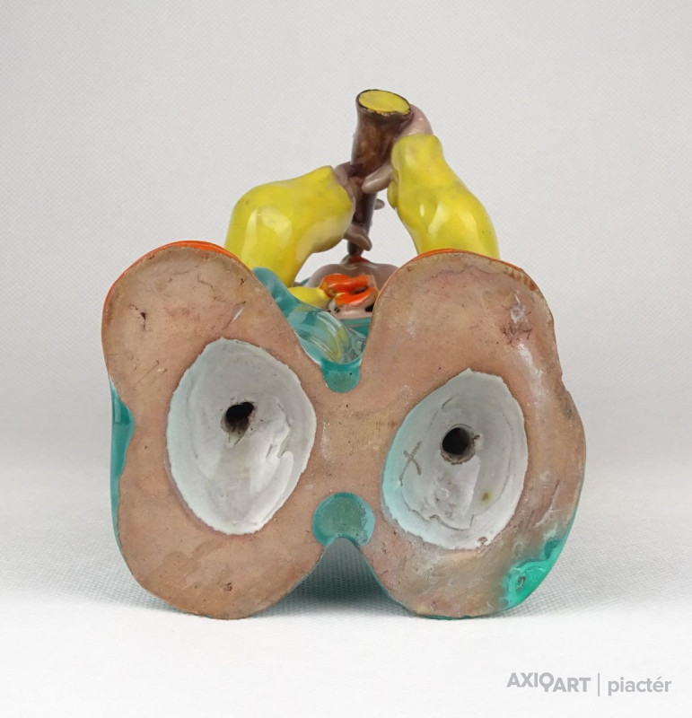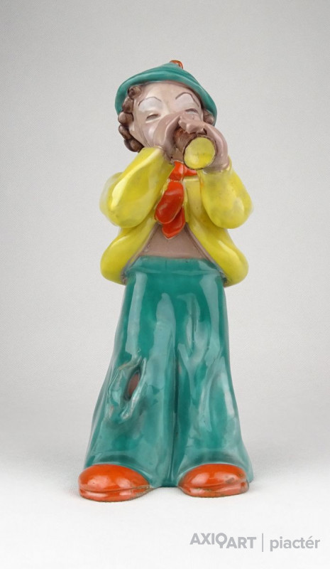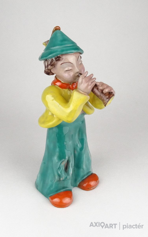 [0X396/BX-9] Hibátlan állapotú, antik mázas kerámia, furulyázó cserkész figura, tollas kalapban. A kerámia profi restaurátor által javított. Magasság: 22 cm Szélesség: 8.8 cm Súly: 0.675 kg Rahmer Maria 1911-1998 A művész névének változatai Maria Rahmer; Rahmer Maria; H. Ráhmer Mária; Hartmann Lászlóné Életrajz kerámikus Budapest, 1911. - Kanada, 1998. Balett táncosnak készült, de szülei tanácsára művészeti pályára lépett. Tanulmányait 1926-29 között kerámia szakon, az Országos iparművészeti iskolában, Orbán Dezső osztályában végezte. Az iskola elvégzése után, több tanulmányutat tett Németországba és Párizsba. 1931-ben saját műhelyt nyit a IX. kerület Rákos utca 1. szám alatt. Rendszeresen kiállító művész, szinte minden jelentősebb kiállításon szerepel. 1933-ban műhelyét áthelyezi az V. kerületi Személynök utca 9-11-be. Az 1935-ös brüsszeli világkiállításon megkapja a nagyaranyérmes díszoklevelet. 1939-ben, Párizsban nyit műtermet, és 1941-ig külföldi megrendeléseit is innen teljesíti. Az egyre rosszabb magyarországi helyzet miatt 1949-ben Franciaországba emigrál. Párizsban él, és főképpen kerámiaoktatással foglalkozik, majd tanítványai kérésére Kanadába költözik, és haláláig tevékenyen részt vesz az ottani művészeti életben. Forrás: https://budapestaukcio.hu/rahmer-maria/keramikus