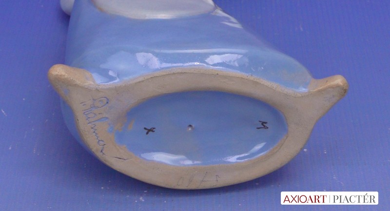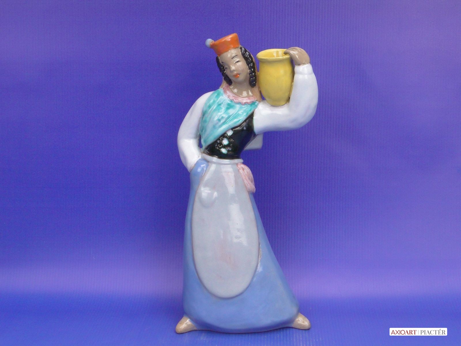 [1L422/UZ-N] Hibátlan állapotú, fekete mázas nagy méretű kerámia hölgy figura, kalapban, virágos kosárral. A kerámia profi restaurátor által javított. Kosár alján jelzés, lásd fotó. Magasság: 47 cm Szélesség: 21 cm Súly: 3.535 kg Rahmer Maria 1911-1998 A művész névének változatai Maria Rahmer; Rahmer Maria; H. Ráhmer Mária; Hartmann Lászlóné Életrajz kerámikus Budapest, 1911. - Kanada, 1998. Balett táncosnak készült, de szülei tanácsára művészeti pályára lépett. Tanulmányait 1926-29 között kerámia szakon, az Országos iparművészeti iskolában, Orbán Dezső osztályában végezte. Az iskola elvégzése után, több tanulmányutat tett Németországba és Párizsba. 1931-ben saját műhelyt nyit a IX. kerület Rákos utca 1. szám alatt. Rendszeresen kiállító művész, szinte minden jelentősebb kiállításon szerepel. 1933-ban műhelyét áthelyezi az V. kerületi Személynök utca 9-11-be. Az 1935-ös brüsszeli világkiállításon megkapja a nagyaranyérmes díszoklevelet. 1939-ben, Párizsban nyit műtermet, és 1941-ig külföldi megrendeléseit is innen teljesíti. Az egyre rosszabb magyarországi helyzet miatt 1949-ben Franciaországba emigrál. Párizsban él, és főképpen kerámiaoktatással foglalkozik, majd tanítványai kérésére Kanadába költözik, és haláláig tevékenyen részt vesz az ottani művészeti életben. Forrás: https://budapestaukcio.hu/rahmer-maria/keramikus