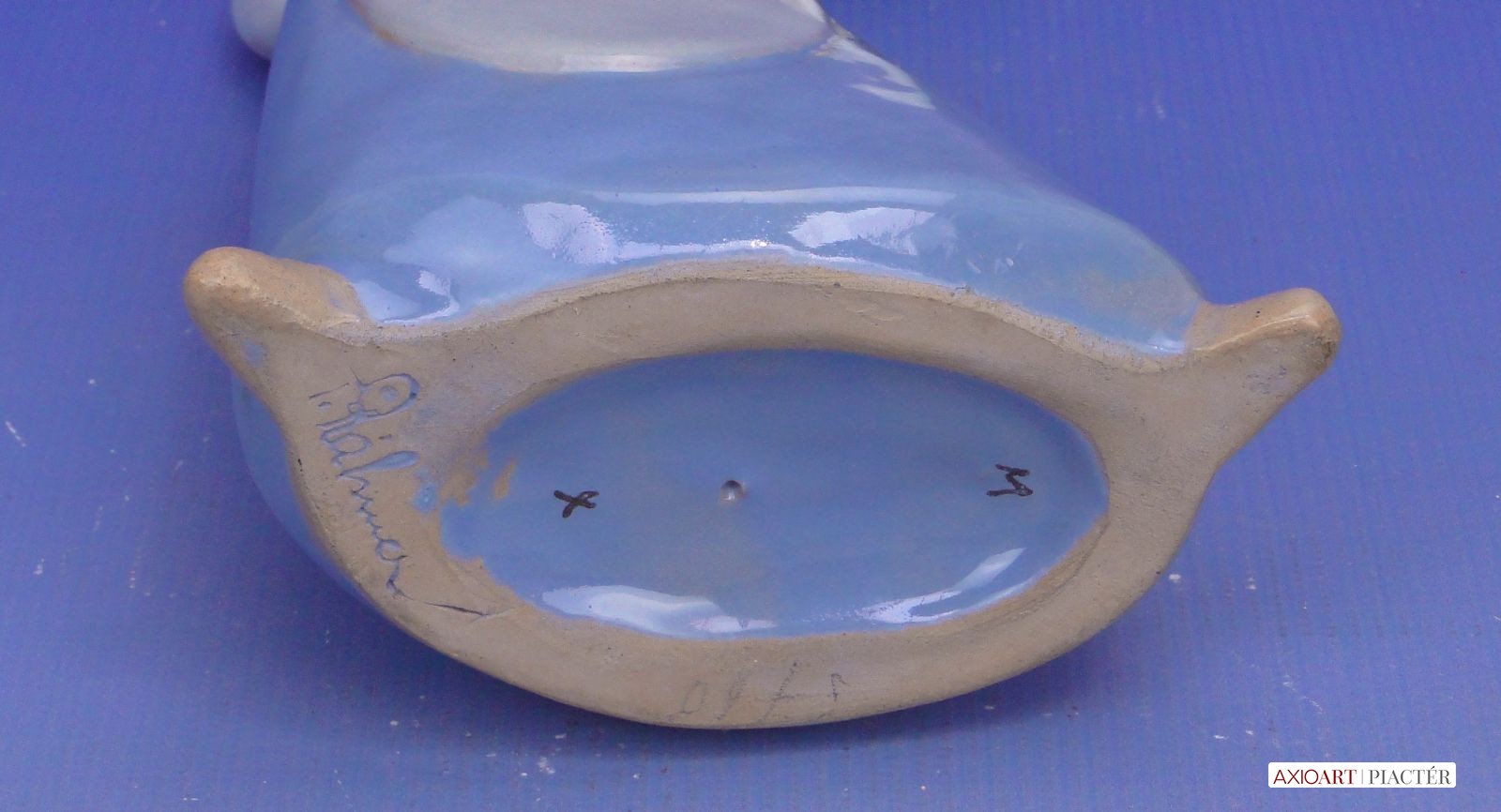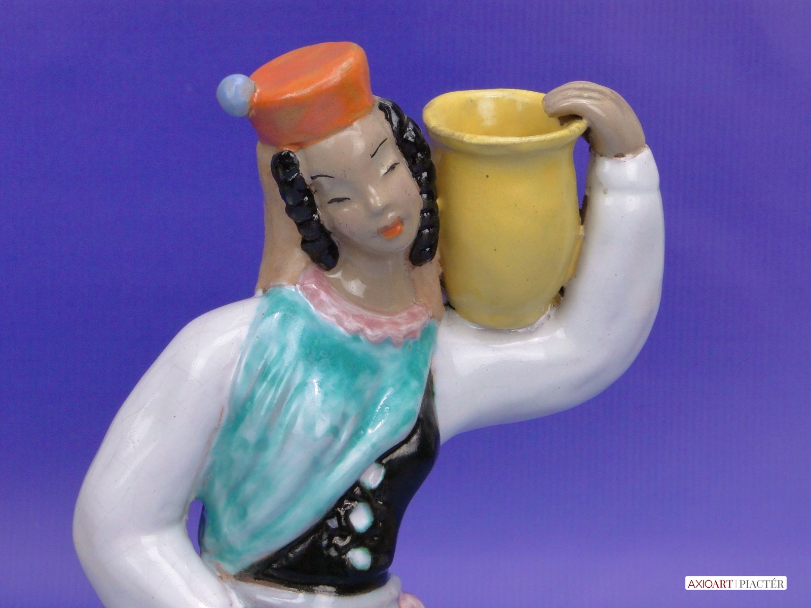 [0X396/BX-9] Hibátlan állapotú, antik mázas kerámia, furulyázó cserkész figura, tollas kalapban. A kerámia profi restaurátor által javított. Magasság: 22 cm Szélesség: 8.8 cm Súly: 0.675 kg Rahmer Maria 1911-1998 A művész névének változatai Maria Rahmer; Rahmer Maria; H. Ráhmer Mária; Hartmann Lászlóné Életrajz kerámikus Budapest, 1911. - Kanada, 1998. Balett táncosnak készült, de szülei tanácsára művészeti pályára lépett. Tanulmányait 1926-29 között kerámia szakon, az Országos iparművészeti iskolában, Orbán Dezső osztályában végezte. Az iskola elvégzése után, több tanulmányutat tett Németországba és Párizsba. 1931-ben saját műhelyt nyit a IX. kerület Rákos utca 1. szám alatt. Rendszeresen kiállító művész, szinte minden jelentősebb kiállításon szerepel. 1933-ban műhelyét áthelyezi az V. kerületi Személynök utca 9-11-be. Az 1935-ös brüsszeli világkiállításon megkapja a nagyaranyérmes díszoklevelet. 1939-ben, Párizsban nyit műtermet, és 1941-ig külföldi megrendeléseit is innen teljesíti. Az egyre rosszabb magyarországi helyzet miatt 1949-ben Franciaországba emigrál. Párizsban él, és főképpen kerámiaoktatással foglalkozik, majd tanítványai kérésére Kanadába költözik, és haláláig tevékenyen részt vesz az ottani művészeti életben. Forrás: https://budapestaukcio.hu/rahmer-maria/keramikus