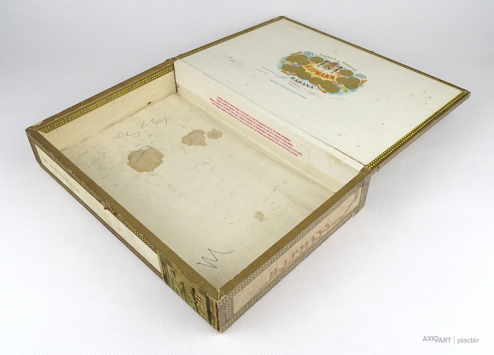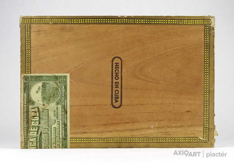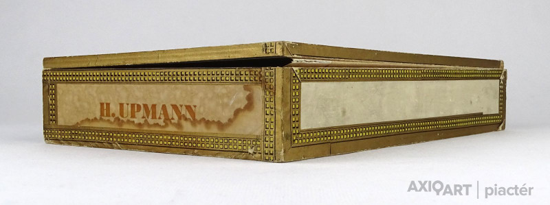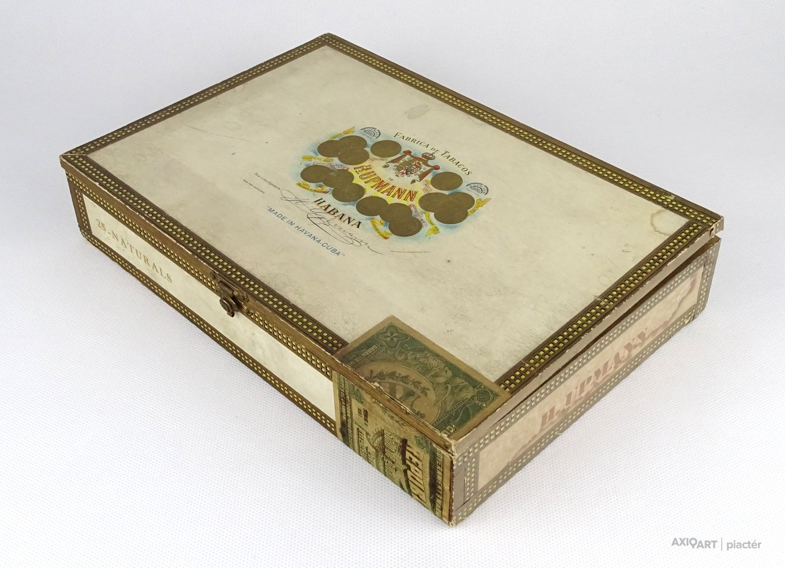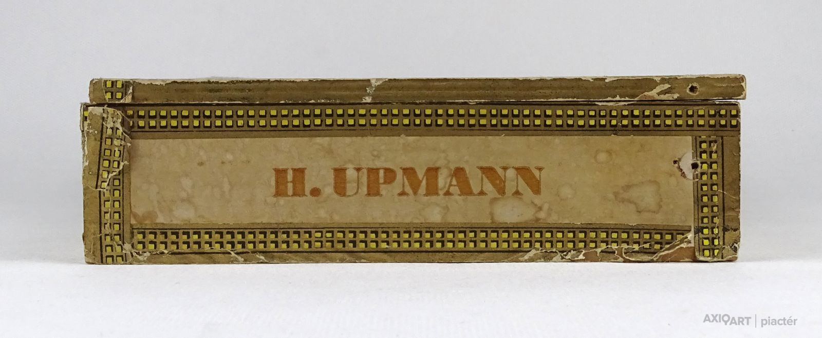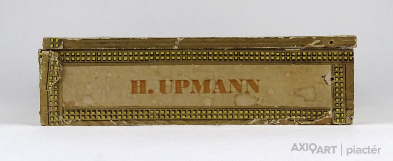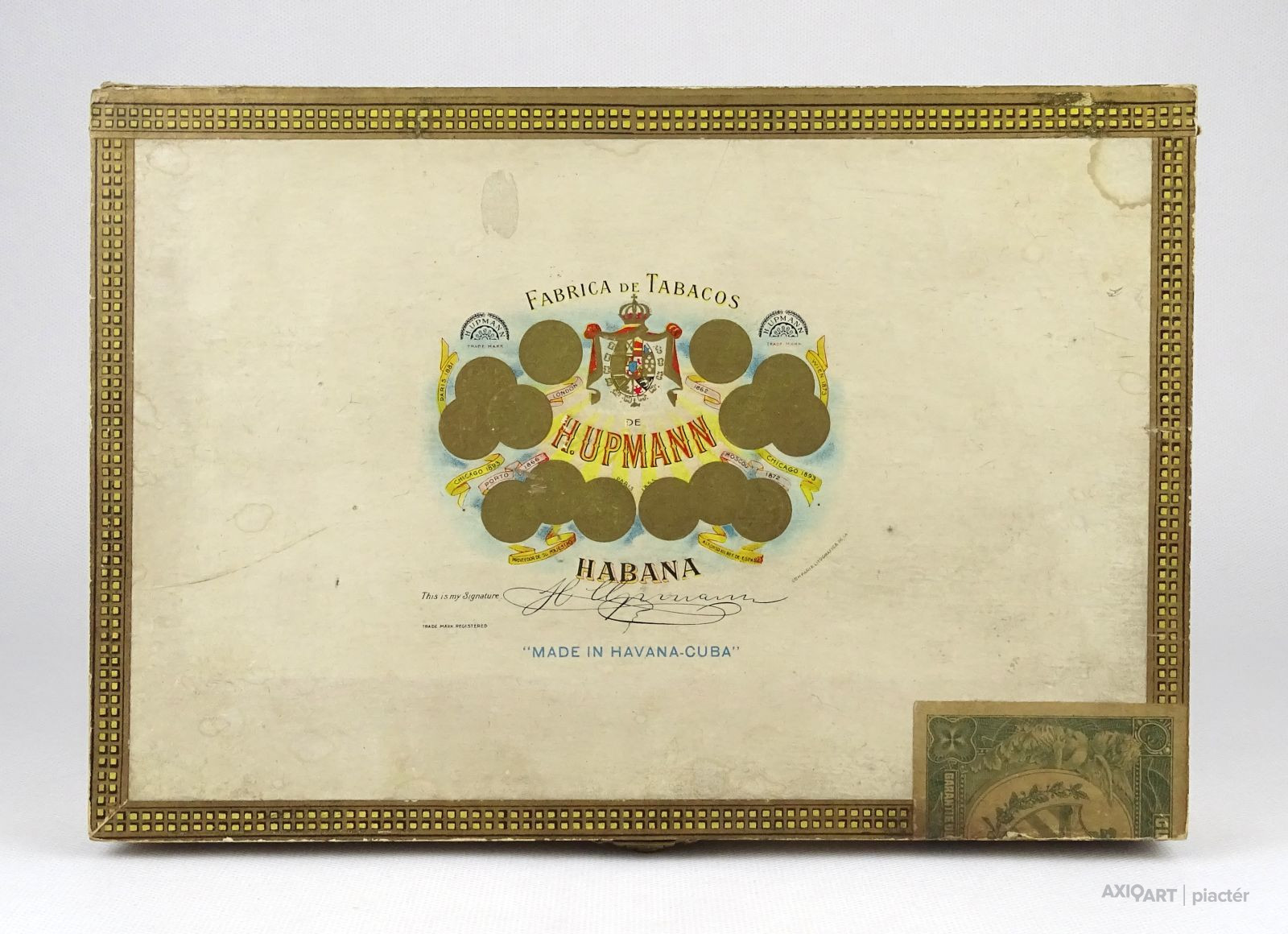 [1M593/X012] Nyitható fedelű, feliratos szivaros fa doboz. Rajta 1912-es zárjegy, lásd fotó. Gyönyörű díszes réz kapoccsal rendelkezik. Feliratok: FABRICA DE TABACOS H.UPMANN HABANA MADE IN HAVANA CUBA MECHO EN CUBA Magasság: 5 cm Szélesség: 17.5 cm Hosszúság: 25.7 cm Súly: 0.36 kg