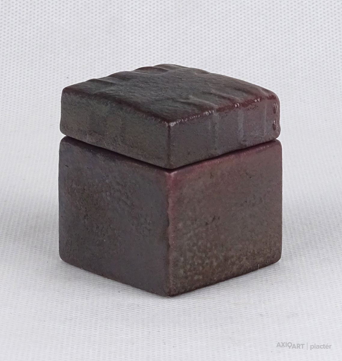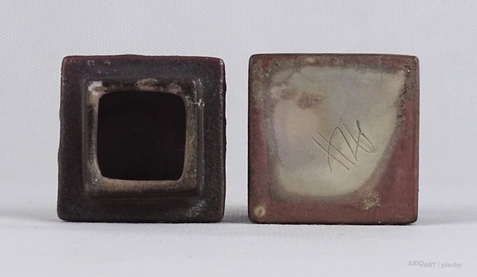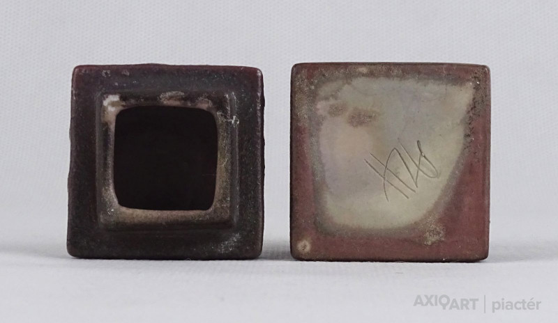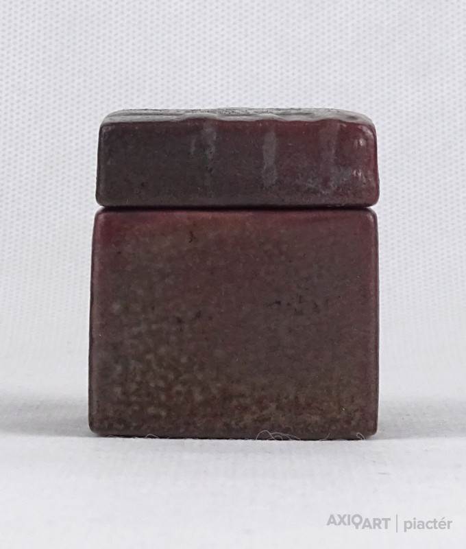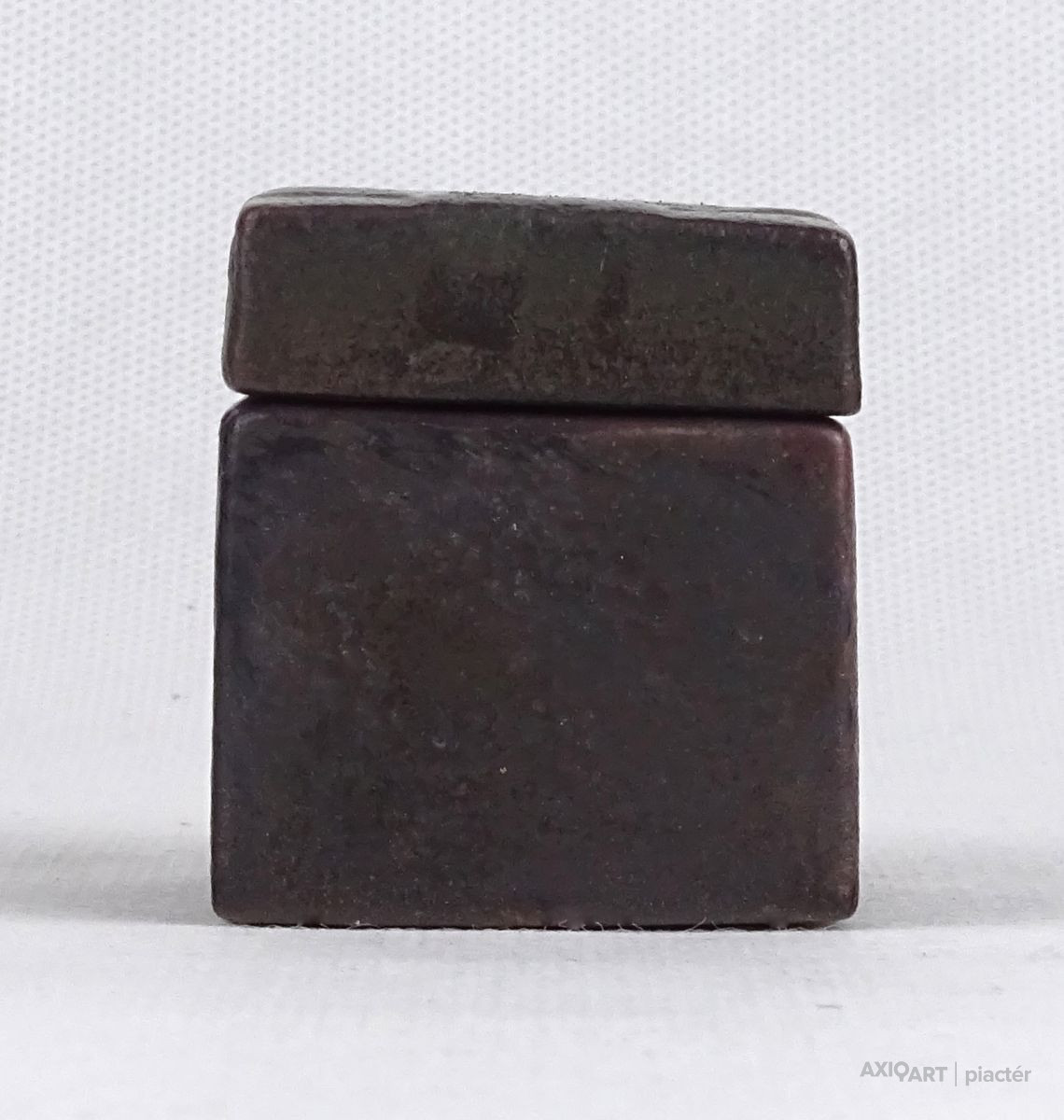 [1S702/X199] Hibátlan állapotú, kis méretű, kocka alakú modern mázas ékszertartó szelence. Alján nehezen olvasható karcolt jelzés: H L (?) Magasság: 5 cm Szélesség: 4.3 cm Hosszúság: 4.4 cm Súly: 0.095 kg HABER Szilvia keramikus (Budapest, 1971. március 15.–) 1995: Magyar Iparművészeti Főiskola; 1997: mesterképző a Kecskeméti Nemzetközi Kerámia Stúdióban. 1991: Domanovszky-pályázat I. díj; 1997: Moholy-Nagy László-ösztöndíj; 1998: Ipari Formatervezési Pályaművek kiállítása, nívódíj. Szabadfoglalkozású művész, 1997-től a Lito-Lux Kft. egyedi üvegmozaik, műmárvány és terazzo-padlóburkolatait tervezi. Munkásságára az állati és növényi formák alkalmazása jellemző, illetve mozdulatok átírása kerámia és porcelán tárgyakra (1992-95), majd porcelán plasztikák és szeleteinek, mint fossziliáknak megjelenítése terazzo-padlólapokon. Forrás: galeriasavaria.hu