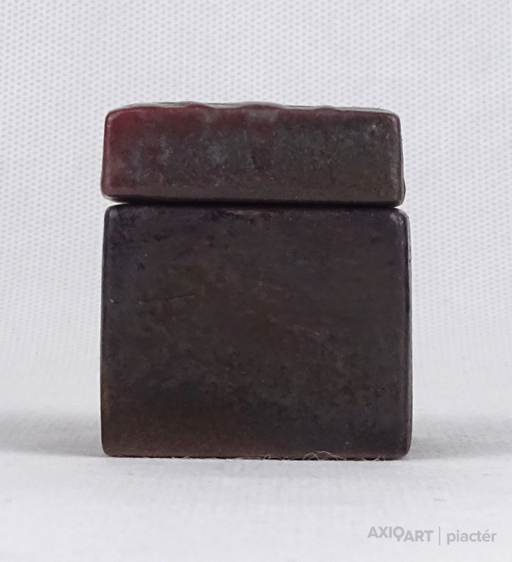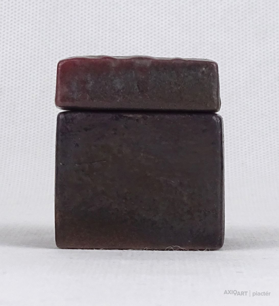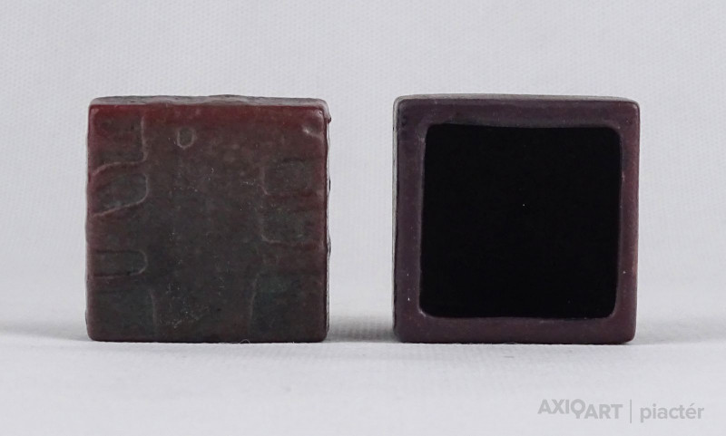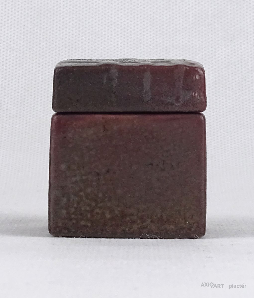 [1S702/X199] Hibátlan állapotú, kis méretű, kocka alakú modern mázas ékszertartó szelence. Alján nehezen olvasható karcolt jelzés: H L (?) Magasság: 5 cm Szélesség: 4.3 cm Hosszúság: 4.4 cm Súly: 0.095 kg HABER Szilvia keramikus (Budapest, 1971. március 15.–) 1995: Magyar Iparművészeti Főiskola; 1997: mesterképző a Kecskeméti Nemzetközi Kerámia Stúdióban. 1991: Domanovszky-pályázat I. díj; 1997: Moholy-Nagy László-ösztöndíj; 1998: Ipari Formatervezési Pályaművek kiállítása, nívódíj. Szabadfoglalkozású művész, 1997-től a Lito-Lux Kft. egyedi üvegmozaik, műmárvány és terazzo-padlóburkolatait tervezi. Munkásságára az állati és növényi formák alkalmazása jellemző, illetve mozdulatok átírása kerámia és porcelán tárgyakra (1992-95), majd porcelán plasztikák és szeleteinek, mint fossziliáknak megjelenítése terazzo-padlólapokon. Forrás: galeriasavaria.hu