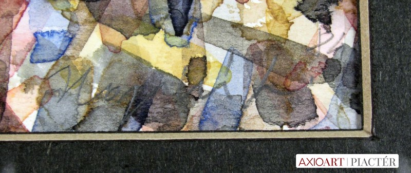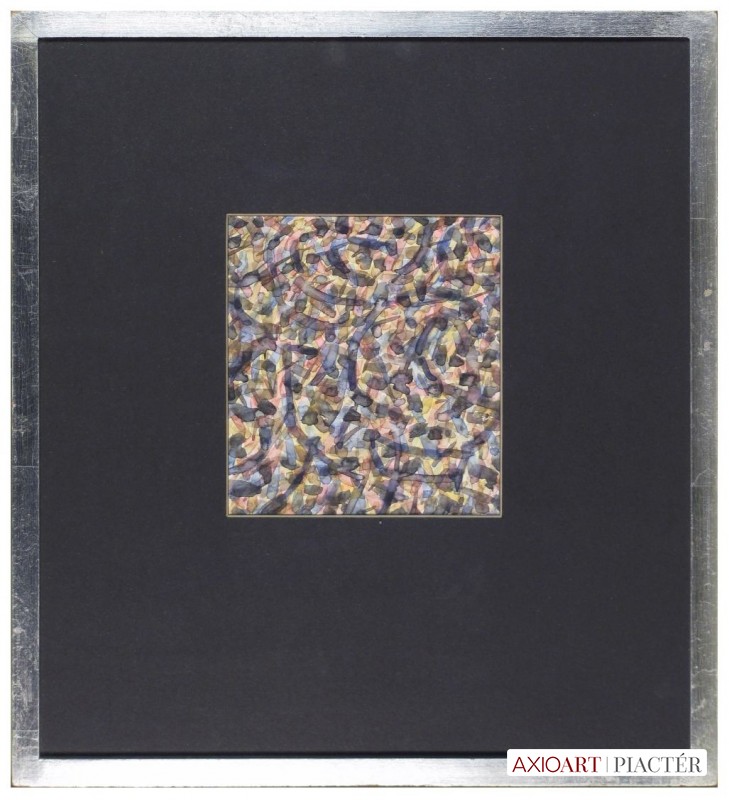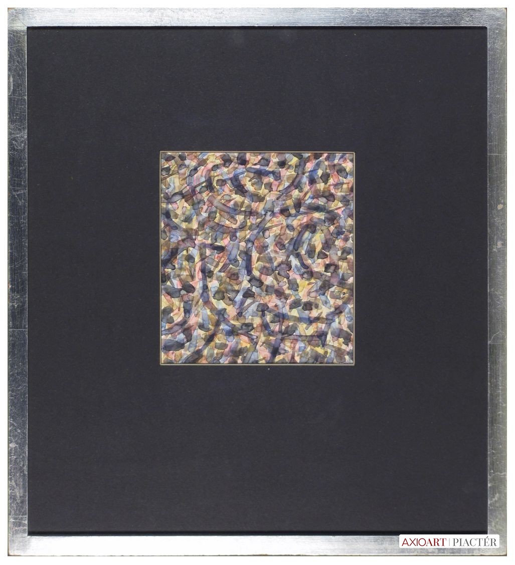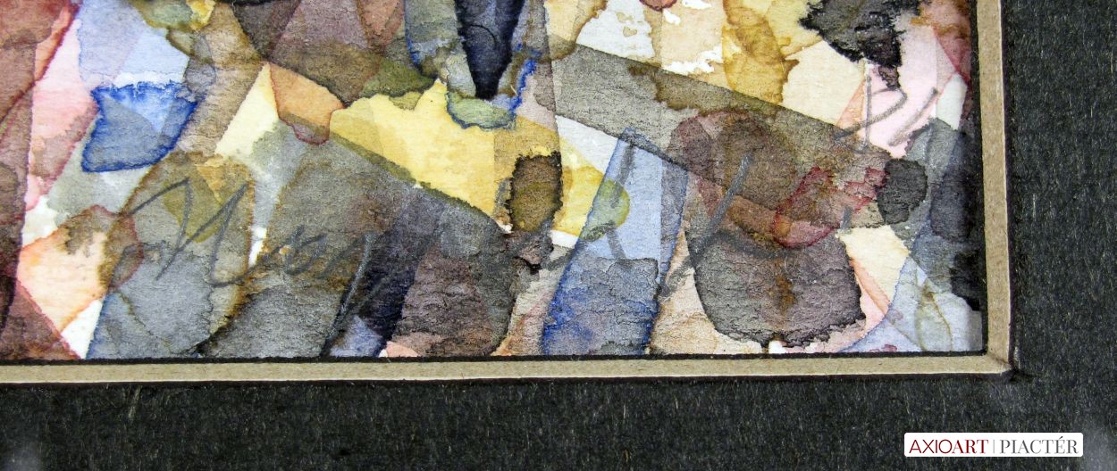 [FKA432/Bp205/61] A kép mérete: 17 x 15 cm keret nélkül. Készült: Akvarell, Papír A kép Hajdú László (Léva, 1938) alkotása. Jelezve jobbra lent "Hajdú L. 84" A festmény jó állapotban van. Keret: Ép Kortárs magyar művészeti lexikon I-III. Festő. Léva, 1938. dec. 17. 1957-63: MKF, mesterei: Domanovszky Endre, Kádár György, Barcsay Jenő. 1964-ben Stuttgart; München; 1971-ben Francia-, Olaszország; 1977-ben Pocitelju (YU) Nközi Művésztelep; 1965-82 között adriai-, égei-, földközi-tengeri utazásokat tett. 1966-69 között Derkovits-ösztöndíjas. 1984-ben elnyerte a Szentendrei Grafikai Műhely nagydíját. Alapító tagja a Szentendrei Grafikai Műhelynek, az Art'éria Galériának. 1989-től 1991-ig a Belvedere c. művészeti folyóirat képszerkesztője. 1968-tól Szentendrén él. Soha nem a naturalisztikus formától vagy konkrét tájélményből indul el a lírai absztrakt foltfestészet felé, hanem a természeti erők: víz, levegő, föld formáját kutatja. A 80-as évekre egy új tendencia mutatkozik az oeuvre-ben: az érzékeny, indulatosan megfestett felület mögül idolok, ferde tornyok sejlenek fel, sarkukra állított négyzetek állnak a pszeudohorizonton. A 90-es évek elején összefoglaló igényű kiállítást rendez a budapesti Francia Int.-ben, neogeometrikus sorozataiban Saint-John Perse gondolataira hivatkozva. Ezeken a munkákon mediterrán hangulatú emlékanyagra utalnak a mértanias formák. Négyzetei nem síkgeometriai jelek, hanem kultúrhistóriai szimbólumok. A 90-es évek derekára Hajdú festészete egyre filozofikusabbá válik. Tábláin okkerek, sárgák, szürkék különféle árnyalatai töltik ki a képmezőt. A felületet sötét, határozott vibrálások, diagonálisok, horizontális rendek tagolják. Archetipikus hangulatú munkáinak legjellemzőbb vonása a tér virtuális felosztása. Hajdú piktúrája mégis tartalmat szociális vonatkozásokat, amennyiben festészetét a monetáris világ elleni halk, de határozott tiltakozásnak tekinti. Ek.: 1975: Művésztelepi G., Szentendre, (kat.); 1977: Műcsarnok (kat.); 1986: Hotel Kastély G., Szirák; 1989: Dorottya u.-i G. (kat.); 1990: Francia Int., Bp., (kat.); 1991: Kunstsammlungen der Stadt Limburg (Farkas Ádámmal és Regős Istvánnal); 1992: Art'éria G., Szentendre; 1996: Kanzlei Gartner; Stübel, Baumann & Partner, Stuttgart; 1997: Kaposfüredi G., Kaposfüred. Vcsk: 1966: Stúdió '66, Ernst Ml; 1971: Új művek, Műcsarnok; 1976: Szentendrei Művészet, MNG; 1978: Festészet '77, Műcsarnok; 1983: Szentendrei Tárlat, Szentendrei Képtár, Szentendre; 1985: El Studio Grafico de Szentendre, Madrid; 1985: Szentendrei Tárlat, Szentendrei Képtár; 1986: Delmenhorst Zeitgenössische Kunst aus Ungarn; 1987: Art'éria G. kiállítása, Stadtm., Woerden (NL); Szentendrei Tárlat, Szentendrei Képtár, Szentendre; 1990: Otto Nagel, Hans der Staatlichen M., Berlin; 1993: Szentendre művészete, G. Contact, Böblingen (D); Az Art'éria művészei, Vigadó G.; 1996: Az én Múzeumom, A Vass-gyűjtemény, Ernst M.; 15 magyar művész, Hans Des Deutschen Oftens, München. Mk: Dajmanich J. M., Szolnok; Ferenczy M., Szentendre; MNG; Nközi Modern M., Hajdúszoboszló; R. Riz Collection, Bolzano; Kim Colleciton, Szöul. Km: mozaik (1970, Lábatlan, Papírgyár); gobelin (1970, Lábatlan, Papírgyár); mozaik (1983, Bp., Pest megyei Köjál) Irod.: Mucsi A.: Előszó Hajdú kiállításához (kat., bev., Szentendre, 1975); Mucsi A.: Előszó Hajdú kiállításához (kat., bev., Műcsarnok, 1977); Horváth Gy.: Hajdú képei a Műcsarnokban, Új Tükör, 1977. márc. 6; Hann F.: Mai mitológiák Hajdú kiállítása a Dorottya utcában, Belvedere, 1989/2; Wehner T.: (kat., előszó, Dorottya u. G.); Van Dam J.: Utazás a háromszög körül. Hajdú képeiről, MŰV. 1989/9; Hann F.: (kat., előszó, Francia Int., Bp.); Hann F.: HL-GEO, Playboy G., 1993; Wehner T.: Ék-képek. Hajdú festészetéről, Kortárs, 1994/7.; Sík Cs.: Mégsem veszett el. Hajdú retrospektív katalógusa, 1996; Krimmel G.: Helyzetek és érzetek. Hajdú festészete, ÚJ, 1997. máj-jún. Portréfilm: Gulyás J.: Hajdú kiállítása a Kaposfüredi Galériában MTV, 1997 (H.F.) Magyar festők és grafikusok életrajzi lexikona I-II. Műgyűjtők és kereskedők kézikönyve Léva, 1938 - Festő. Székesfehérvárott Áron Nagy Lajos szakkörében ismerkedett meg a rajzolás és festés alapelemeivel. A bp.-i Képzőművészeti Főiskolán Domanovszky Endre és Kádár György tanítványa volt. A főiskola után két évig általános iskolában tanított. 1969 óra Szentendrén dolgozik és azóta szerepel különböző hazai és külhoni tárlatokon. Sokszor szerepelt országos tárlatokon, Stúdió Kiállításokon. 1974-ben bemutatkozott Párizsban is, a fiatal magyar festők tárlatán. 1967-1970 k. Derkovits-ösztöndíjban részesült. Színgazdag műveinek tárgya a természet és a tenger. Lendületes ecsetvonásokkal alakít ki vibráló, lüktető foltokat. Festői előadása a nonfiguráció kereteiben mozog. Táblaképei mellett jelentősek kárpitjai, kék, fekete, szürke, barna színekre komponált faliszőnyegei. Mozaiktervezéssel is foglalkozik. (MÉ, M.M.: Műv.-1970/9, K.Gy.: műv.-1970/10, Máv.-1977/1) Magyar festők és grafikusok életrajzi lexikona I-II. Léva, 1938 - Festő. Székesfehérvárott Áron Nagy Lajos szakkörében ismerkedett meg a rajzolás és festés alapelemeivel. A budapesti Képzőművészeti Főiskolán Domanovszky Endre és Kádár György tanítványa volt. A főiskola után két évig általános iskolában dolgozott, mint pedagógus. 1968 óta Szentendrén dolgozik és azóta szerepel hazai és külhoni tárlatokon. Sokszor szerepelt országos bemutatókon, Stúdió kiállításokon. 1974-ben bemutatkozott Párizsban is, a fiatal magyar festők tárlatán. 1967-1970 között Derkovits-ösztöndíjban részesült. Német-, Francia- 