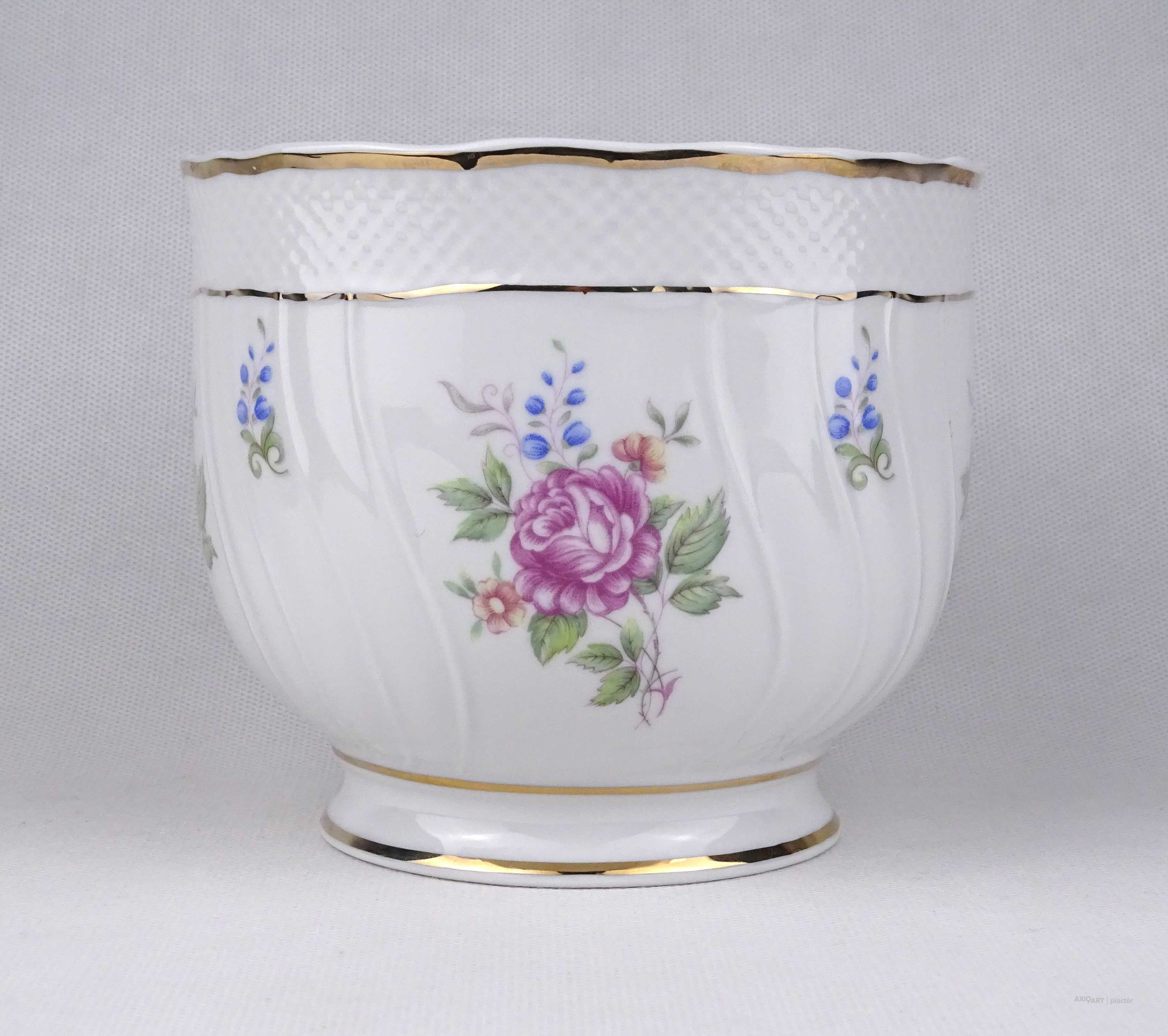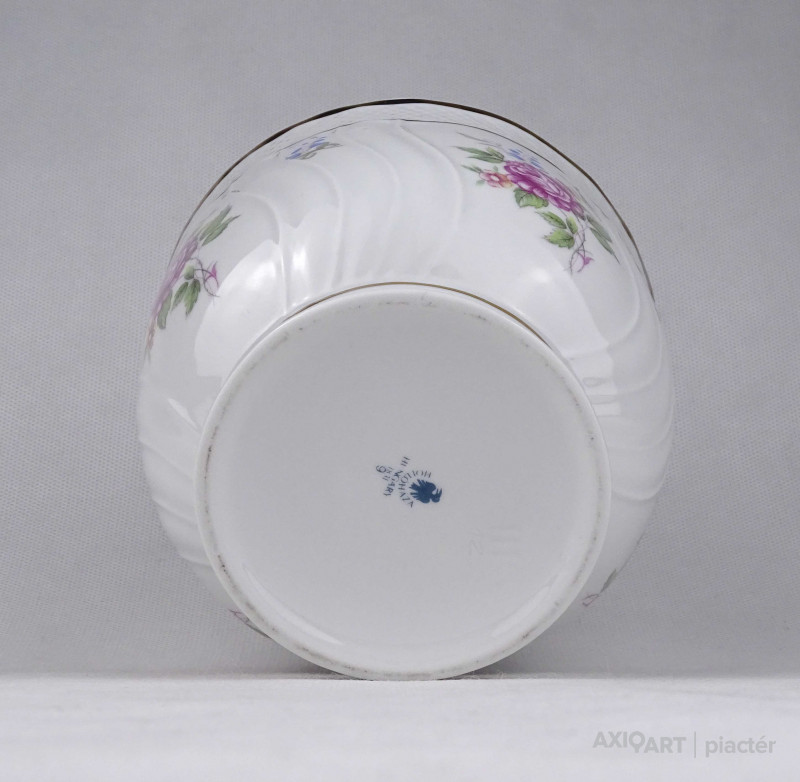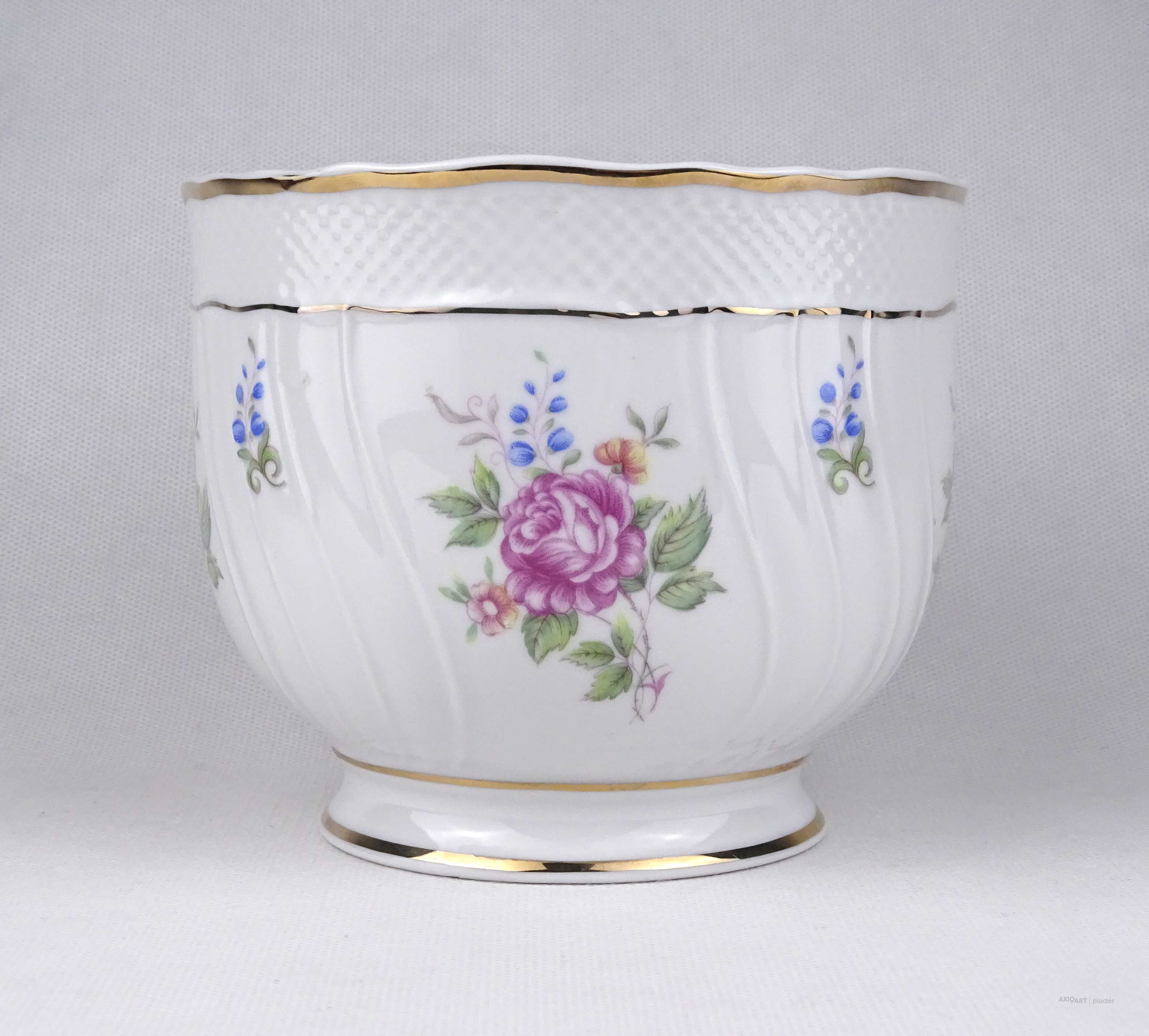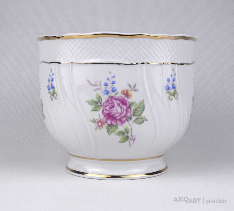 [1U757/X111] Hibátlan állapotú, aranyozott Hajnalka mintás jelzett Hollóházi porcelán kaspó. Alján kék jelzés: HOLLÁHÁZA HUNGARY 1831 Magasság: 11.5 cm Szélesség: 13.5 cm Súly: 0.52 kg
