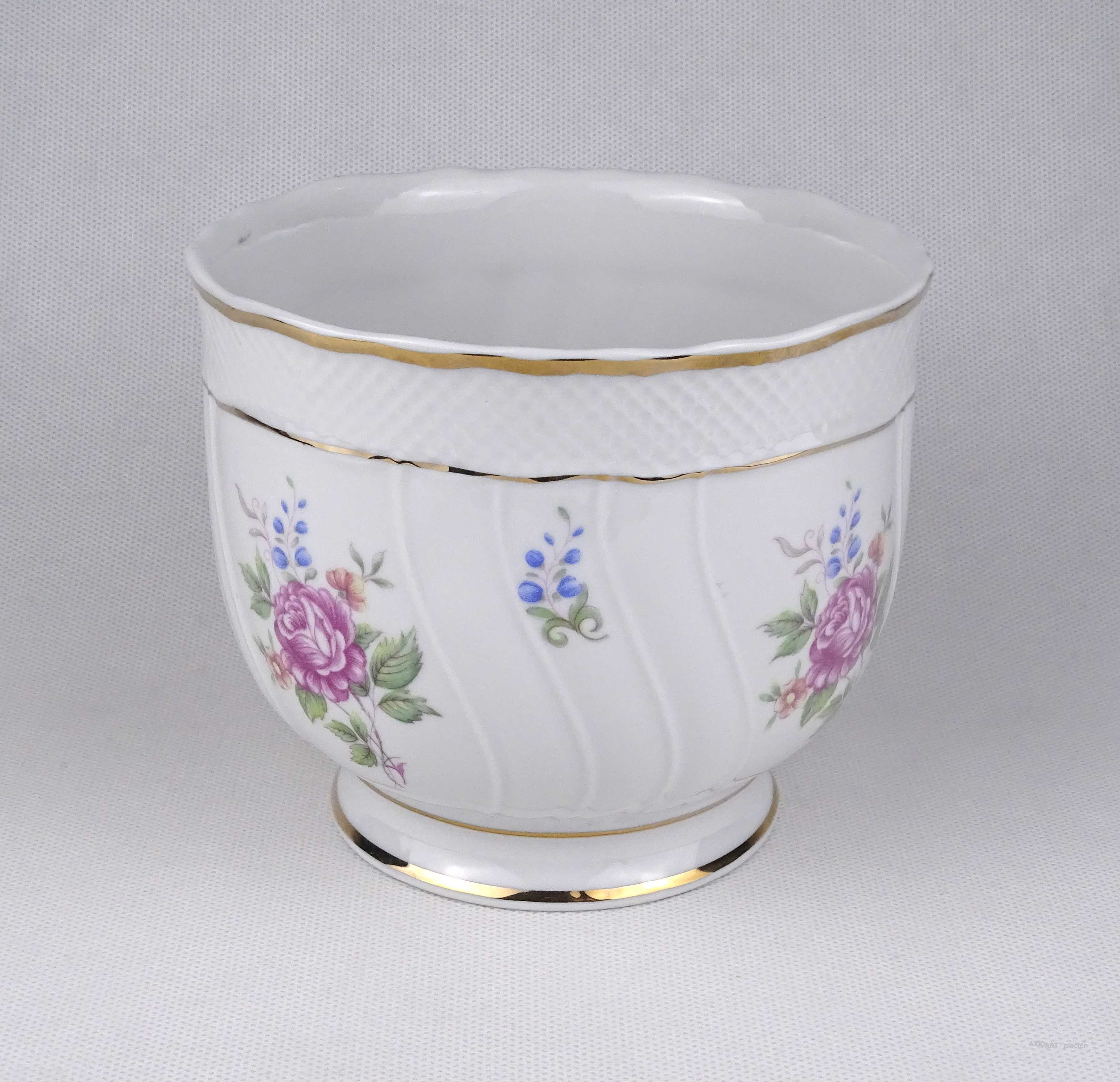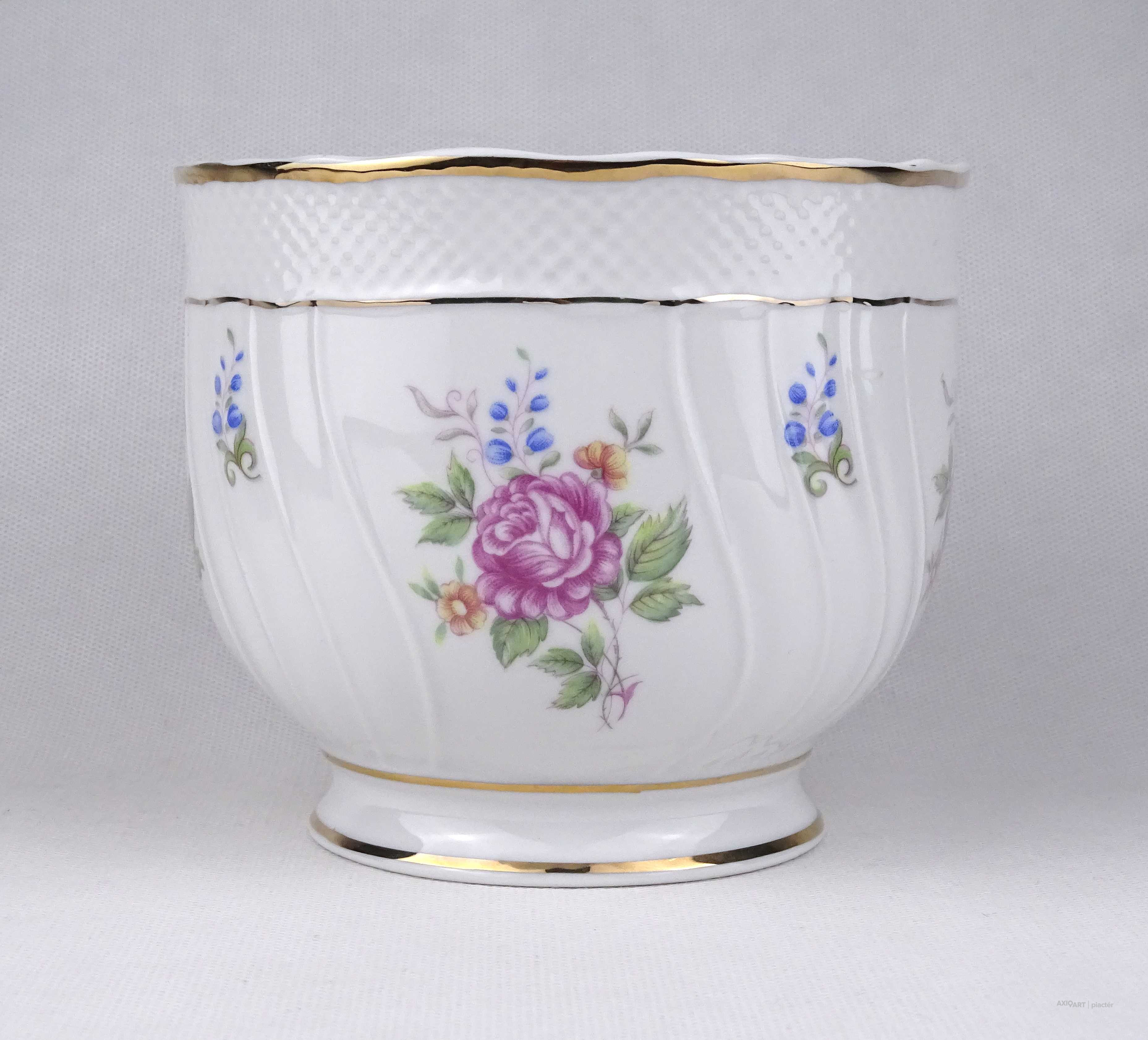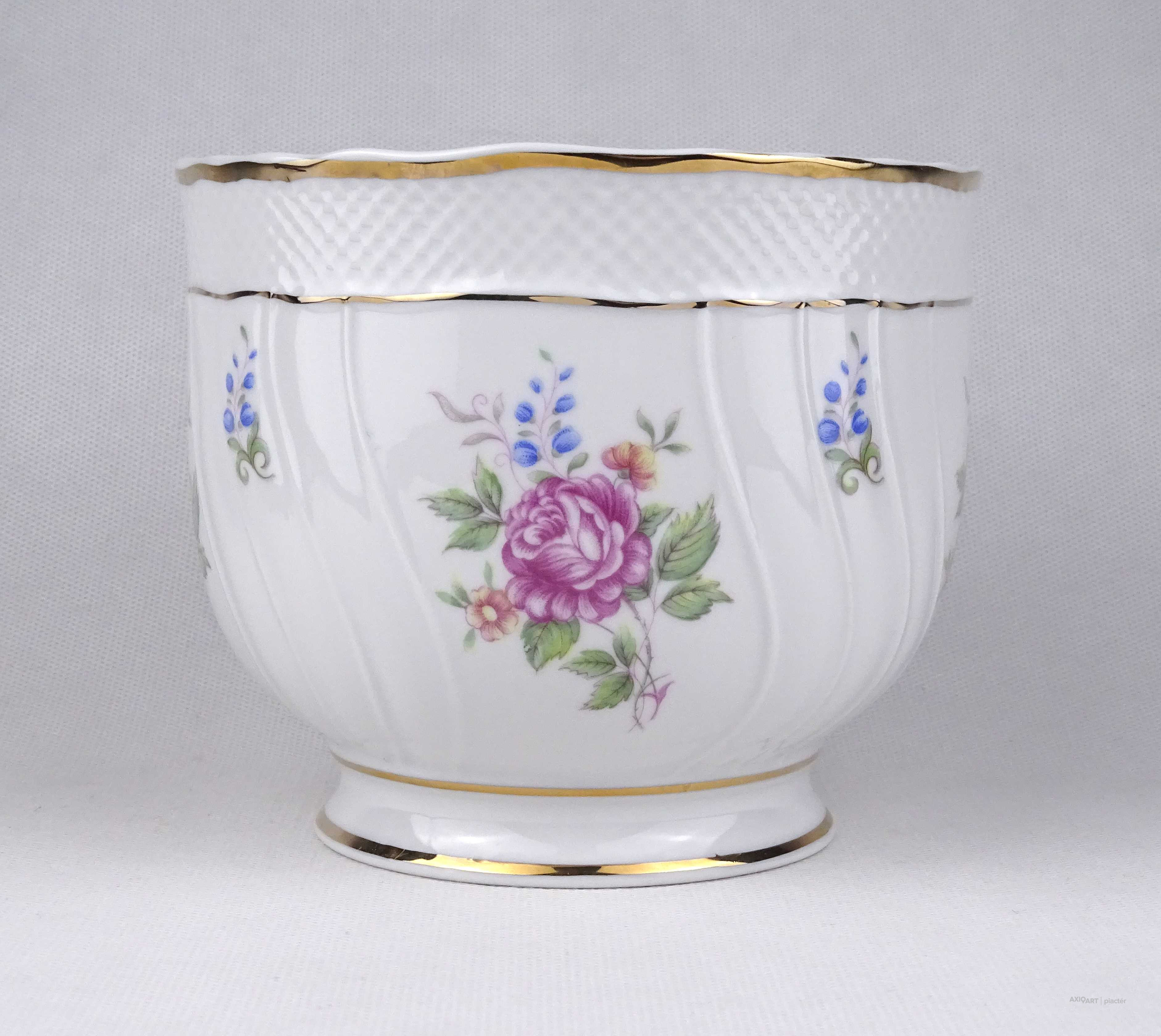 [1U757/X111] Hibátlan állapotú, aranyozott Hajnalka mintás jelzett Hollóházi porcelán kaspó. Alján kék jelzés: HOLLÁHÁZA HUNGARY 1831 Magasság: 11.5 cm Szélesség: 13.5 cm Súly: 0.52 kg
