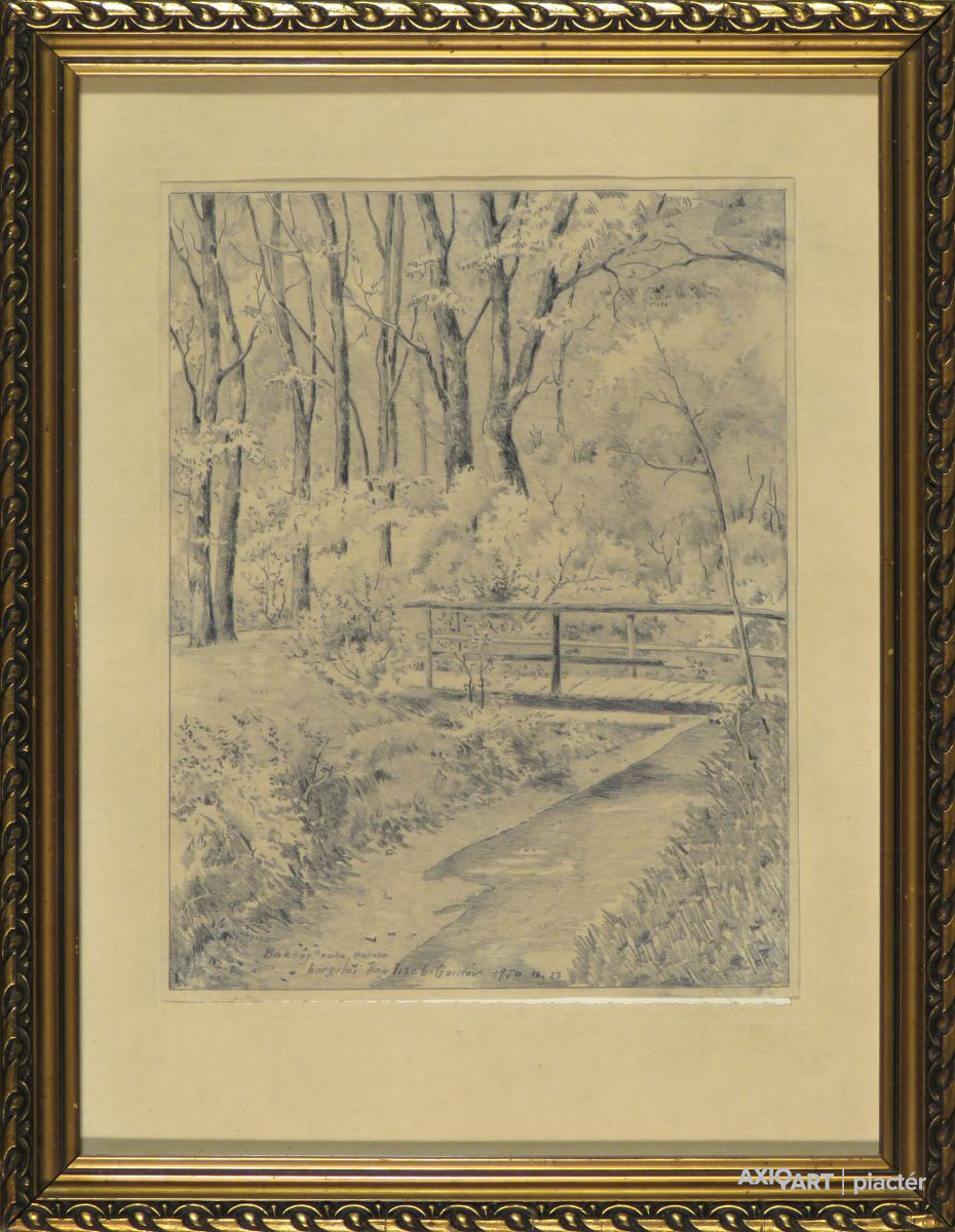 [FKC087/Bp305/187] A kép mérete: 23 x 17,5 cm keret nélkül. Készült: Ceruzarajz, Papír A kép hargitai Hawlisch Gusztáv jelzéssel magyar művész 1950 alkotása. Jelezve jobbra lent "Bakony Cuha patak hargitai Hawlisch Gusztáv 1950. IX. 23." A festmény jó állapotban van. Keret: Ép