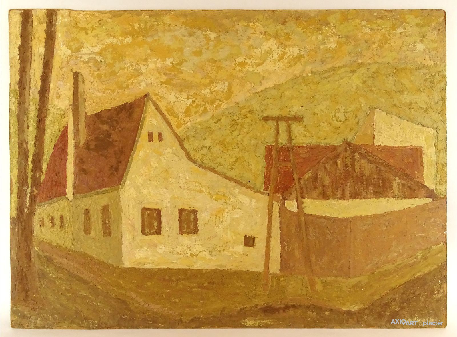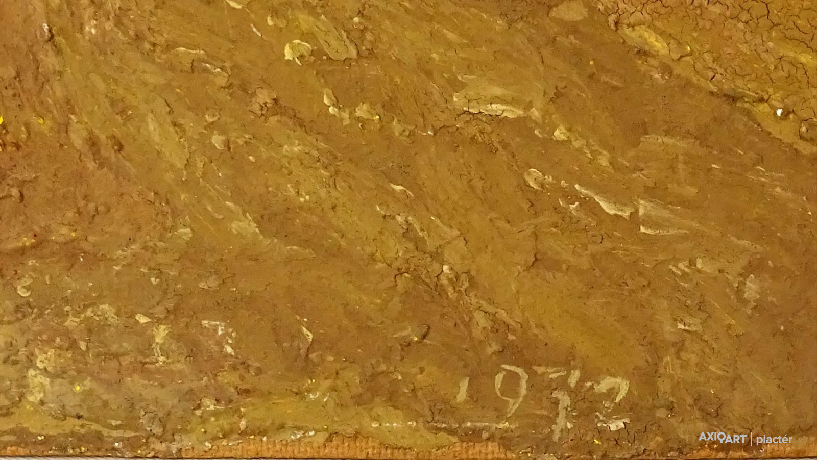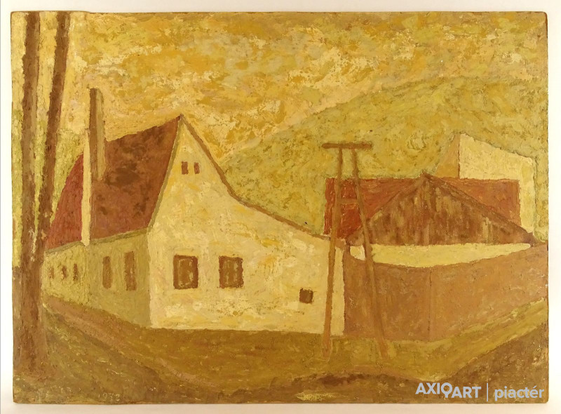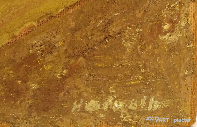 [FK0037/Z018] A kép mérete: 50 x 70 cm keret nélkül. Készült: Olaj, Vászon A kép Paizs László (Szentpéterúr, 1935) alkotása. Jelezve Jobbra lent "P. L." A festmény jó állapotban van. Keret: Ép A festmény hátoldalán a Képcsarnokvállalat címkéje található. Magyar festők és grafikusok életrajzi lexikona I-II. Festő. Tanulmányait a budapesti Iparművészeti Főiskolán végezte 1959-ben. Z. Gács György, Rákosy Zoltán és Szentiványi Lajos növendéke volt. A '60-as évek első felében hagyományosabb felfogású olajképeket festett, mozaikokat, freskókat, utóbb a pop-art körébe tartozó, a francia Arman munkáival rokon műveket alkotott. 1961 óta kiállító művész. Egyéni (Fényes Adolf Terem, Csók Galéria, Műcsarnok, Magyar Nemzeti Galéria, Halászbástya, Bástya Galéria, Vigadó Galéria, Budapest Galéria, Győr, Szombathely, Szeged, Zalaegerszeg, Duisburg, Aix-en-Provence, stb). és vegyes (Ernst Múzeum, Műcsarnok, Óbuda Galéria, Magyar Nemzeti Galéria, Csók Galéria, Vigadó Galéria, Székesfehérvár, Kaposvár, Pécs, Hódmezővásárhely, Firenze, Milano, Padova, Nápoly, Velence, Düsseldorf, Aachen, Genf, stb) tárlatokon vett részt. 1980-ban Munkácsy-díjjal jutalmazták, 1988-ban Érdemes Művész kitüntető elismerésben részesült. Munkáit őrzi a Magyar Nemzeti Galéria, a Fővárosi Képtár, a szombathelyi képtár, a pécsi Janus P. Múzeum, a székesfehérvári István Király Múzeum és a dunaszerdahelyi Kortárs Magyar Galéria. (H.B.: Műv, 1972/4, K.Gy.: Műv. 1977/2, K.G.: Műv. 1978/10, M.L.: Műv, 1983/5, R.G.: Műv, 1987/9, Sz.Gy.: Új Műv. 1995/4, MK) Magyar festők és grafikusok életrajzi lexikona I-II. Műgyűjtők és kereskedők kézikönyve Festő. Tanulmányait a bp.-i Iparművészeti Főiskolán végezte. Mozaikokat ferskókat, utóbb a pop-art körébe tartozó, a francia Arman műveivel rokon műveket alkotott. Mozaikok: a Szegedi Megyei Tanács, a Pécsi Óvoda, a Gödöllői Agrártudományi Egyetem. Freskók: Budapest - Csatárka úti Gyermekotthon. 1971-ben a Fényes Adolf Teremben volt kiállítása, 1983-ban pedig a szegedi Móra Ferenc Múzeumban nagyszabású tárlatokon mutatta be munkáit. 1988-ban érdemes művész kitüntető elismerésben részesült. (MK) Magyar festők és grafikusok adattára Az Iparművészeti Főiskolán végzett 1959-ben. Mozaikokat (Szeged, Megyei Tanács; Pécs, Óvoda; Gödöllő, Agrártudományi Egyetem), freskókat (Budapest, Csatárka úti Gyermekotthon), újabban a pop art körébe tartozó, a francia Arman műveivel rokon műveket alkotott. 1971-ben a Fényes Adolf Teremben nyílt kiállítása. 1983 februárjában a szegedi Móra Ferenc Múzeumban megrendezett nagyszabású tárlaton mutatta be alkotásait. 1988-ban érdemes művész kitüntető elismerésben részesült. - MK Művészeti lexikon I-IV. (Szentpéterur, 1935. dec. 26.- ): festő. Az Iparművészeti Főiskolán 1959-ben végzett Rákosy Zoltán, Z. Gách György és Szentiványi Lajos növendékeként. Épületdiszítő mozaikokat, (Szeged, Megyei Tanács, 1961; Pécs, Óvoda, 1964), műanyagfreskókat (Bp., Csatárka úti Gyermekotthon, 1964) és gobelinterveket készít. Kortárs magyar művészeti lexikon I-III. Festő, szobrász, grafikus. 1959: MIF, mesterei: Z. Gács György, Rákosy Zoltán, Szentiványi Lajos. 1980: Munkácsy-díj; 1988: érdemes művész. Főiskolás éveinek második felében, majd azt követően számos murális munka kivitelezésében vett részt, Fónyi Géza, Konecsni György, Z. Gács György, Rákosi Zoltán és Domanovszky Endre mellett dolgozva. A 60-as évek első felének hagyományosabb fölfogású olajképeket festett. 1964-ben a Velencei B.-n megismerkedett az amerikai pavilonban a pop art Európában akkor még újnak számító törekvésével, és részben ez inspirálta, hogy 1967-ben textil, fém, bőr anyagú "varrottas" képeket küldjön az FKS éves tárlatára; a megnyitó előtt többek között az ő munkáit is eltávolították a falról. A 70-es években pop art-os objekteket (A trónörököspár politikai gyilkosság áldozata lett, 1970, plexiüveg, újság, szarvasbogarak), majd konstruktív, átlátszó plexiüveg plasztikákat készített belső fénytörő határfelületekkel. A 80-as években készültek az anyagában színezett, konstruktív, nagyméretű poliészter szobrai, majd színes poliészter táblaképeket alkotott, mesterségesen roncsolt felületekkel, mintha régészeti leletek vagy atomtámadás utáni festmény-szurrogátumok lennének. Ekkor kezdett organikus plaszikájú bronzszobrokat is mintázni. A 90-es években, a táblaképek és szobrok mellett nagyméretű, egyedi grafikákat készített, formavilágában némileg a roncsolt táblaképekből kiindulva, de szinte kizárólag az emberi alakból elvonatkoztatott torzókat megjelenítve. Ek: 1966: Művészklub, Győr; 1971: Fényes A. T.; 1972: Bercsényi 28-30 G.; 1973: BME B-épület; 1976: Csók G.; 1977: G. Hildebrandt, Duisburg (NSZK); 1979: Bástya G., Halászbástya; Helyőrségi Műv. H., Nagyatád; József A. Műv. Közp., Szeged; Göcsej M., Zalaegerszeg; 1982: Bezzegh G., Küsnacht (CH); 1983: Móra F. M., Szeged; 1987: Műcsarnok (kat.); MNG; 1988: Pandora G., Badacsonytomaj; 1989: Parktheatter, Iserlohn (NSZK); Qualitas G.; Hevesi S. Színház, Zalaegerszeg; 1990: Vasarely Fondation (Ferdinánd Judittal, Fóth Ernővel), Aix-en-Provence (FR); 1994: Vigadó G.; 1997: Pest Center G.; 1998: Budapest G. (kat.); 1999: Pest Center G. (kat); G. Arcis, Sárvár; MMA, Bp.; 2001: SZK, Szhely; Ernst M. (kat.) Vcsk: 1961, 1964, 1966: FKS, Ernst M.; 1962: 9. Magyar Képzőműv. kiállítás, Műcsarnok; 1967: Mai magyar festészet, Új-Delhi; 1969: Vas megyei művészek, Savaria M., Szhely; V. Orsz. Grafikai B., Miskolc; 1971: Új művek, Műcsarnok; 1972: Fiatal művészek Budapestről. Likovni Salon, Újvidék (YU); 1972, 1973: Balatonboglár