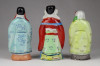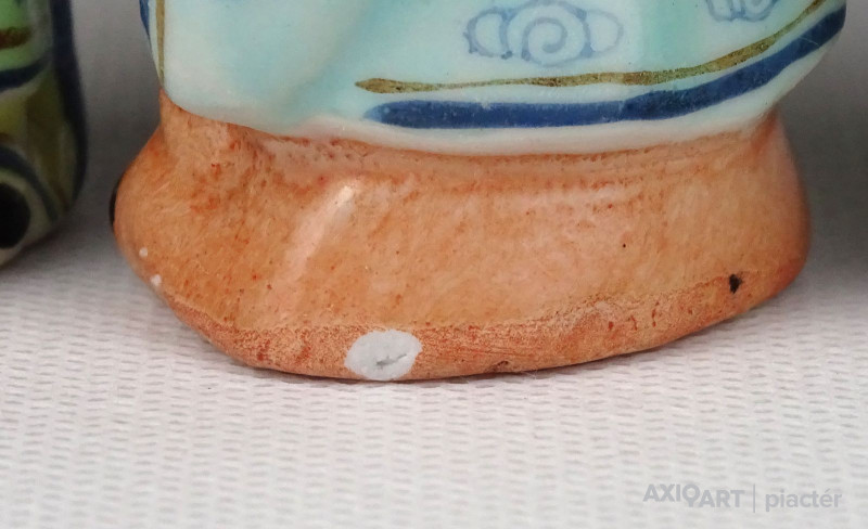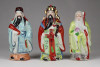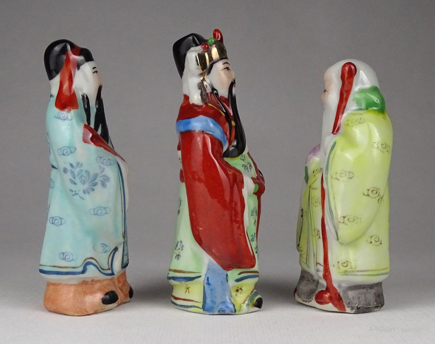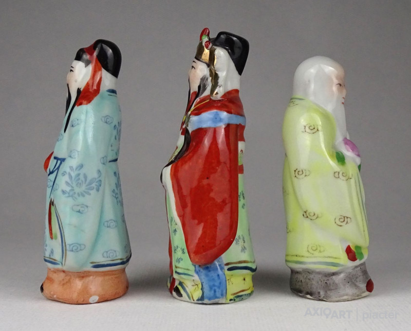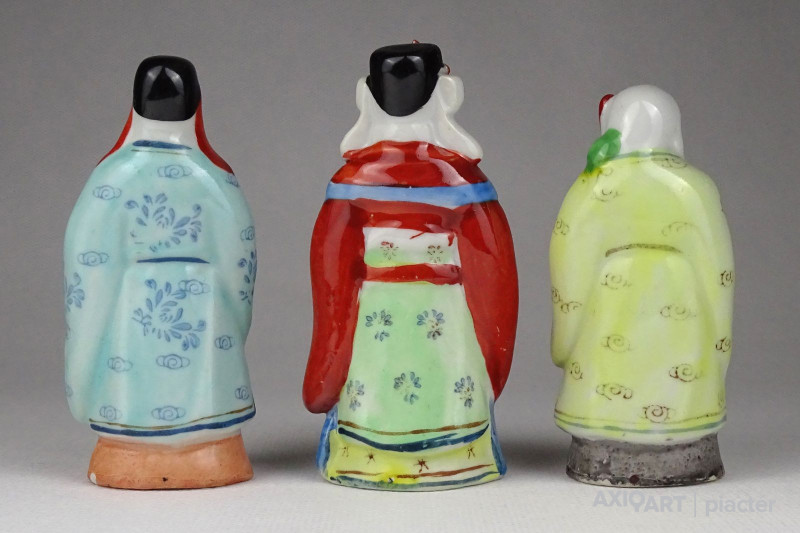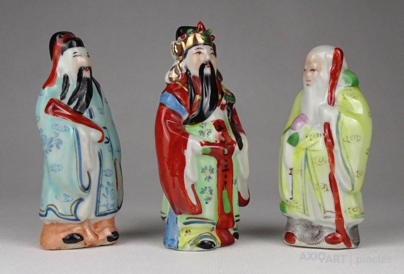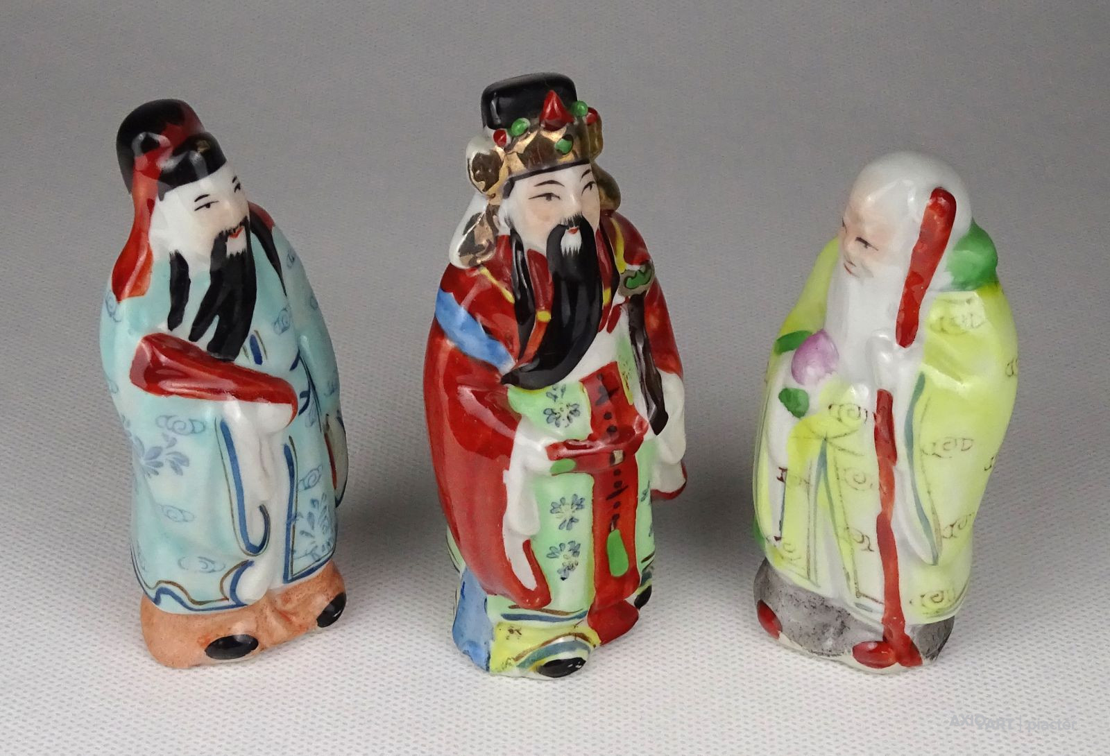 Jó állapotú a három keleti bölcset, (LUK - FUK - SAU) ábrázoló kézzel festett porcelán szobrok. Az egyik bölcs talpán picike lepattanás.