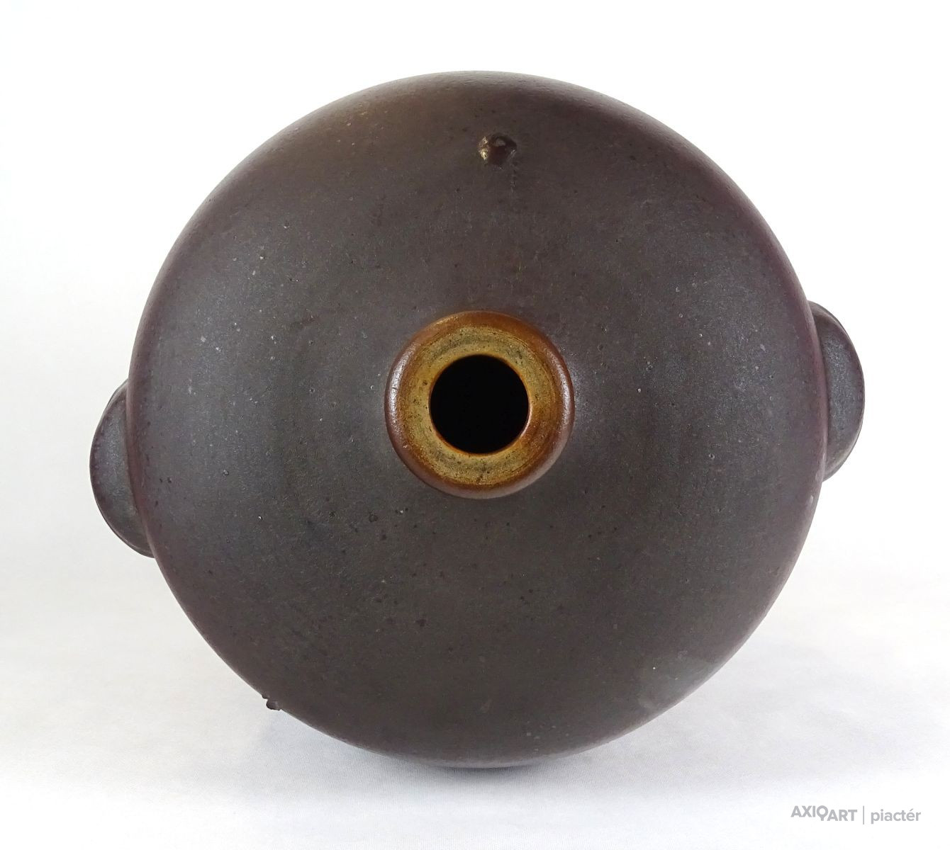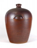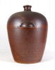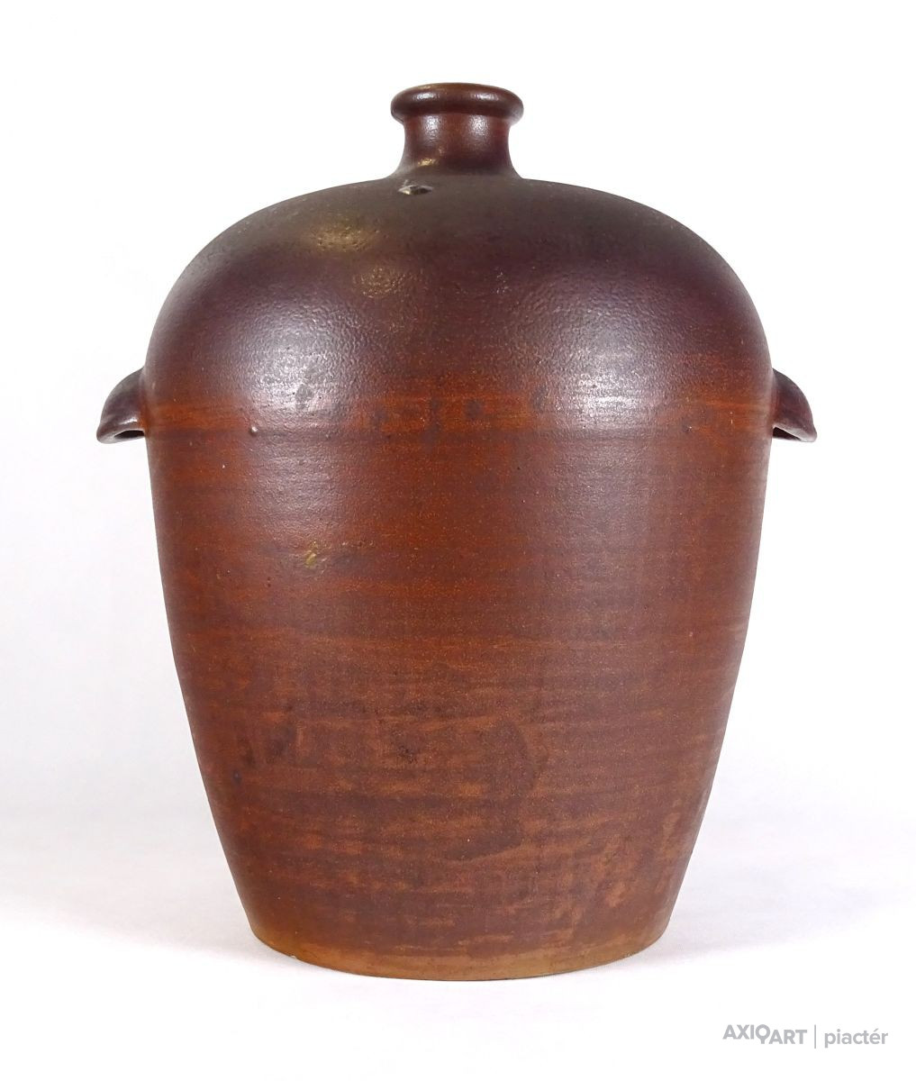 [1F535/BX-9] Nagy méretű, vastagfalú, szép állapotú, sötétbarna színű kőcserép tároló edény, ülepítő edény. Oldalán két hordozó füllel rendelkezik. Alján mélynyomással számok: 40 285 Magasság: 53 cm Szélesség: 47 cm
