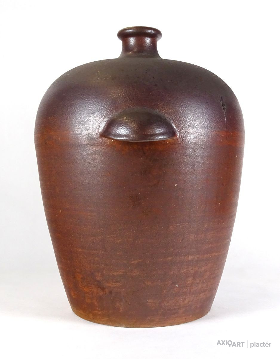 Nagy méretű, vastagfalú, szép állapotú, sötétbarna színű kőcserép tároló edény, ülepítő edény. Oldalán két hordozó füllel rendelkezik.