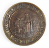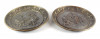 [1A540/X161] Gyönyörű, extra nagy méretű, különösen nagy súlyú, szépen kidolgozott bronz dísztál pár. Mindkét darab hasonlóan díszített, közepükben egy-egy régi, többalakos magyaros életkép látható. Egyik darabon egy alföldi bogrács körüli kép juhászokkal, másikon zenészek alakja látható. Falra akasztási lehetőséggel rendelkeznek. Kora az 1880-1900 körülire tehető. Szélesség: 40 cm Súly: 16.81 kg
