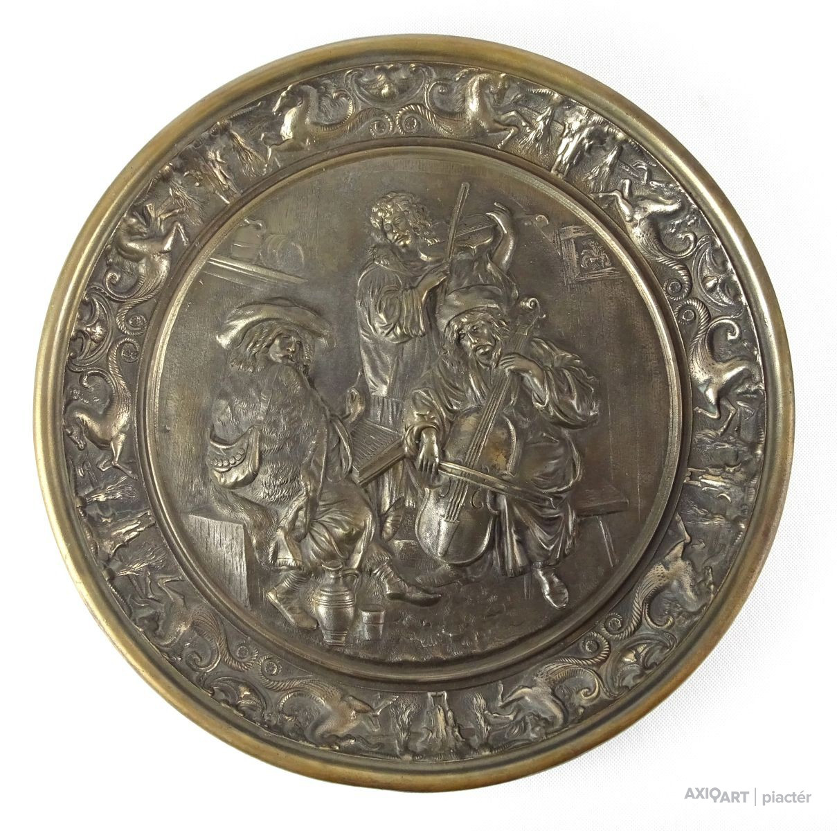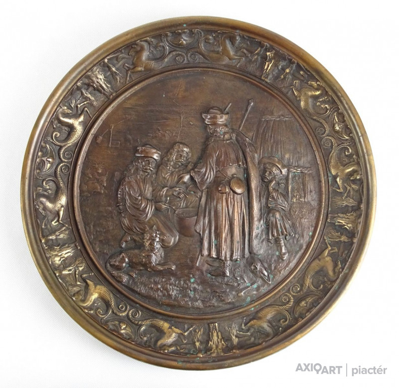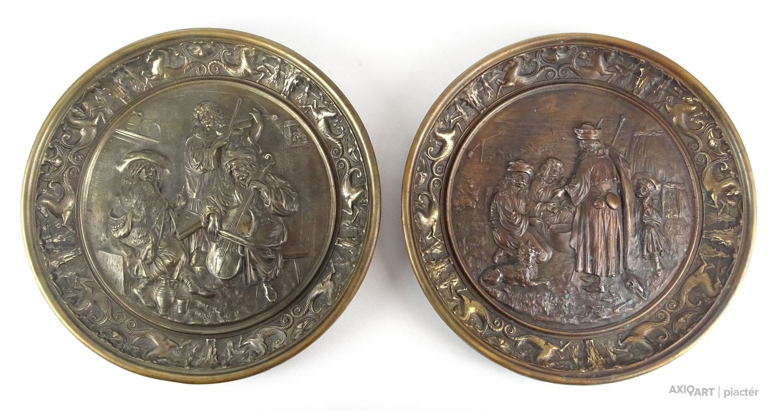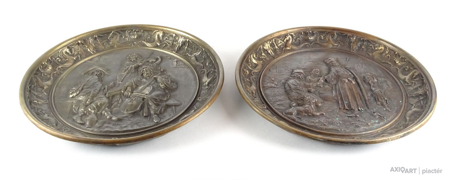 Gyönyörű, extra nagy méretű, különösen nagy súlyú, szépen kidolgozott bronz dísztál pár. Mindkét darab hasonlóan díszített, közepükben egy-egy régi, többalakos magyaros életkép látható. Egyik darabon egy alföldi bogrács körüli kép juhászokkal, másikon zenészek alakja látható. Falra akasztási lehetőséggel rendelkeznek. Kora az 1880-1900 körülire tehető.