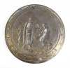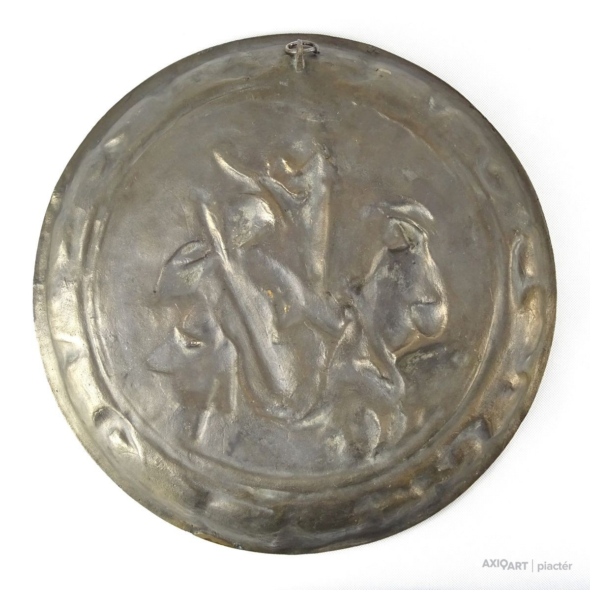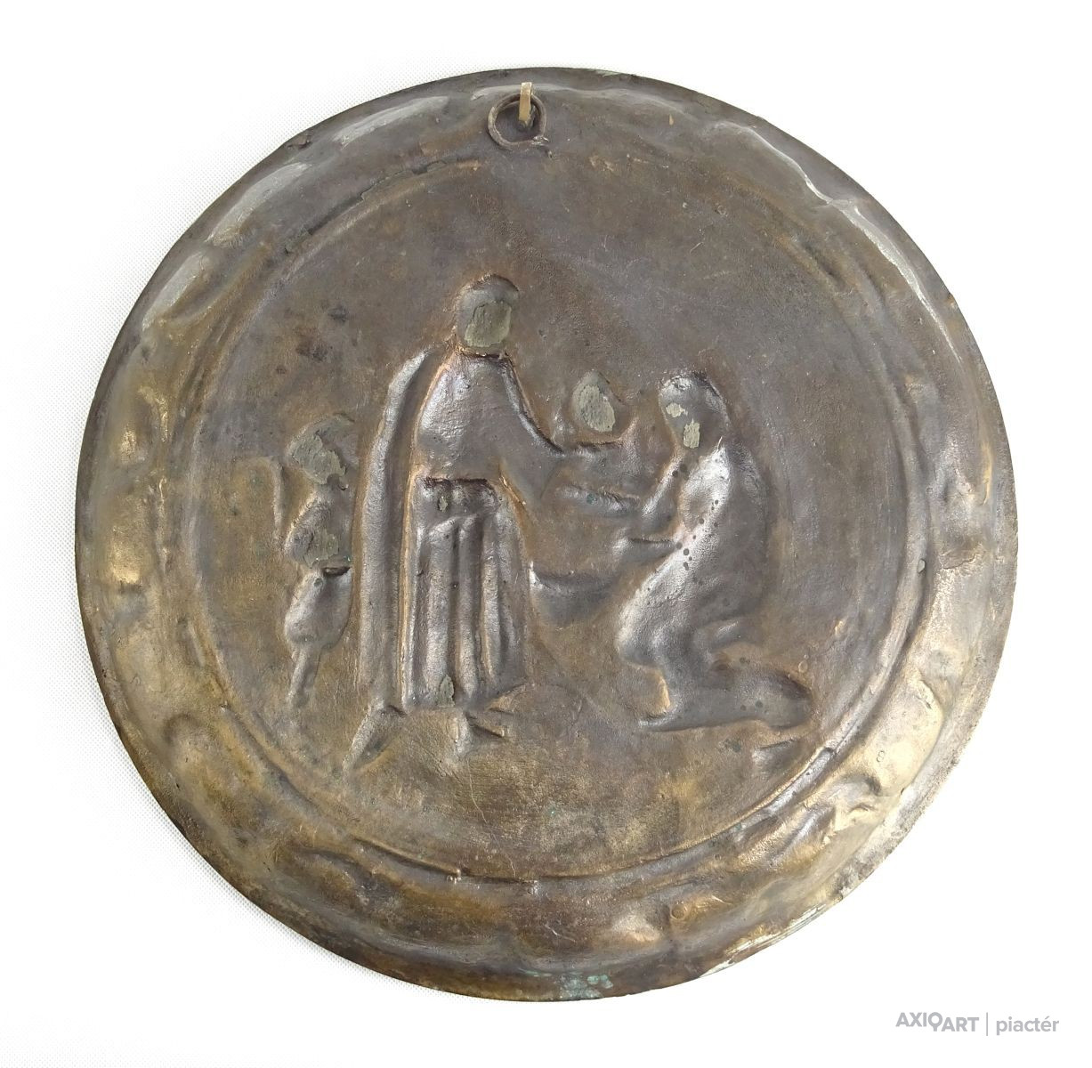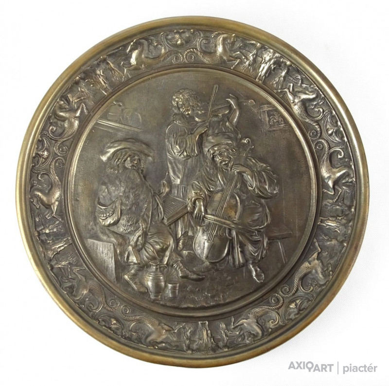 Gyönyörű, extra nagy méretű, különösen nagy súlyú, szépen kidolgozott bronz dísztál pár. Mindkét darab hasonlóan díszített, közepükben egy-egy régi, többalakos magyaros életkép látható. Egyik darabon egy alföldi bogrács körüli kép juhászokkal, másikon zenészek alakja látható. Falra akasztási lehetőséggel rendelkeznek. Kora az 1880-1900 körülire tehető.