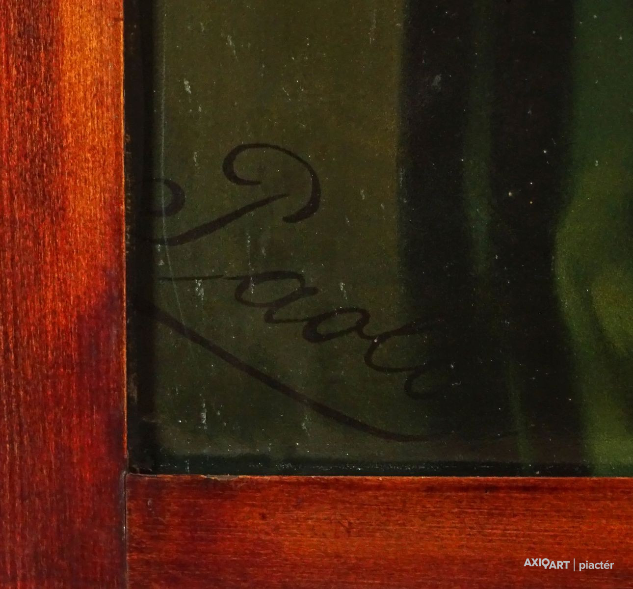 [1Y034/Z018] Olaj vászon festmény, üveglap mögött, szép állapotú képcsarnokos keretben. Akasztási lehetőséggel rendelkezik. Jelezve jobbra lent: Balog A. Hátoldalán a kereten Képcsarnok Vállalat címke töredék látható, rajta felirat: A művészeti alkotás címe: LEÁNY Magasság: 86 cm Szélesség: 66 cm Súly: 5.37 kg Balogh András (képei szignóján az 1960-as évektől Balog) (Budapest, 1919. március 14. — Budapest, 1992. március 18.) festőművész, kerttervező, művészeti szakíró, c. egyetemi tanár. Életpályája és munkássága Apai ágon a géresi Baloghok Szatmár megyéből a dél-erdélyi Alsó-Fehér megyébe származtak, anyai fölmenői a Székelyföldön: Csíkban, ill. Háromszéken éltek. Szülei az 1900-as évek elején költöztek Budapestre. A Képzőművészeti Főiskolán 1937-ben kezdte meg tanulmányait Burghardt Rezső tanítványaként. 1950-töl 1980-ig a Kertészeti Főiskolán (később Kertészeti Egyetem) tanított a kerttervezési tanszéken művészettörténetet, szabadkézi rajzot, ábrázoló geometriát és kertesztétikát. Az Iparművészeti Főiskolán óraadóként kertesztétikát adott elő. 1971-ben részt vett a firenzei Palazzo Strozziban rendezett biennálén, ahol aranyéremmel tüntették ki. Rendszeres önálló és csoportos kiállítások sora következett ezután nemcsak Magyarországon, hanem Olaszország és Németország számtalan városában, kiállított Finnországban, Kanadában is. Egyéni kiállításai gyakran katalógusokkal jelentek meg.[1][2][3] Nyaranként Tihanyban vagy Zsennyén alkotott. Festészetét poétikus realizmus jellemzi, dekoratív elrendezésű kompozíciói és lágy színvilága bensőséges hangulatot, szépséget, harmóniát árasztanak. (Lány egyszarvúval; Alvó, Emberpár és táj, stb.) Nagyon sok tájképet és portrét festett, történelmi személyiségekről is, 1978 és 1989 közt megfestette Mindszenty József bíboros portréját. Képei a Magyar Nemzeti Galériában, vidéki múzeumainkban, olasz, német, finn, észak-amerikai, kanadai, ausztráliai gyűjteményekben vannak.