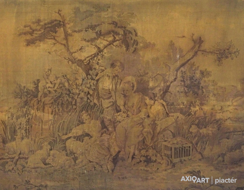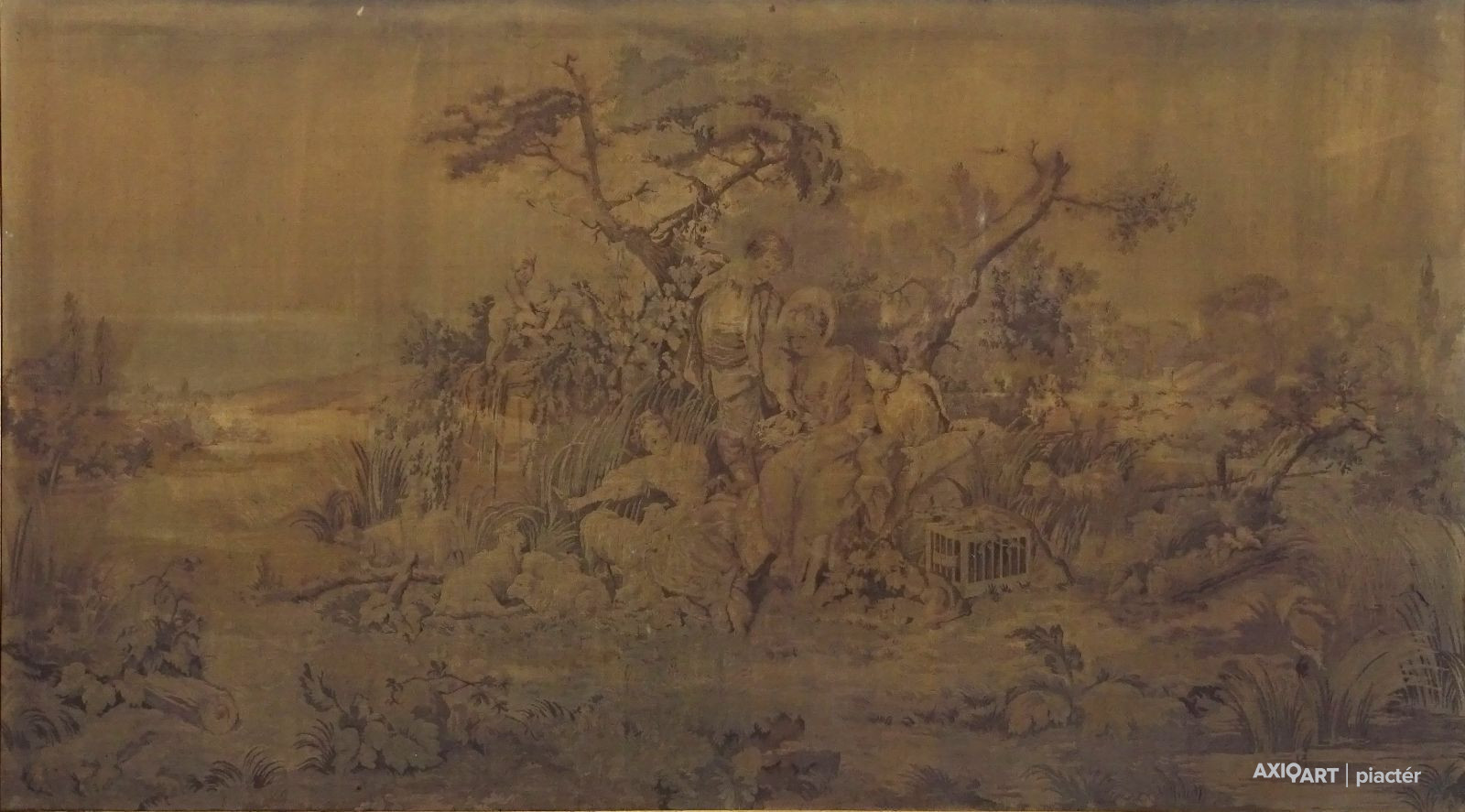Gyönyörű, hatalmas, szép állapotban megóvott, részletgazdag, romantikus madárröptető jelenetet ábrázoló többalakos rokokó gobelin, keretben. Akasztási lehetőségekkel rendelkezik.