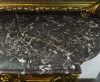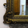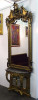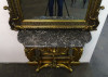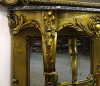 [1F414/BX-6] Gyönyörű antik, hatalmas méretű, hibátlan állapotú aranyozott tükör, alatta márványlapos konzolasztal. Tetején gyönyörű, részletes, gazdagon díszített nagy méretű ornamentika. A márványlap sérült, az alsó tükör vakfoltos, lásd fotó. Magasság: 290 cm