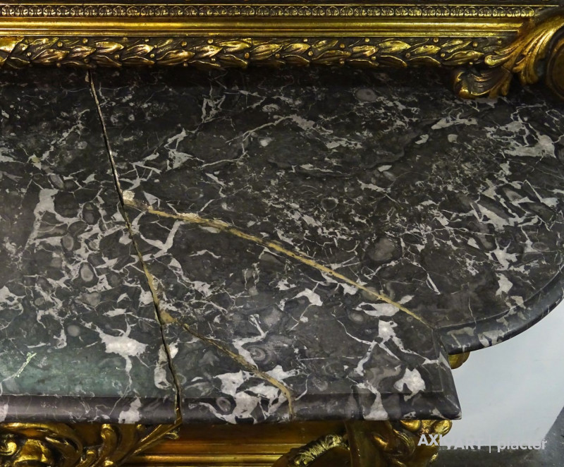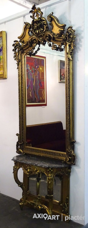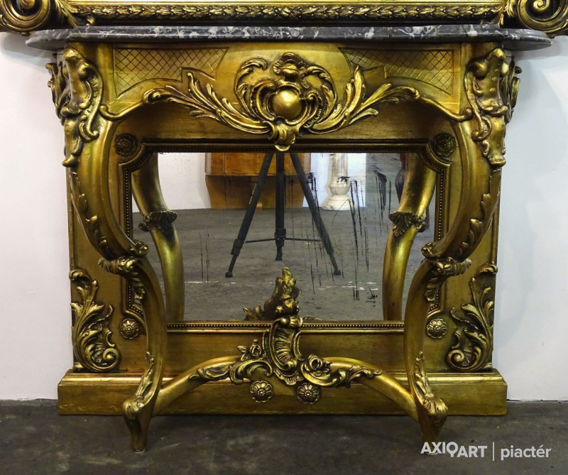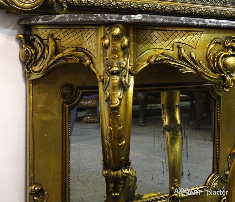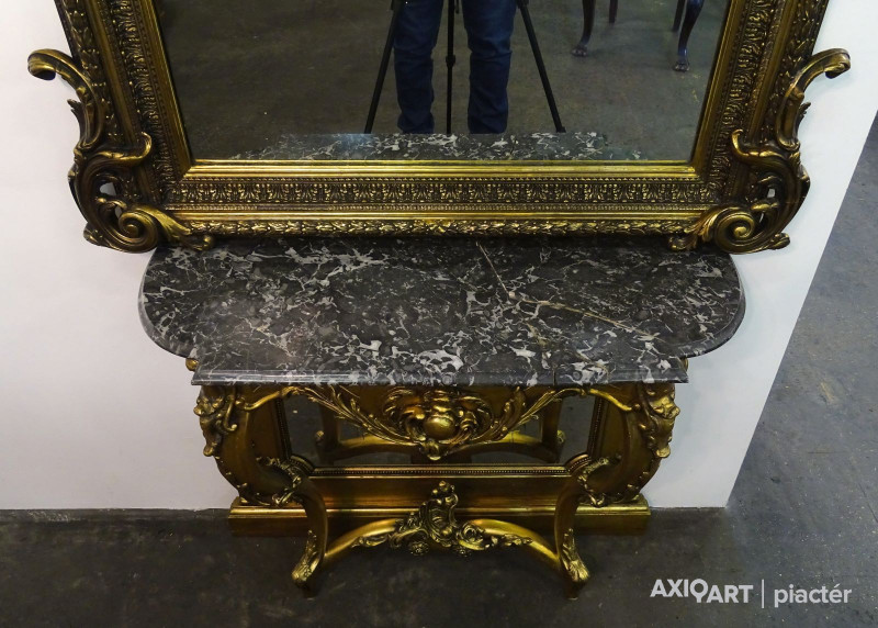Gyönyörű antik, hatalmas méretű, hibátlan állapotú aranyozott tükör, alatta márványlapos konzolasztal. Tetején gyönyörű, részletes, gazdagon díszített nagy méretű ornamentika. A márványlap sérült, az alsó tükör vakfoltos, lásd fotó.