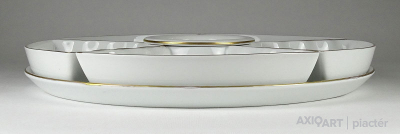 [1Q691/Z266] Hibátlan állapotú, kézi festésű Eton mintás Herendi porcelán kínáló tál, kivehető nassos tálkákkal. Aranyozása is kopásmentes, ajándékozható állapotban van. Magasság: 5 cm Szélesség: 37 cm Súly: 2.87 kg