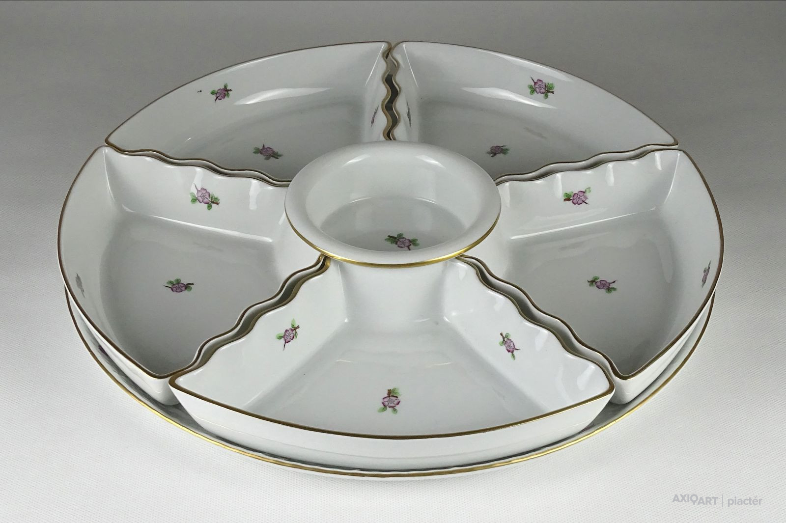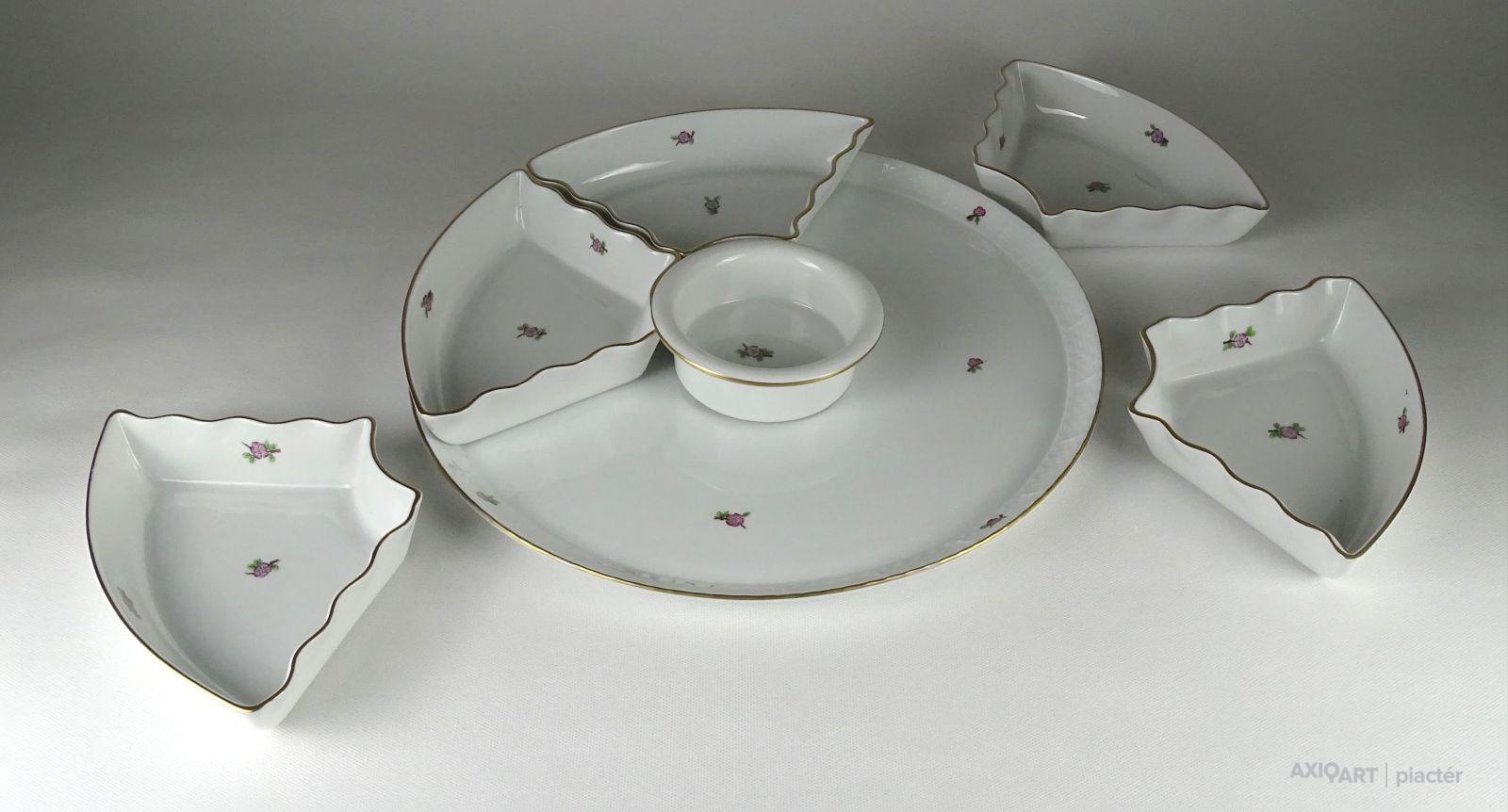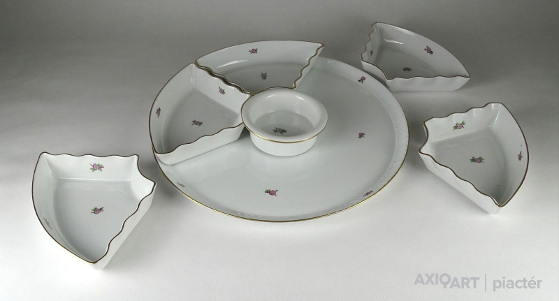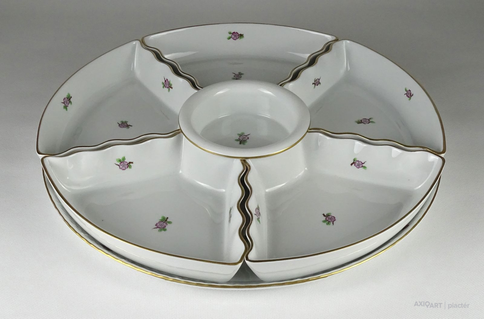 Hibátlan állapotú, kézi festésű Eton mintás Herendi porcelán kínáló tál, kivehető nassos tálkákkal.