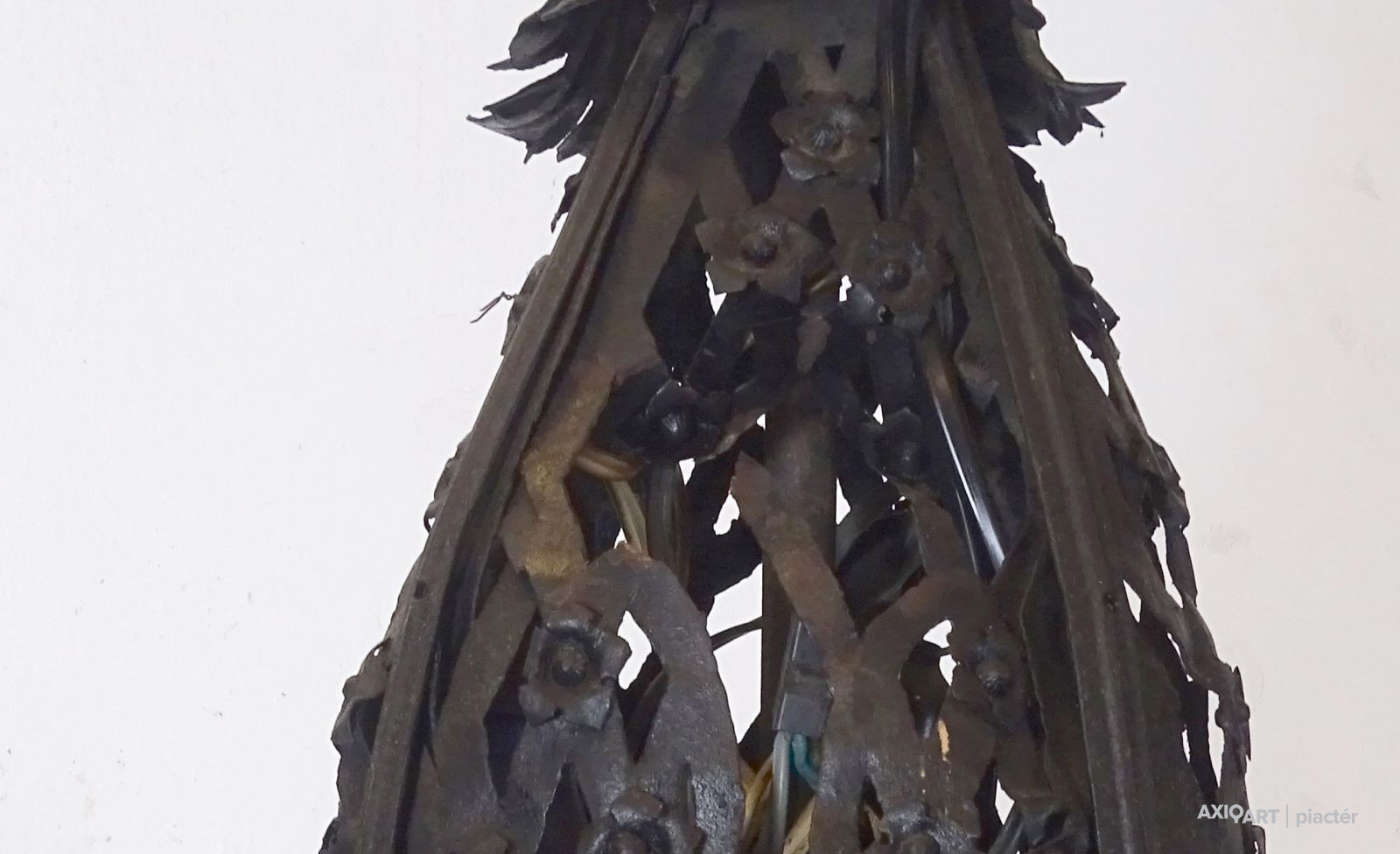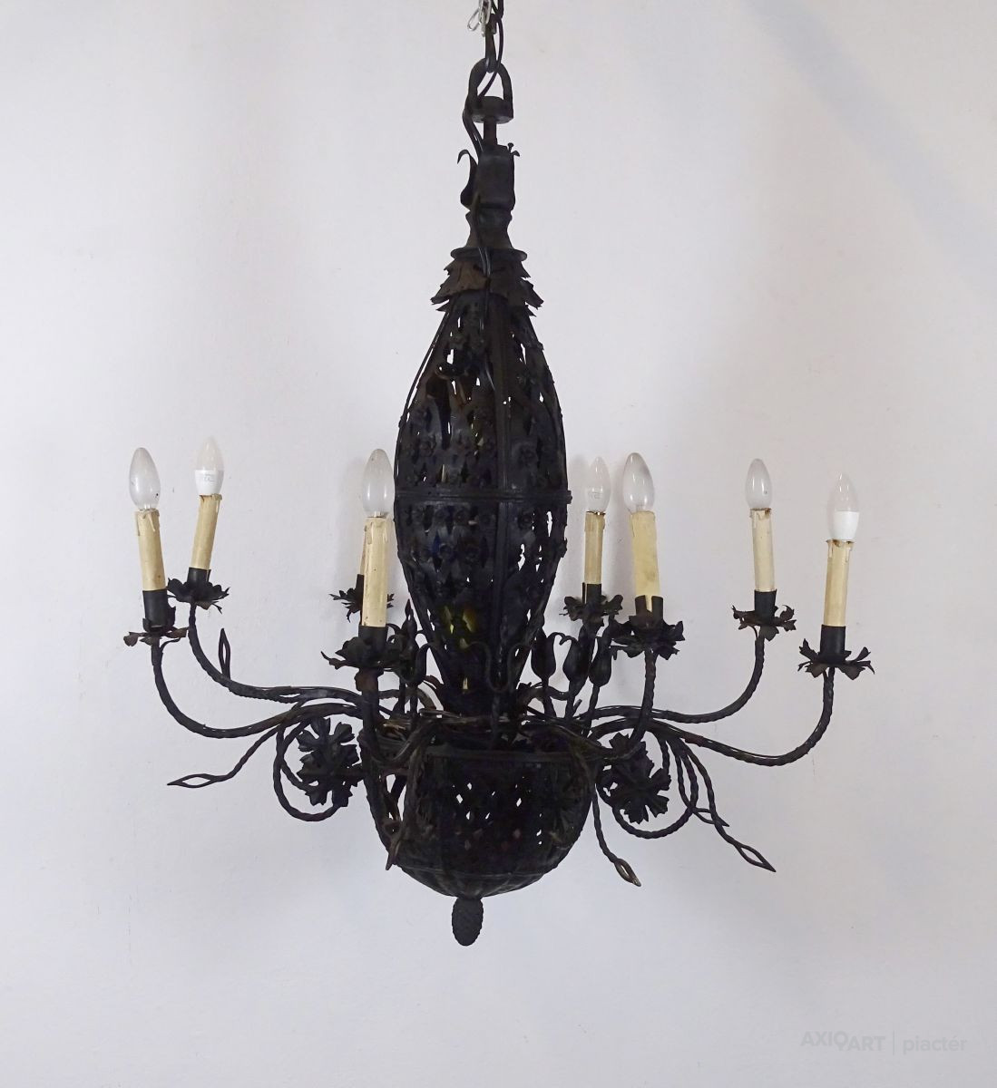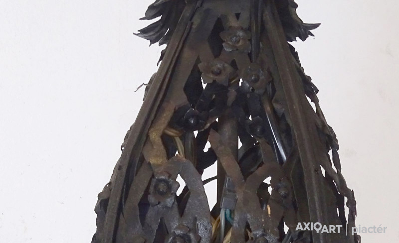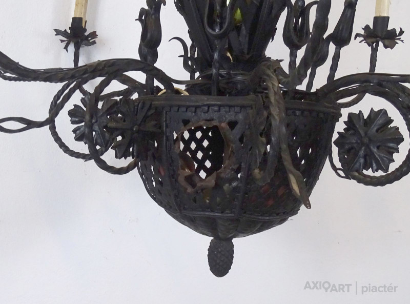 Régi nagy méretű különlegesen díszes, 8 égős, kovácsoltvas csillár. A karok papírmasé gyertyákban végződnek, kisméretű (E14) izzó való bele. A csillár testében egy-egy sérülésen keresztül színes izzók kerültek elhelyezésre.